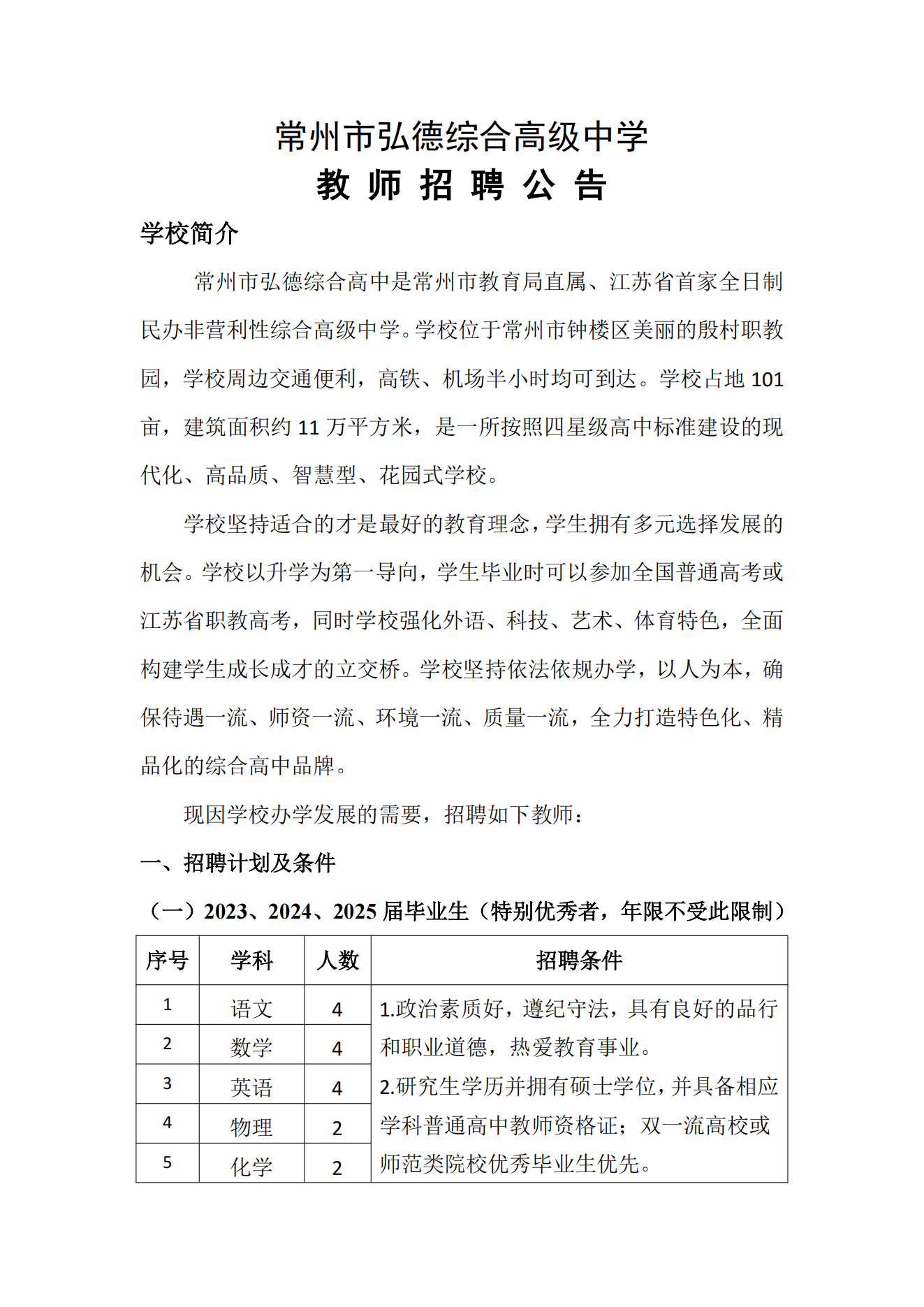 常州市弘德综合高级中学校园招聘