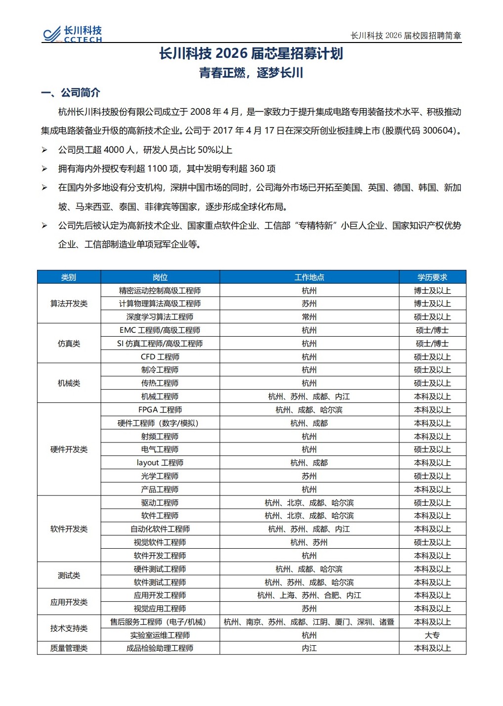 长川科技2026届芯星招募计划