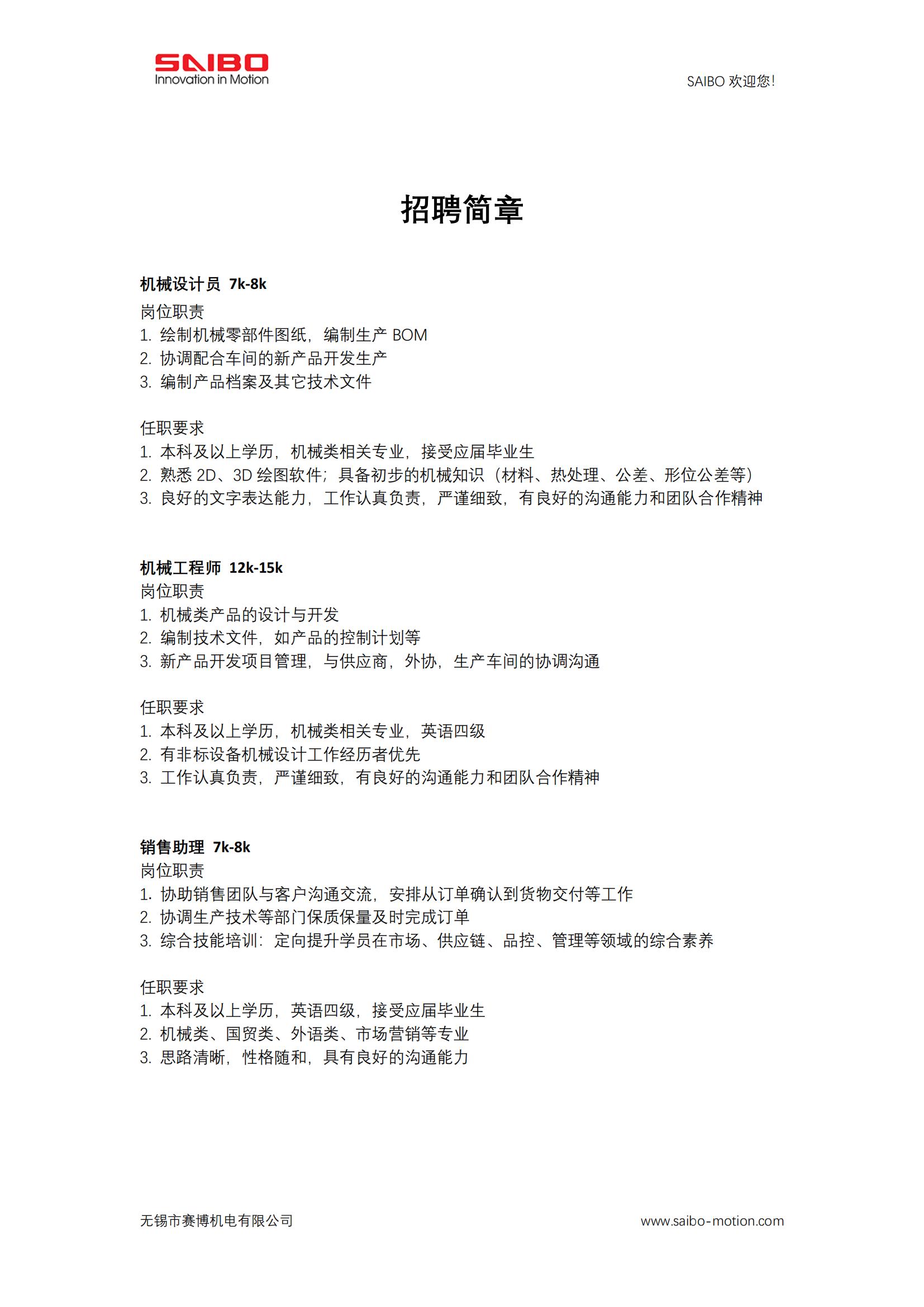 无锡市赛博机电有限公司招聘简章