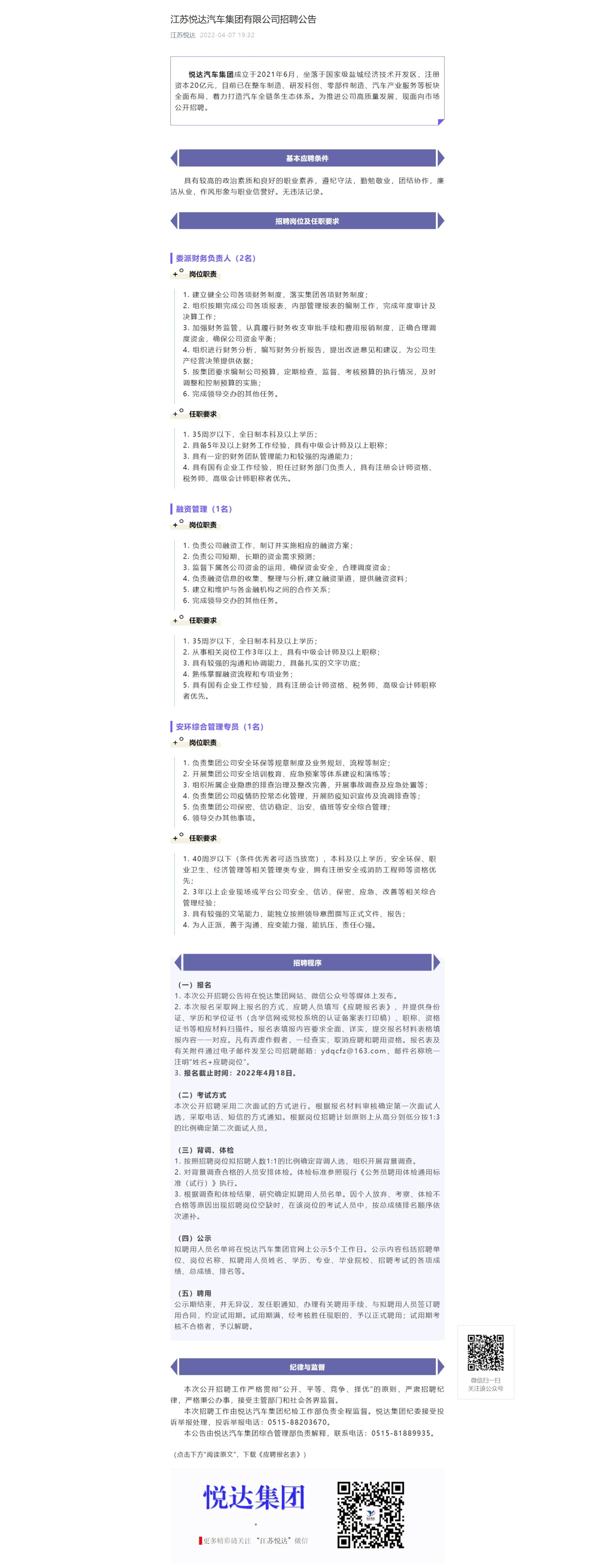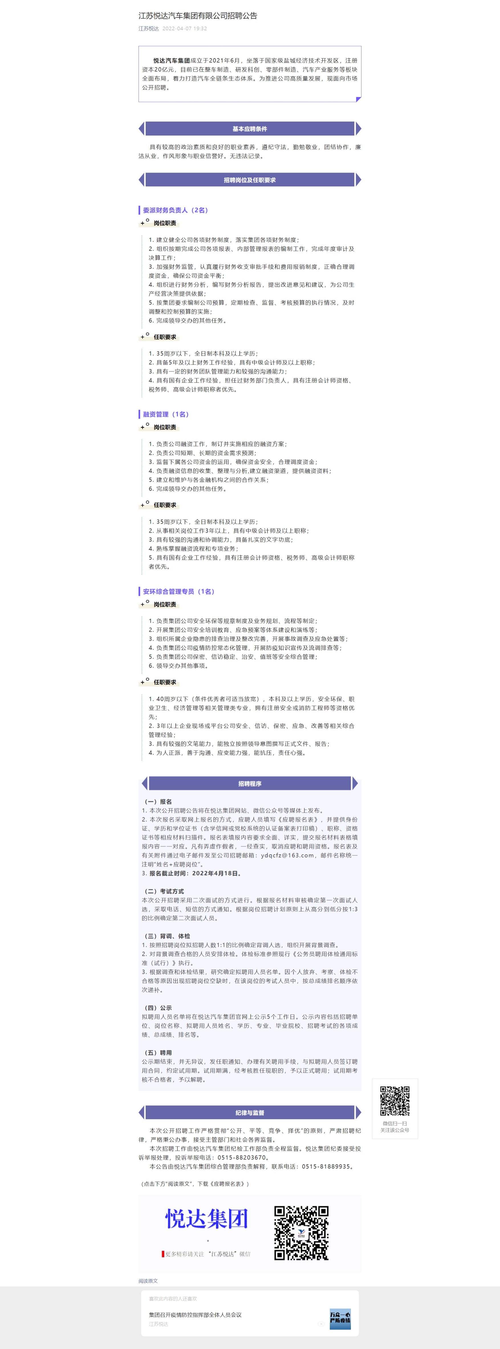 江苏悦达汽车集团有限公司招聘公告