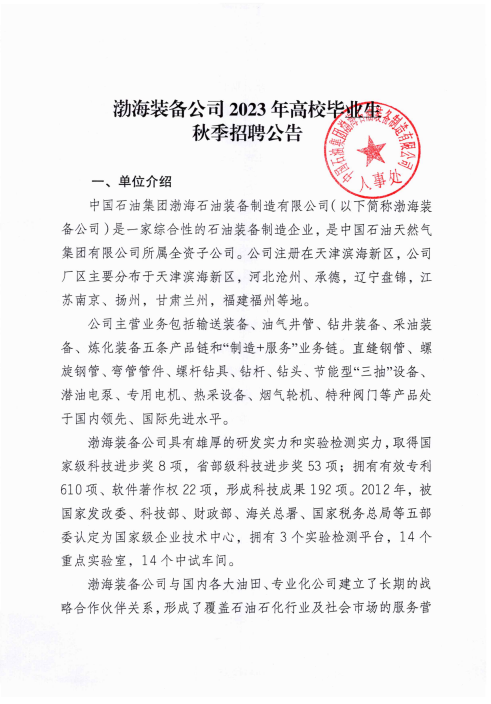 渤海装备公司2023年高校毕业生秋季招聘公告