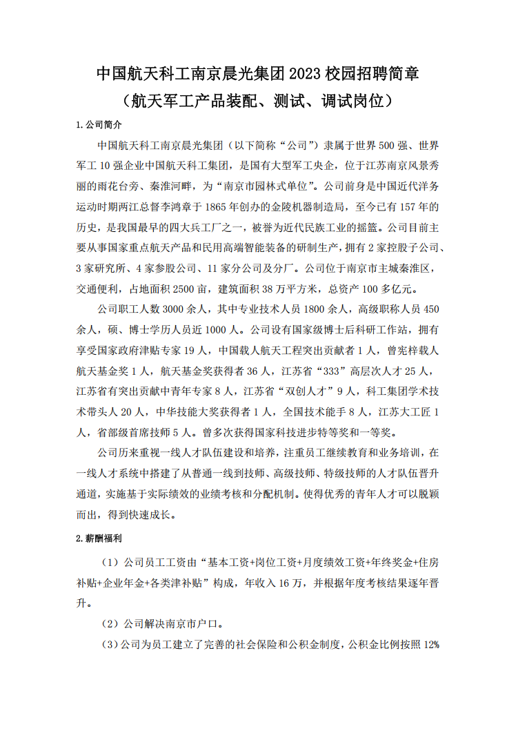 中国航天科工南京晨光集团2023校园招聘简章