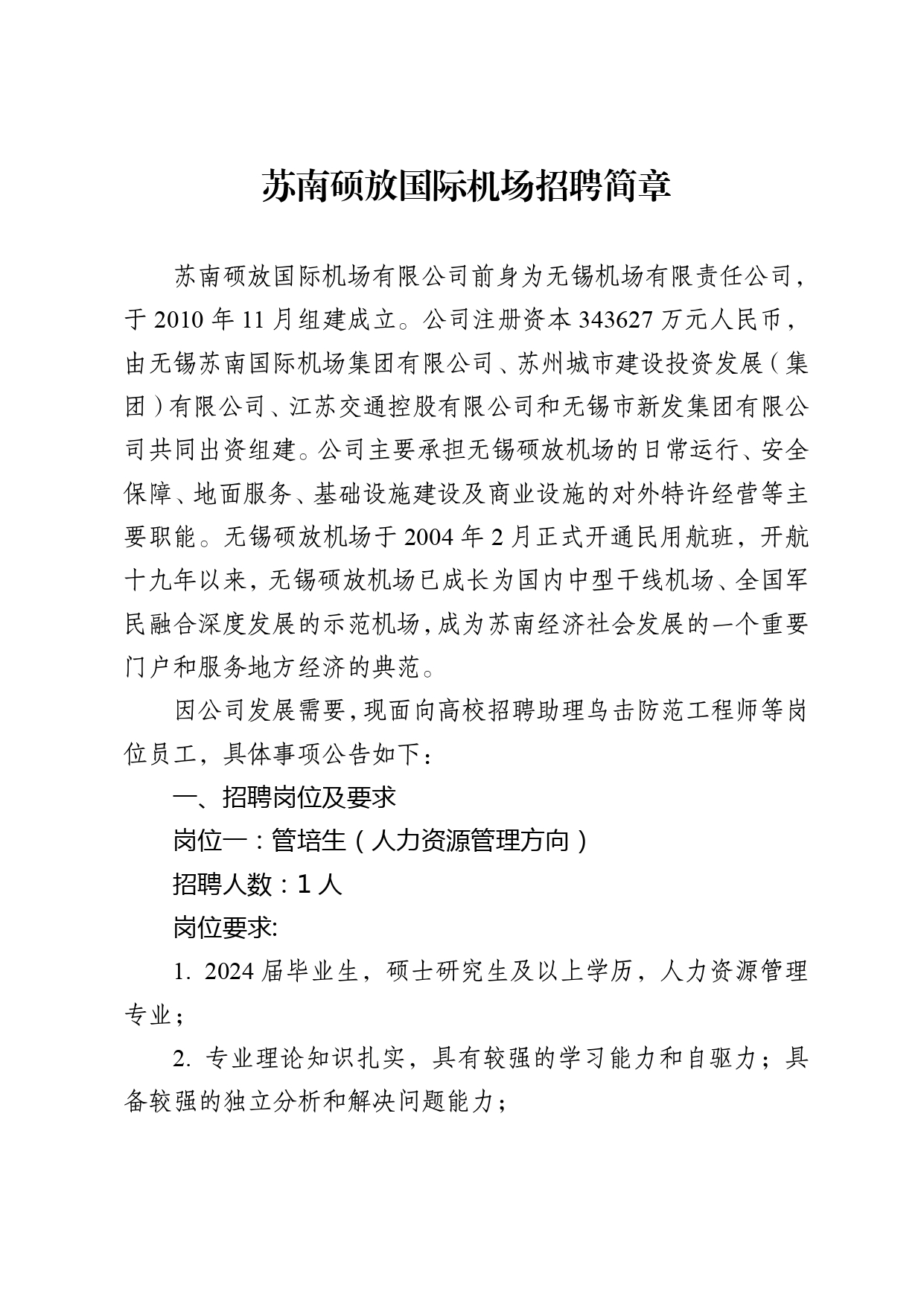 苏南硕放国际机场有限公司校园招聘
