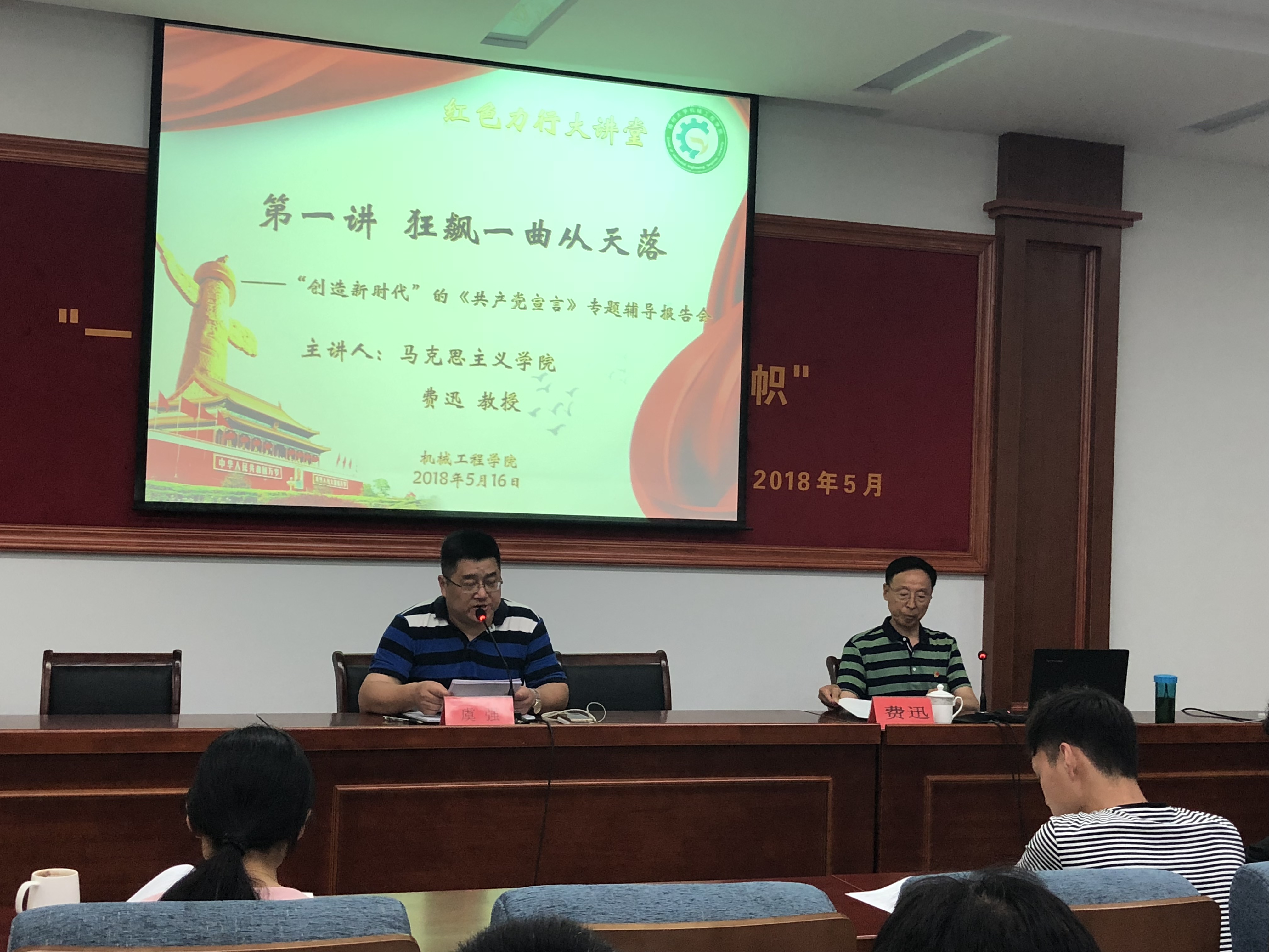 5月16日晚,我院在力行楼401报告厅举办了《共产党宣言》专题辅导报告会,本次报告会邀请到的主讲人是我校马克思主义学院的费迅教授。我院党委副书记虞强老师主持了本次报告,机械学院一百二十多名学生党员参加了此次报告会。 本次专题报告费迅教授所讲授的内容是“狂飙一曲从天降——‘创造新时代’的《共产党宣言》”。根据费教授介绍,标题的“狂飙一曲从天降”,是他联想到马克思恩格斯创作《共产党宣言》时的历史情境,遂将毛主席诗词《蝶恋花·从汀州向长沙》中的“国际悲歌歌一曲,狂飙为我从天落”一句化用而成。 报告中,费迅教授从《共产党宣言》的写作和发表;《共产党宣言》的理论内容;《共产党宣言》的七篇序言;《共产党宣言》与中国革命以及《共产党宣言》的当代价值这五个层面由浅入深地阐述了这篇伟大著作的深刻内涵。报告中,费教授旁征博引,不时互动,他诙谐幽默而又深刻入理的言语赢得在座党员的阵阵掌声,报告会的气氛异常热烈。 最后,虞书记总结道,费教授的报告启示深刻,《共产党宣言》作为共产党人的纲领性文件,在当代仍具有深刻价值并不断发展。我们要深入学习《共产党宣言》的精神,树立起坚定的信念,将个人理想追求融入到时代进程中去,坚定不移走中国化的马克思主义道路。