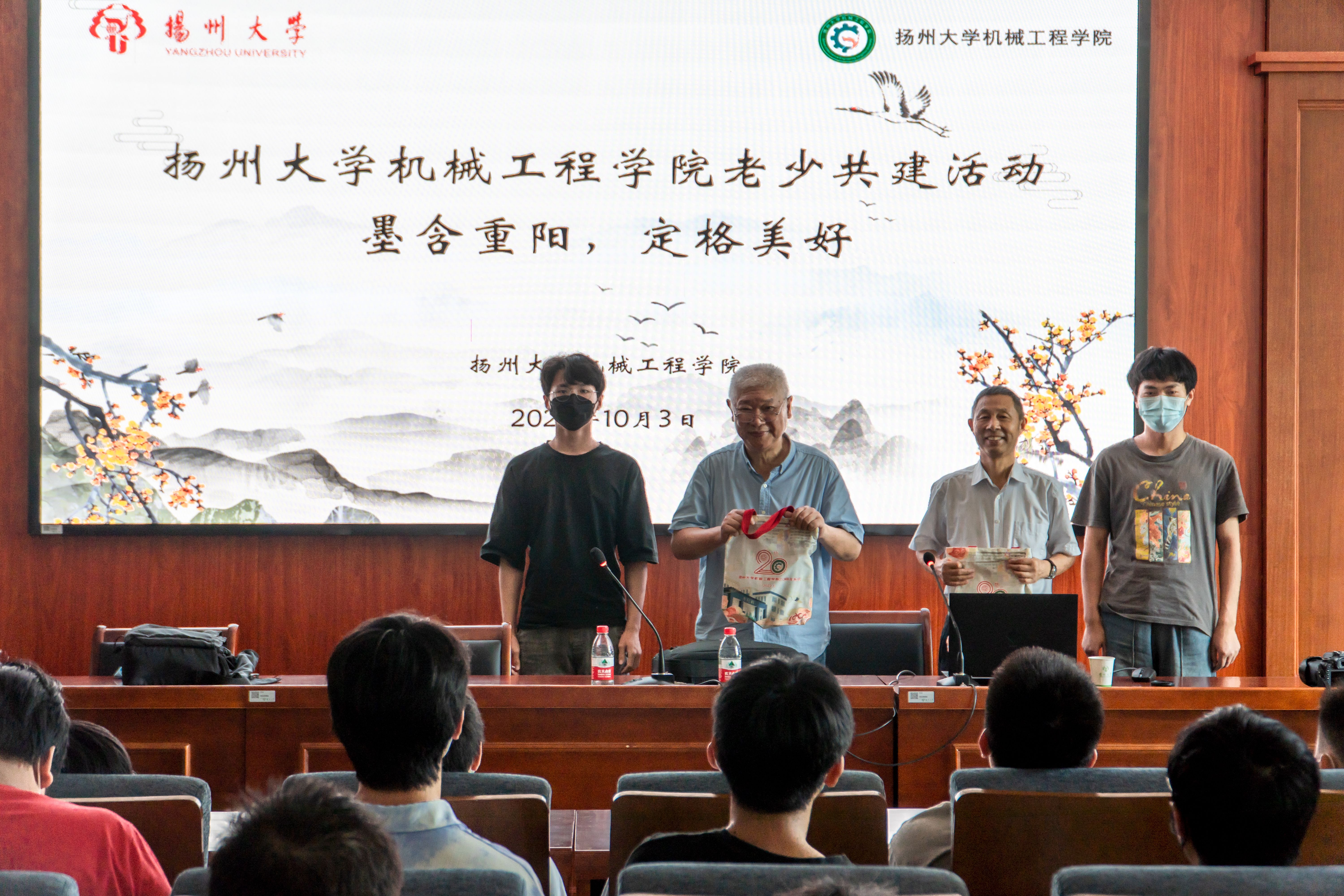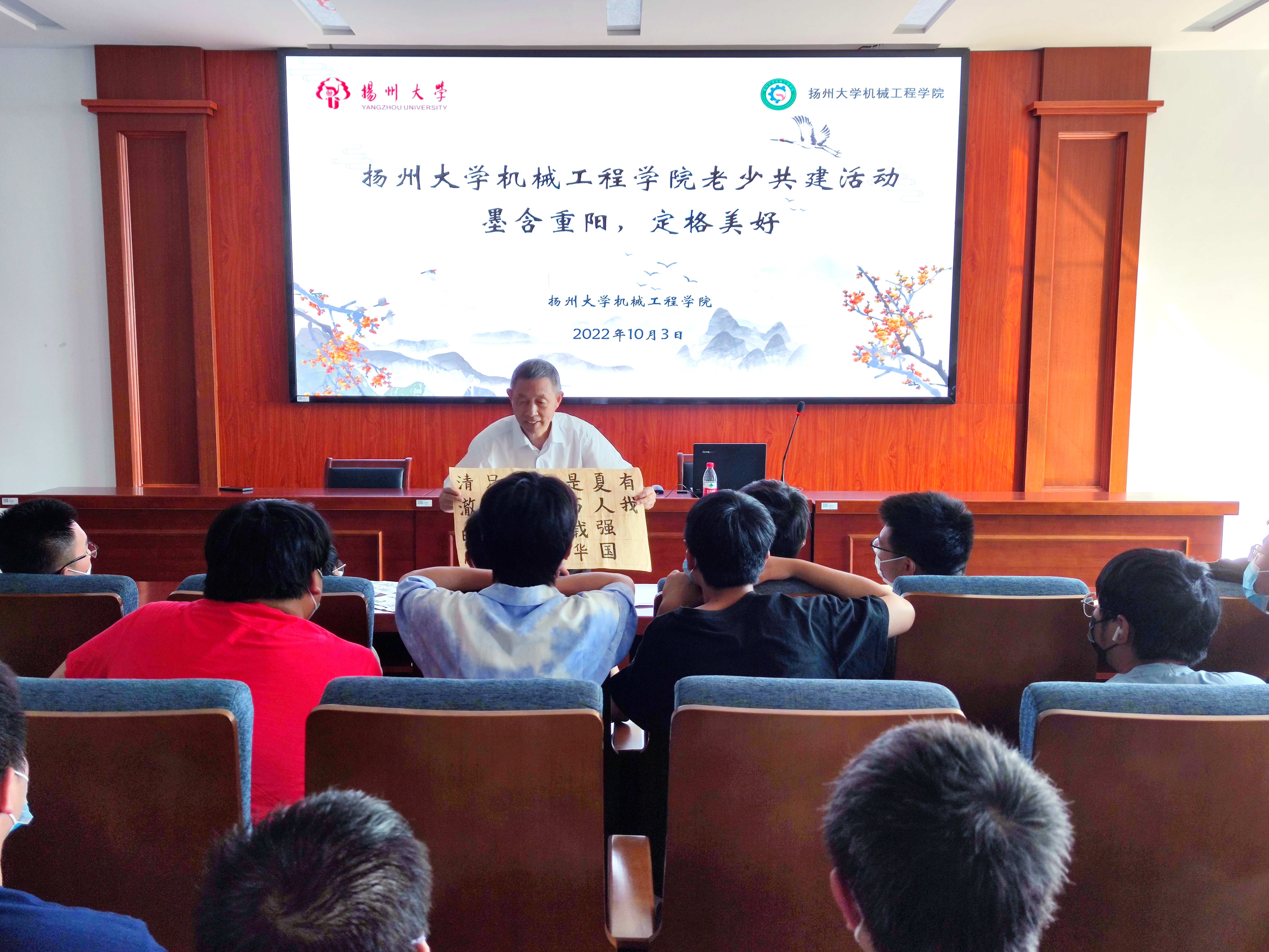 10月3日,我院于力行楼401报告厅开展“墨含重阳,定格美好”共建班级重阳节活动。学院邀请江阳路北校区离退休第一党支部书记、校心理健康专家李传伟老师和江阳路北校区总支退休老党员陈伟老师进行讲座,院团委书记徐香翠主持讲座,院团委副书记汪志国、共建班级机械2103班及其他班级学生代表参加活动。