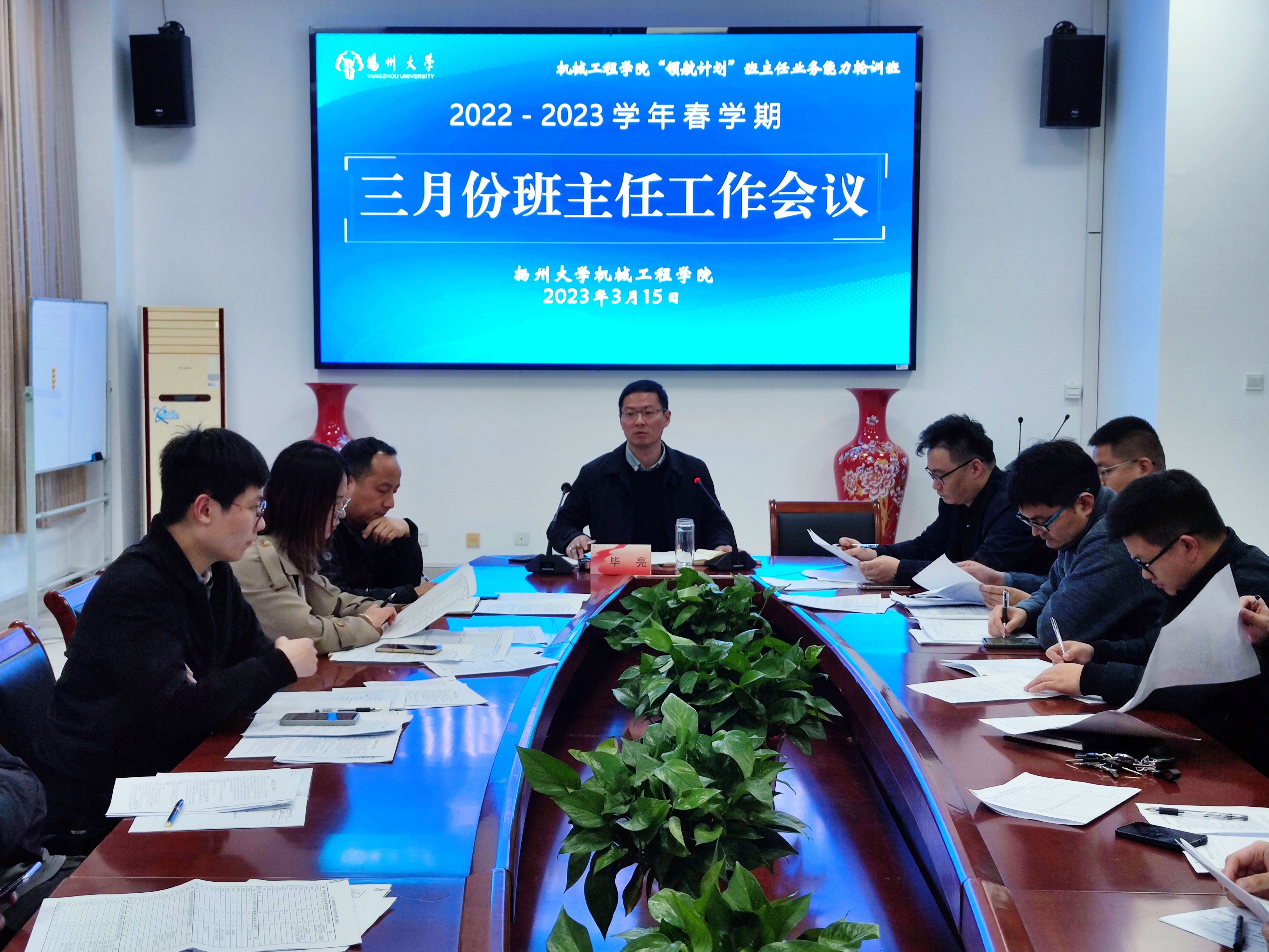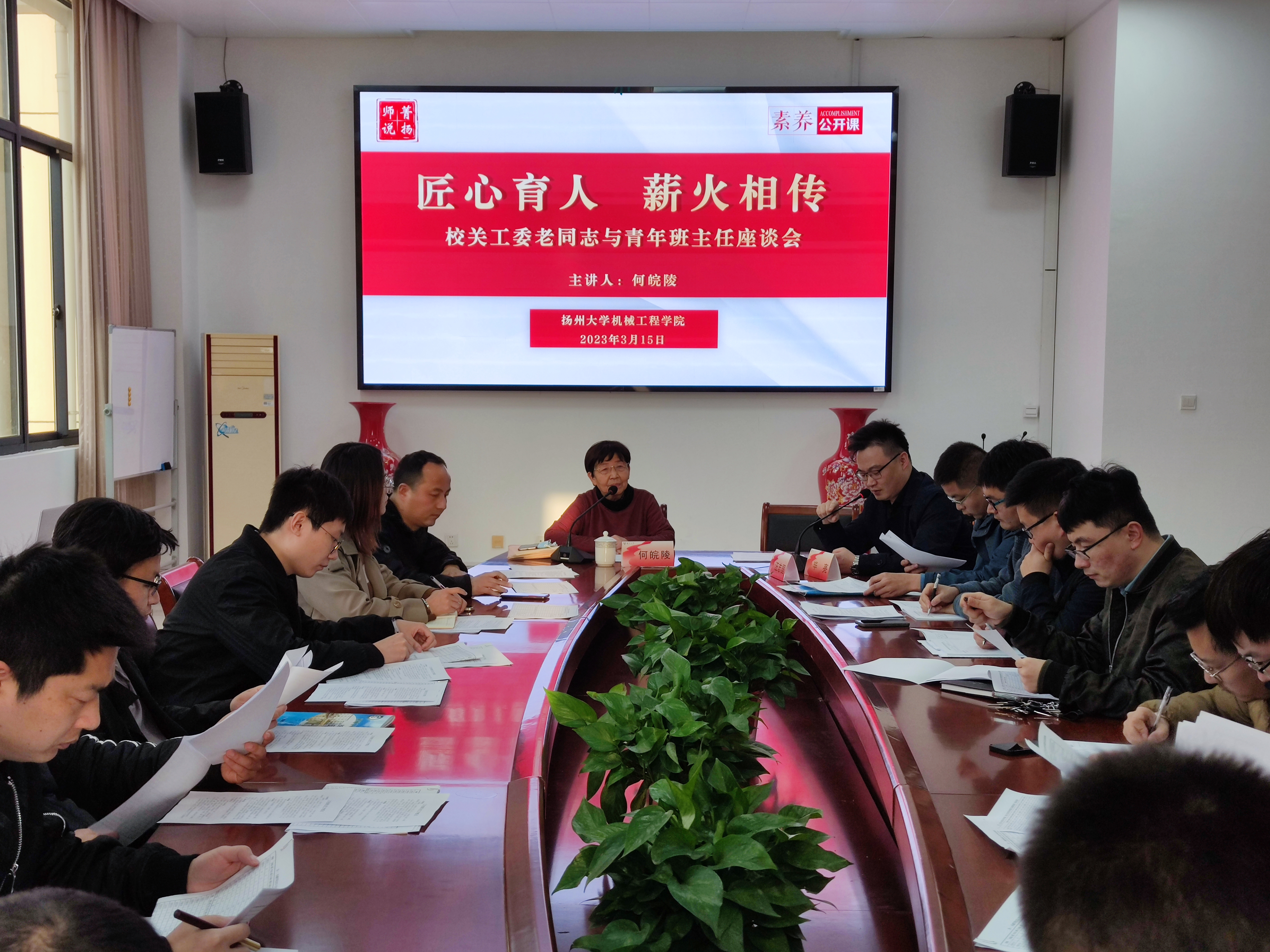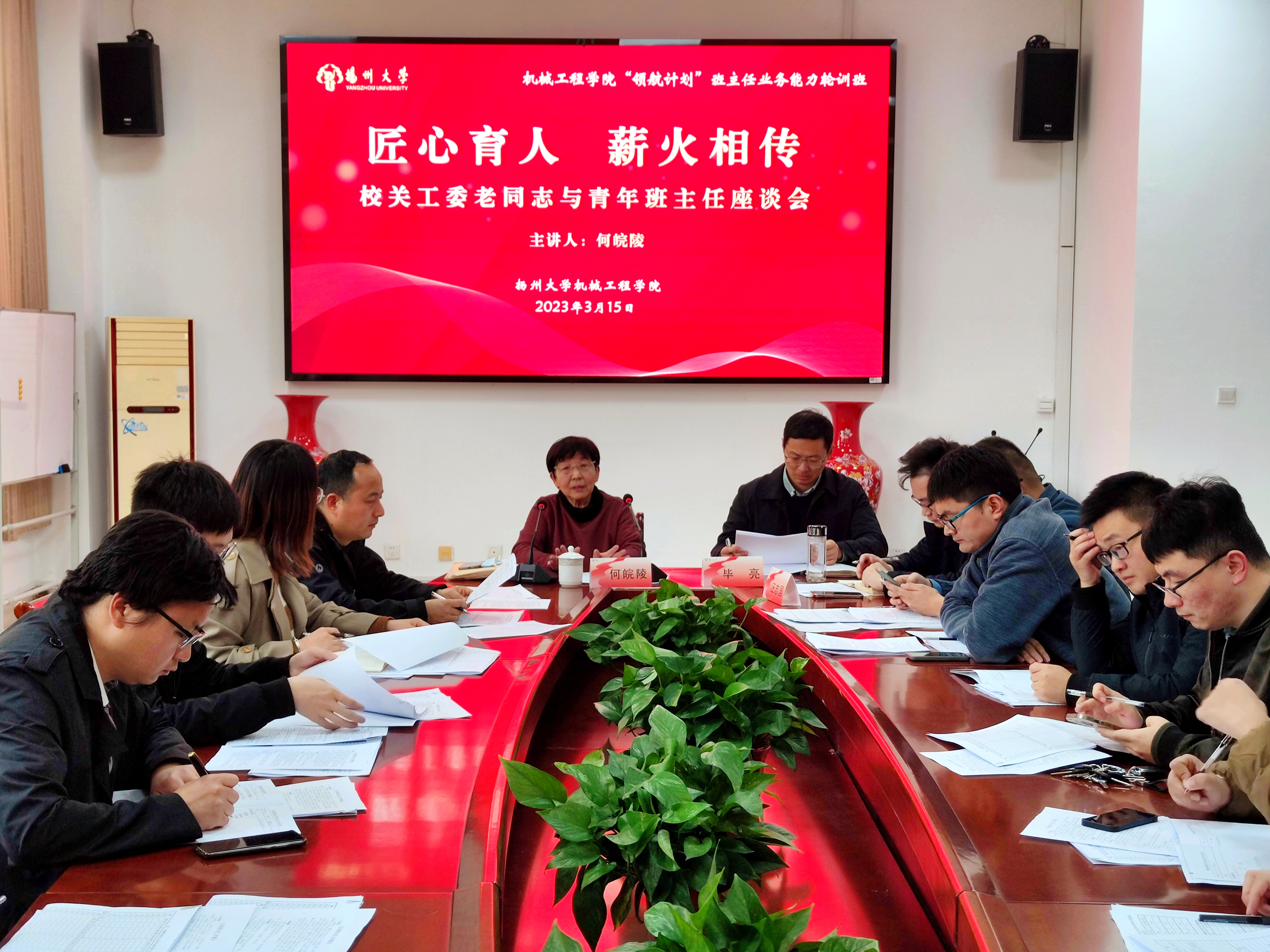 3月16日下午,我院于力行楼s318会议室召开“匠心育人,薪火相传”校关工委老同志与青年班主任座谈会暨2022-2023学年春学期三月份班主任工作例会。江阳路北校区离退休老同志、原共建班级机械1502班结对老师何皖陵,院党委副书记毕亮,团委副书记汪志国,学院全体辅导员和辅导员参加会议。会议由汪志国老师主持。