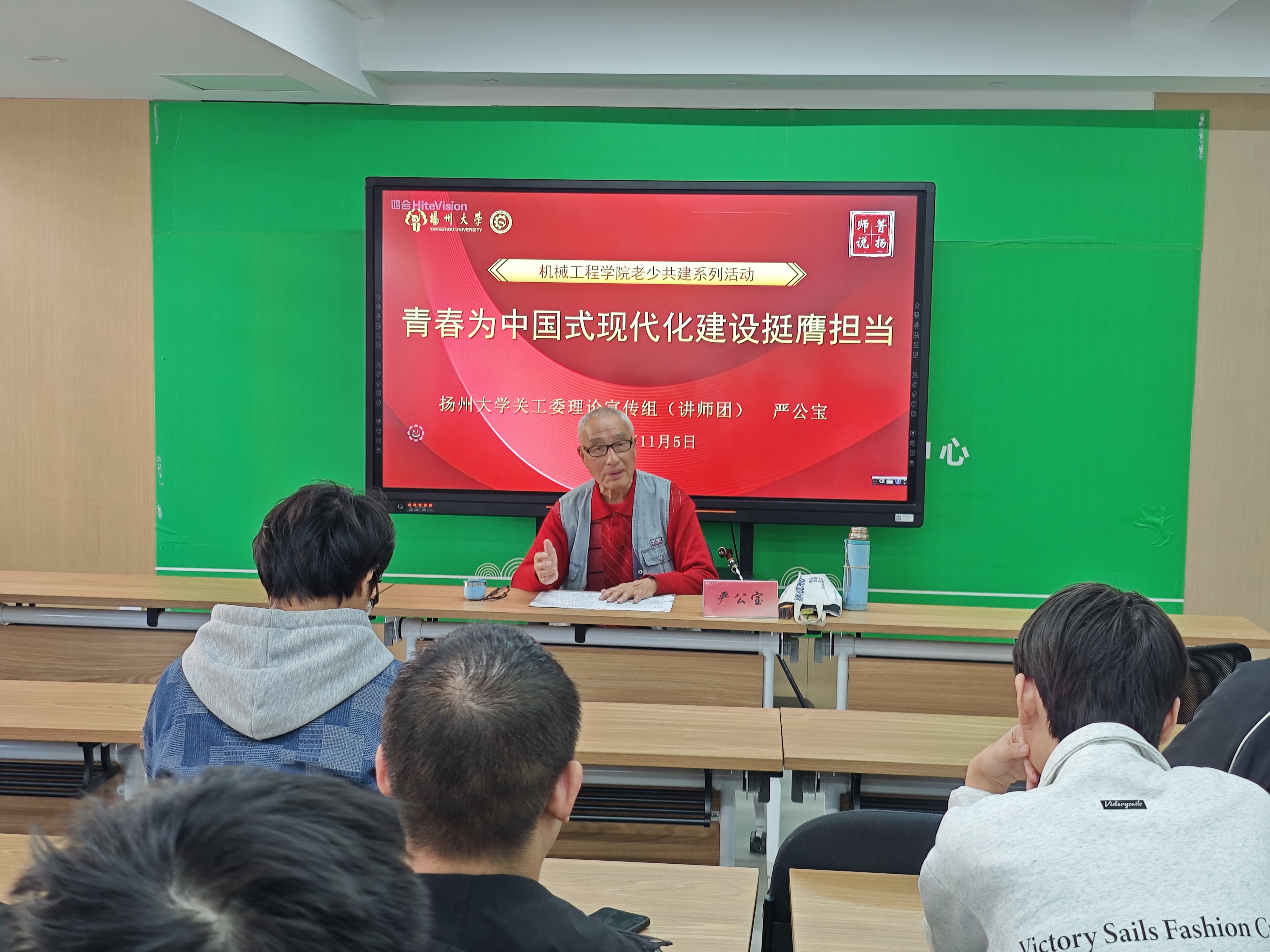 11月5日下午,我院在扬子津一站式服务社区多功能厅,面向共建班级学生开展老少共建系列活动。在本次活动中,江阳路北校区离退休第一党支部委员、结对共建老同志、机械2103班兼职班主任张卫宇老师邀请校关工委理论宣讲组成员严公宝教授,开展了“青春为中国式现代化建设挺膺担当”专题讲座。学院关工委执行秘书、机械2103班全体同学参与活动,张卫宇老师主持活动。