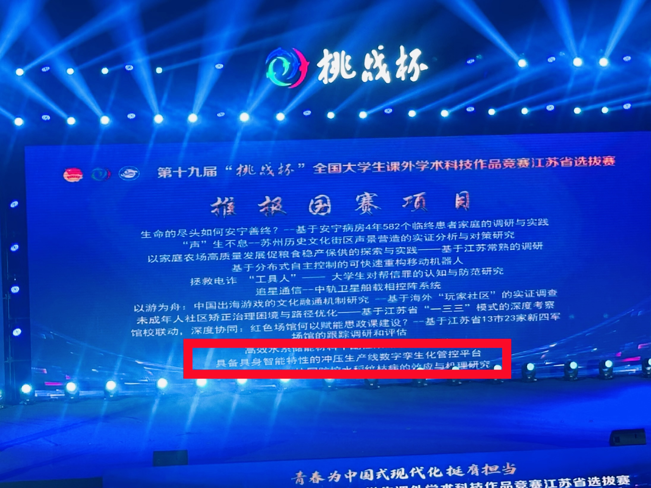 6月7日至9日,第十九届“挑战杯”全国大学生课外学术科技作品竞赛江苏省选拔赛终审决赛在南京信息工程大学举行。经过层层选拔,我校共有九个项目入围终审决赛。学院1个项目《具备具身智能特性的冲压生产线数字孪生化管控平台》(指导老师:丁建宁 张超 聂庆玮)荣获第十九届“挑战杯”江苏省选拔赛决赛特等奖,直通国赛。