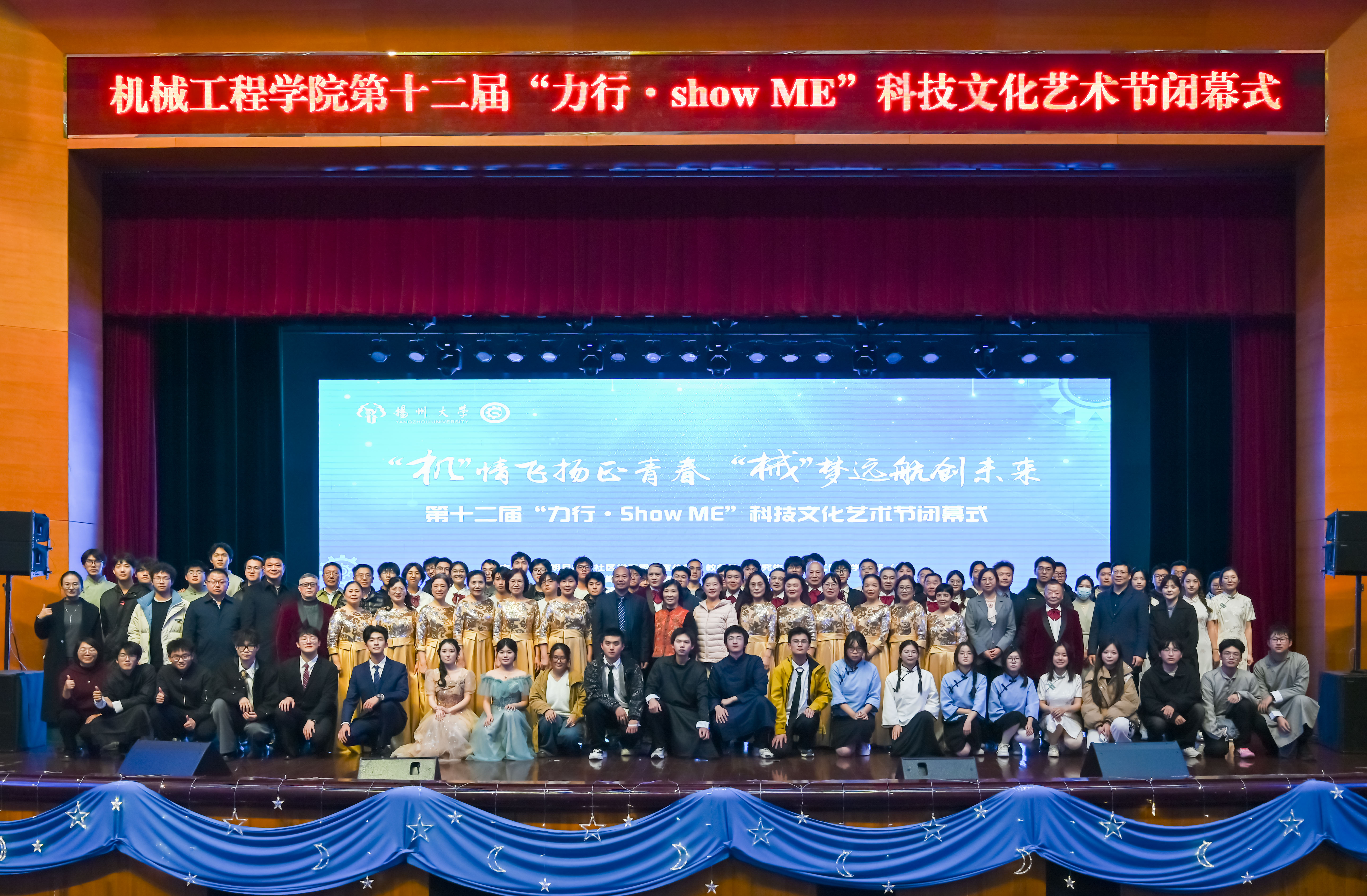 12月11日下午,我院在文体馆三楼小剧场举办了第十二届“力行·Show ME”科技文化艺术节闭幕式。莅临本次活动的领导和嘉宾有:扬州大学校长刘巧泉老师,江苏悦达起亚汽车有限公司党委书记、副总经理王丽萍女士,江苏悦达起亚汽车有限公司人事部部长王红旗先生,江苏悦达起亚汽车有限公司东区事业部江苏TFT长王飞先生,江苏悦达起亚汽车有限公司人事部经理崔勇吉先生,五亭桥缸套有限公司质量总监许伟先生,江苏迈能高科技有限公司人力资源总监李爱梅女士,扬州保来得科技实业有限公司综合管理部总监包四平先生,扬州欣恒泰环境科技有限公司总经理张后亮先生,安德集团有限公司行政中心总经理陈玉平先生,校党委常委、宣传部部长张信华老师,校长办公室主任周保垒老师,校教务处处长钱莉老师,校党委研究生工作部部长郑刚老师,校招生就业处处长陈轶群老师,校朗月学生社区党工委副书记、关工委办公室主任、秘书长刘汉柏老师,校团委书记毕亮老师,校党委保卫部副部长、保卫处副处长、人民武装部副部长高延安老师,校对外联络办公室副主任王秋林老师,出席活动的嘉宾还有:我院全体院领导、各系部主任、班主任、辅导员和师生代表