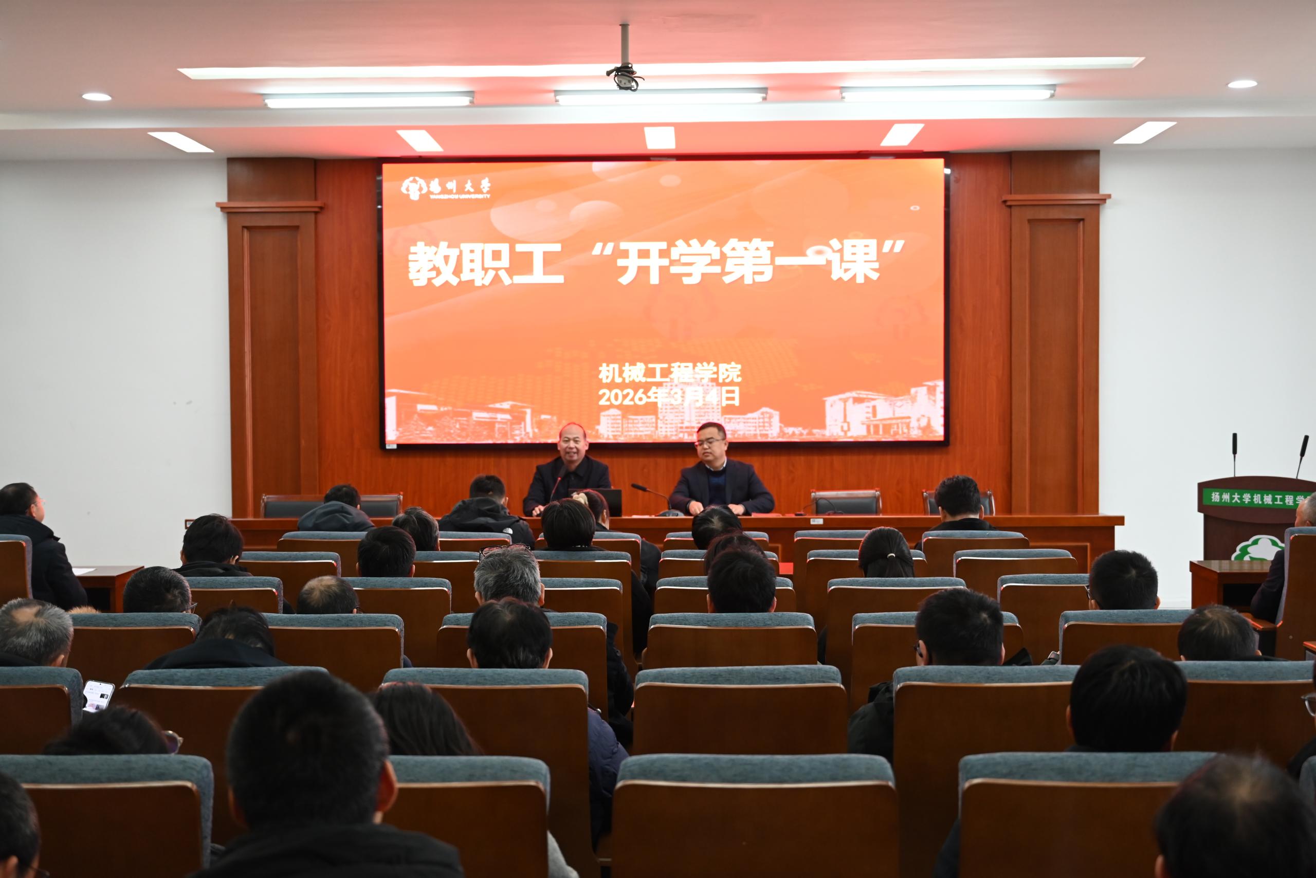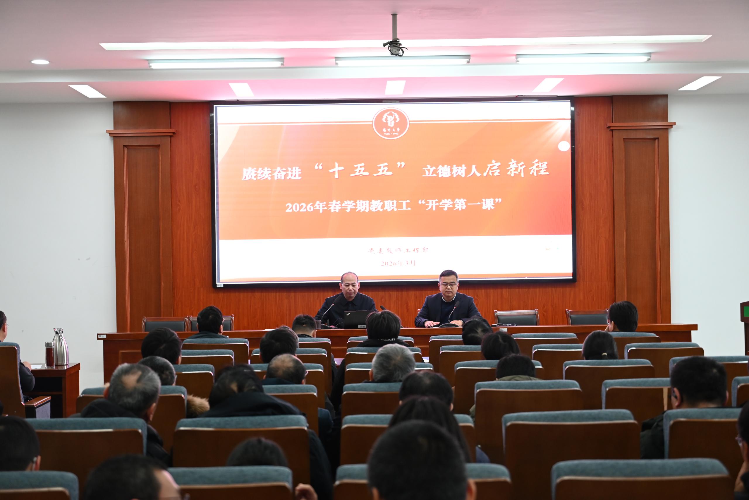 院党委书记张陟遥传达学习了学校2025-2026学年春学期干部教师大会上的讲话精神,并以“赓续奋进‘十五五’ 立德树人启新程”为主题,为全体教职工讲授“开学第一课”专题教育。他从纵观大势明方向,锚定立德树人根本任务、涵养师德扬正飞,以教育家精神铸魂强师、严明纪律知敬畏,坚守育人阵地学术净土、聚力攻坚谋突破,绘就“十五五”开局新图景四个方面讲授,一是以身边榜样“全国高校黄大年式教师团队”为例子,大力弘扬教育家精神;二是系统解读了《中华人民共和国教师法》《中华人民共和国高等教育法》《事业单位工作人员处分规定》《新时代高校教师职业行为十项准则》等文件精神,教育引导全体教职工以案为鉴,勿触纪法红线,严守法律法规与师德师风规范;三是紧扣“解放思想、守正创新、聚力攻坚、务求实效”的年度工作总基调,坚持以“263”为工作思路,聚焦两大核心目标,聚力攻坚六大重点任务,健全三大保障机制,高质量推进2026年度各项工作。