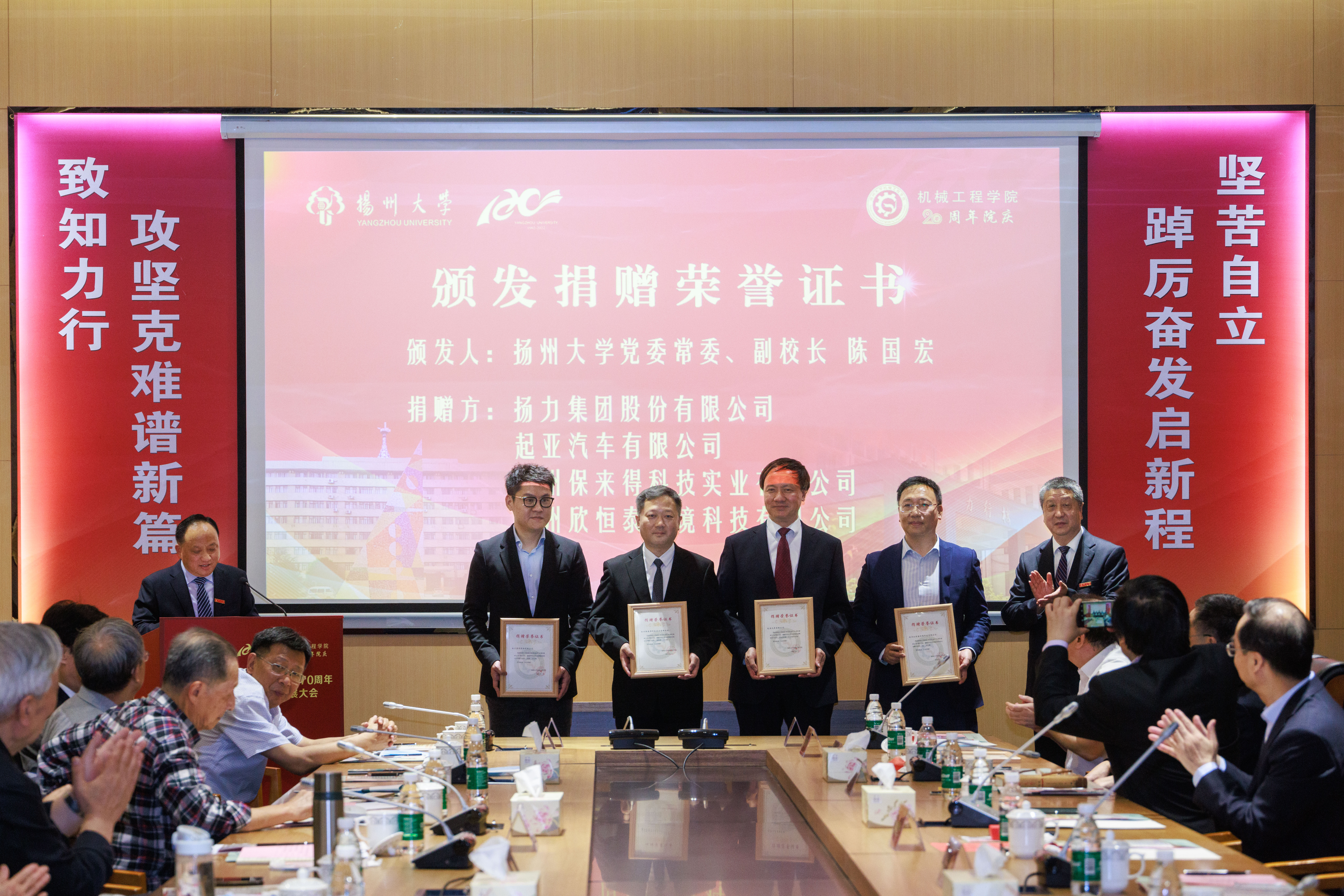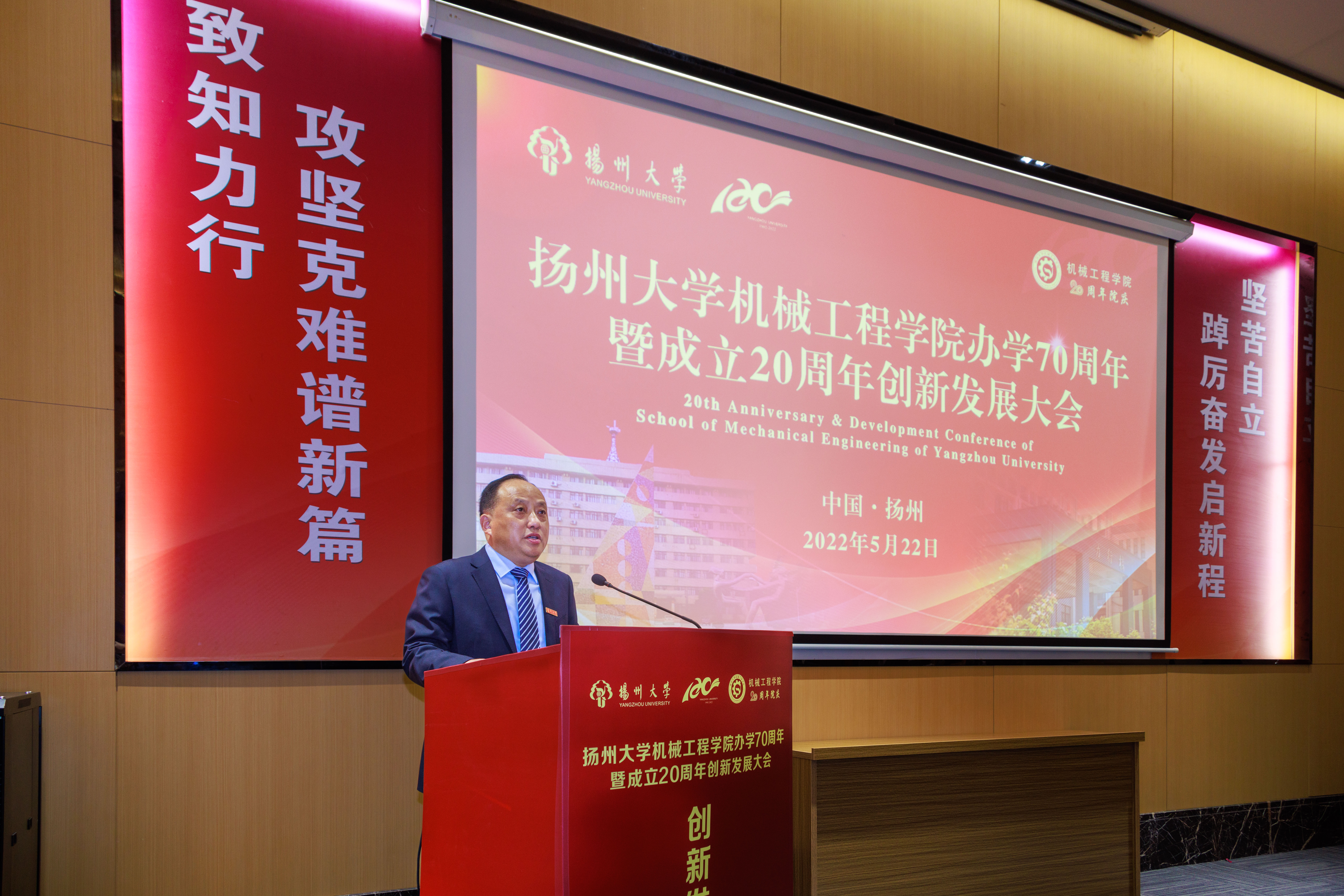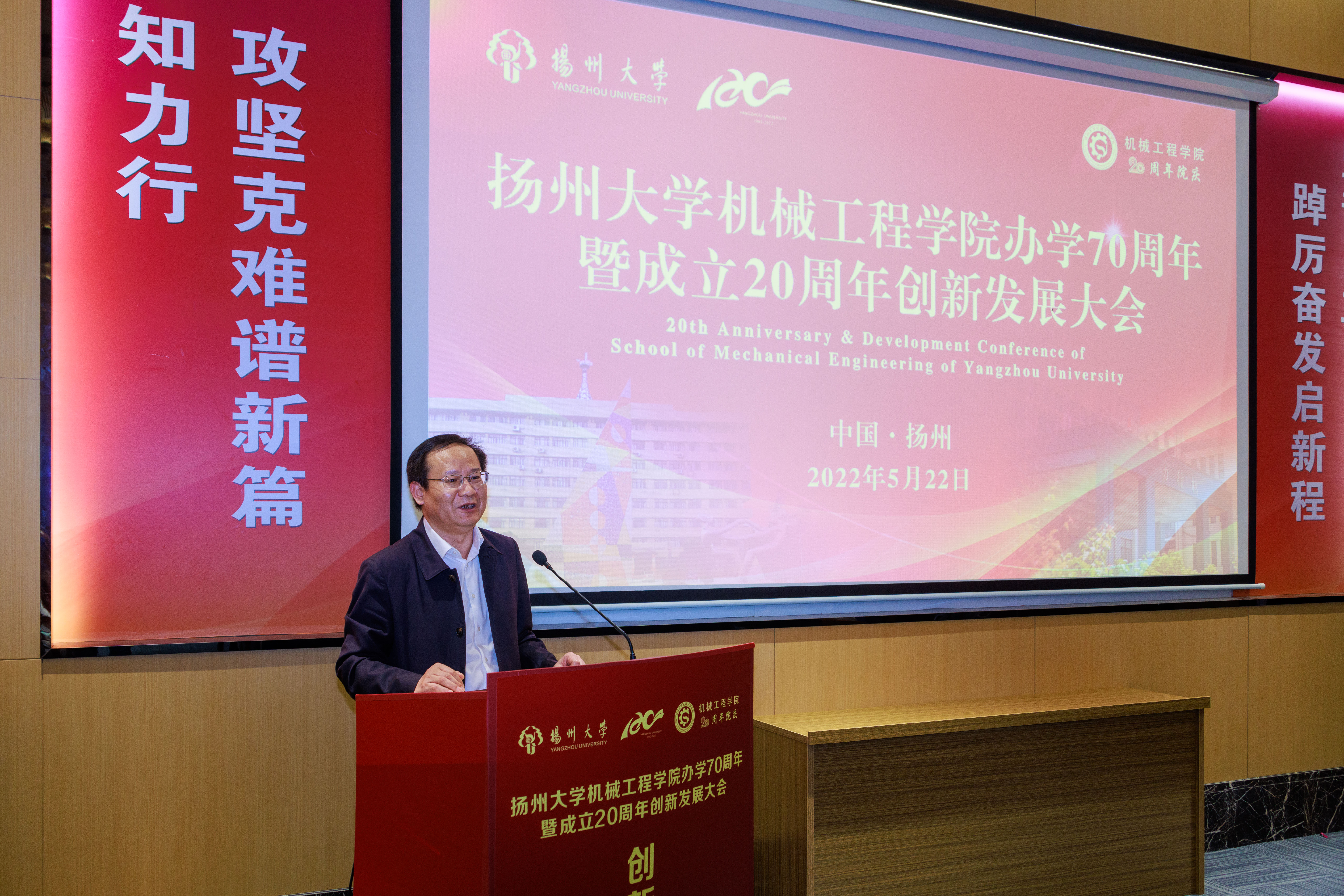 2022年5月22日上午,我院于合作单位扬力集团大厦401会议厅举行“办学70周年暨成立20周年创新发展大会”。本次大会采用主会场+分会场、线下+线上相结合的方式进行。主会场设在扬力集团大厦,分会场设在扬子津校区文体馆。校长丁建宁、校党委副书记叶柏森、副校长陈国宏、副校长洪涛,校机关部门和兄弟学院领导,院(系)和有关部门老领导,老教师代表,在扬校友、合作单位领导等应邀出席大会。学院全体领导和师生代表参加了主会场和分会场活动,另有3000余名校友和师生线上参会。院党委书记刘汉柏主持会议。