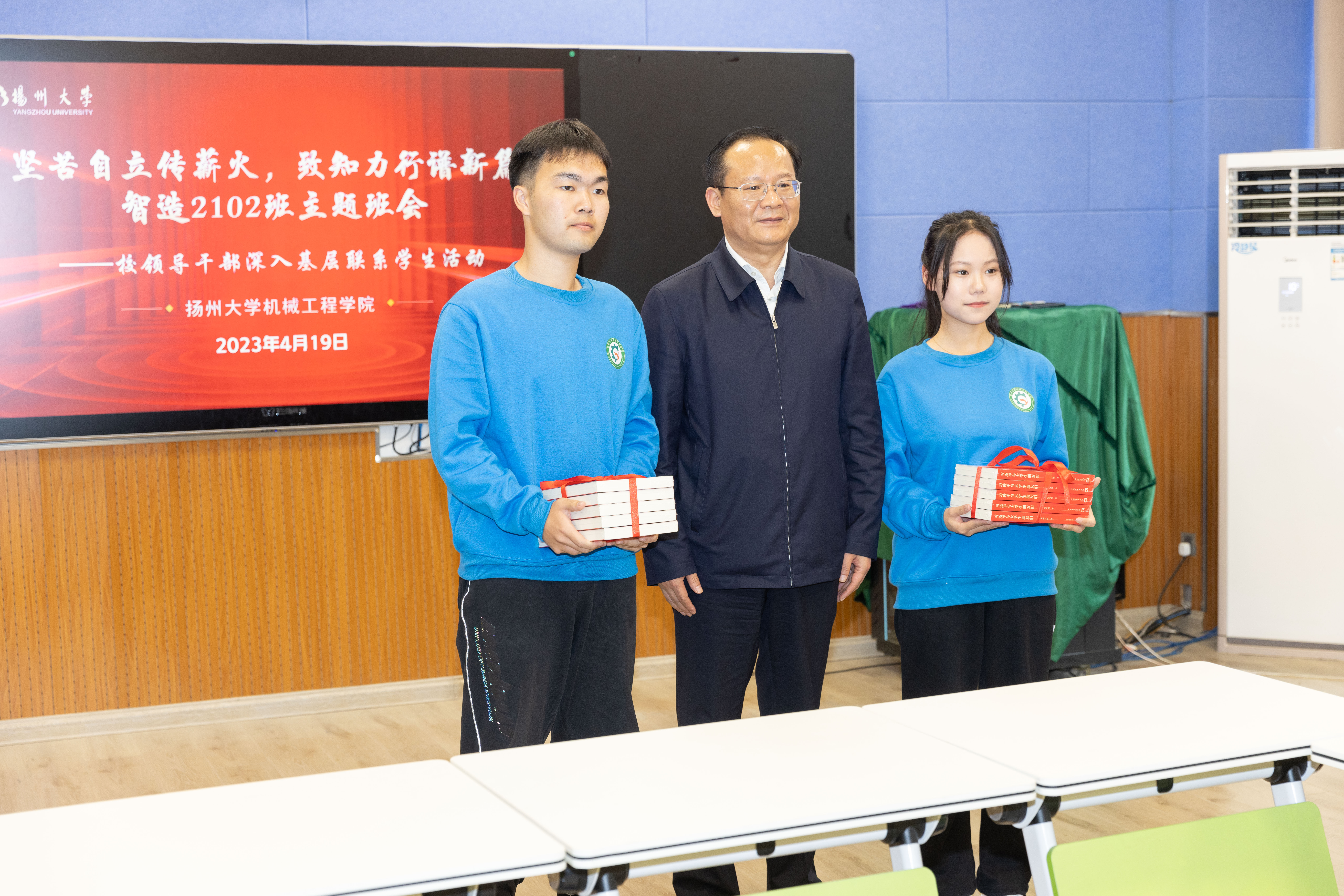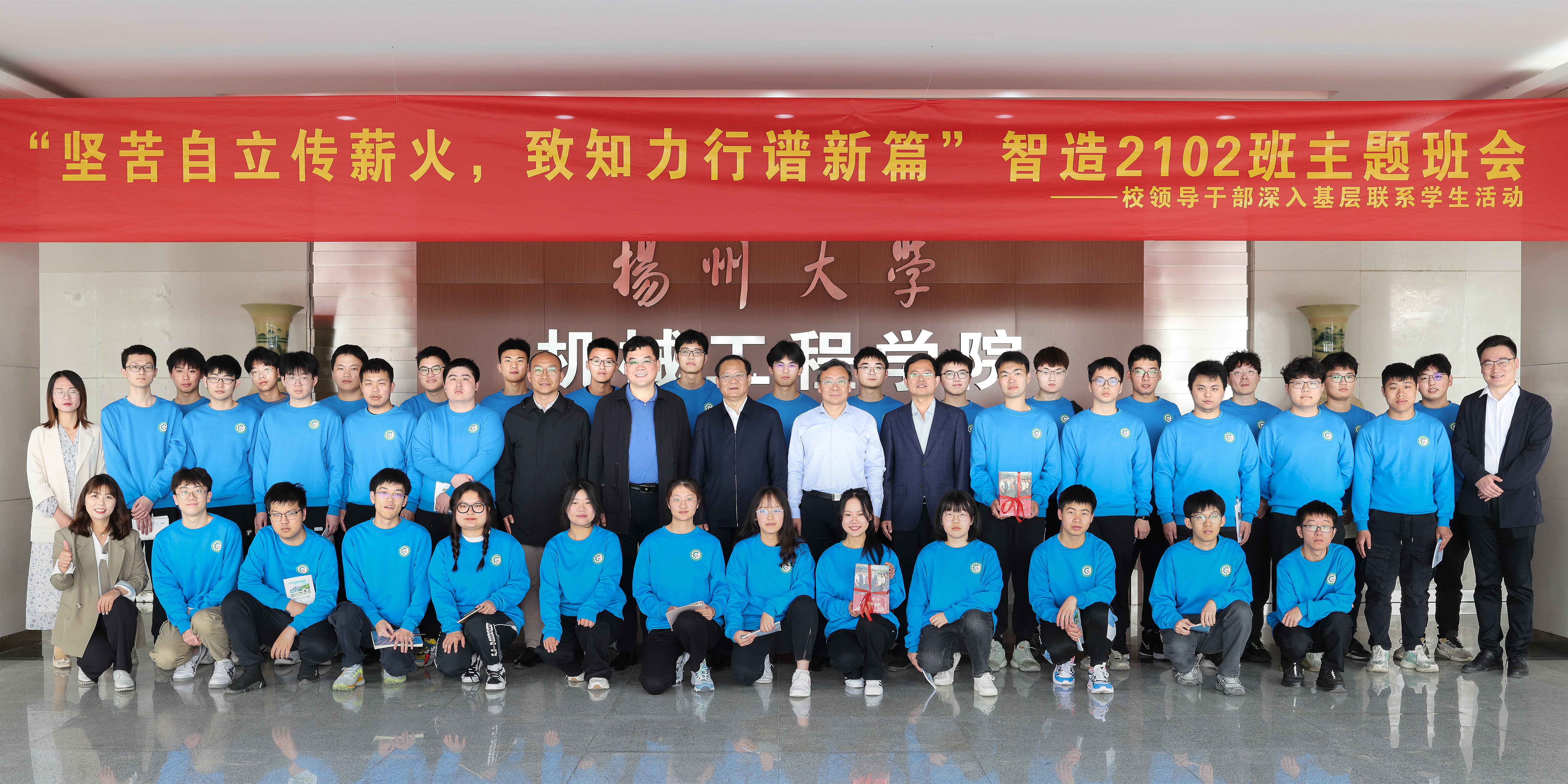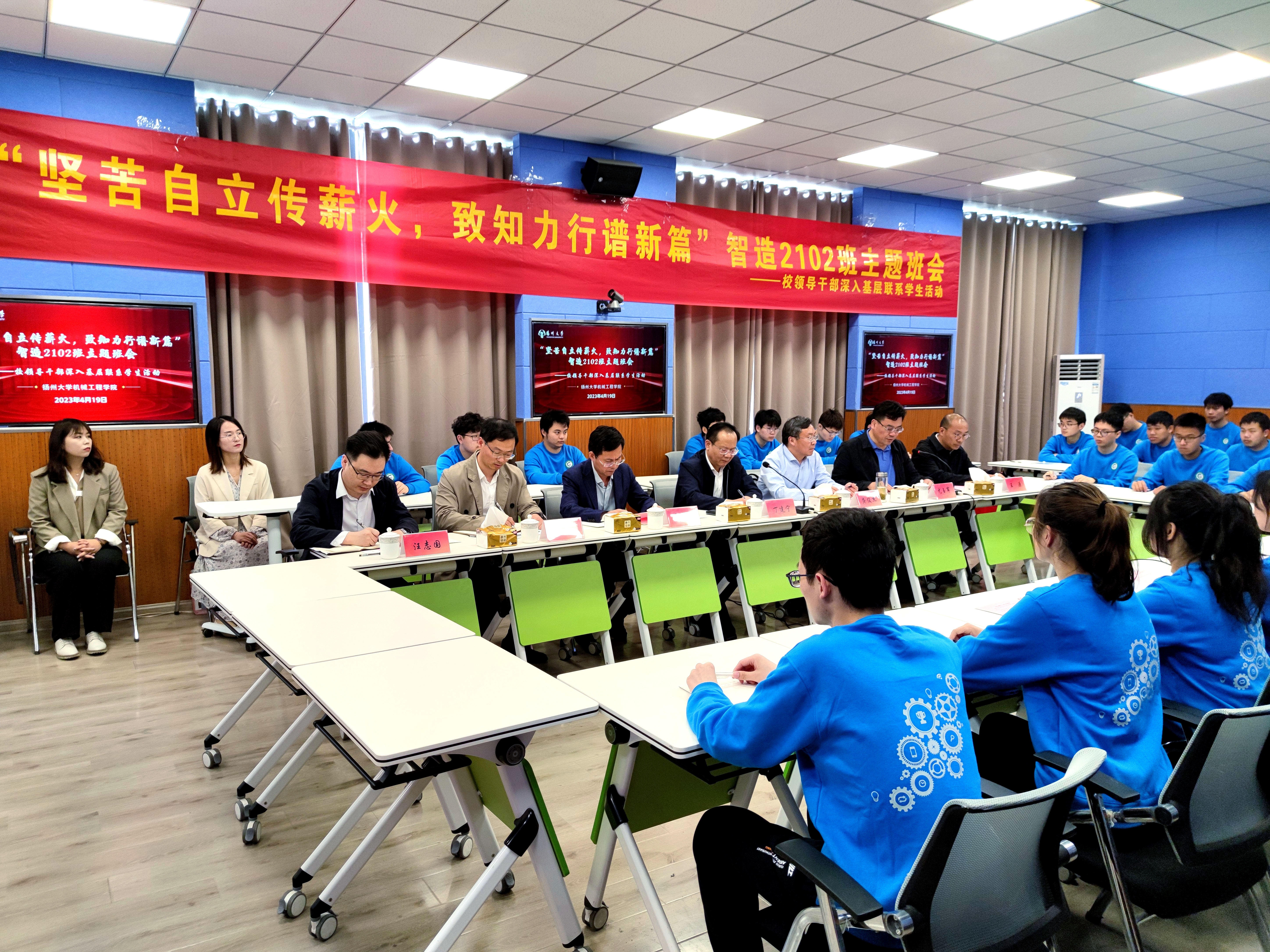 4月19日下午,我院于力行楼N409智慧教室举办“坚苦自立传薪火,致知力行谱新篇”智造2102班主题班会暨校领导干部深入基层联系学生活动。校长丁建宁出席活动并讲话,校长办公室主任龚俊杰,学生工作部(处)副部(处)长毛连军,院党委副书记毕亮,学院全体辅导员,智造2102班主任、全体同学参加活动。院党委书记尤玉军主持活动。