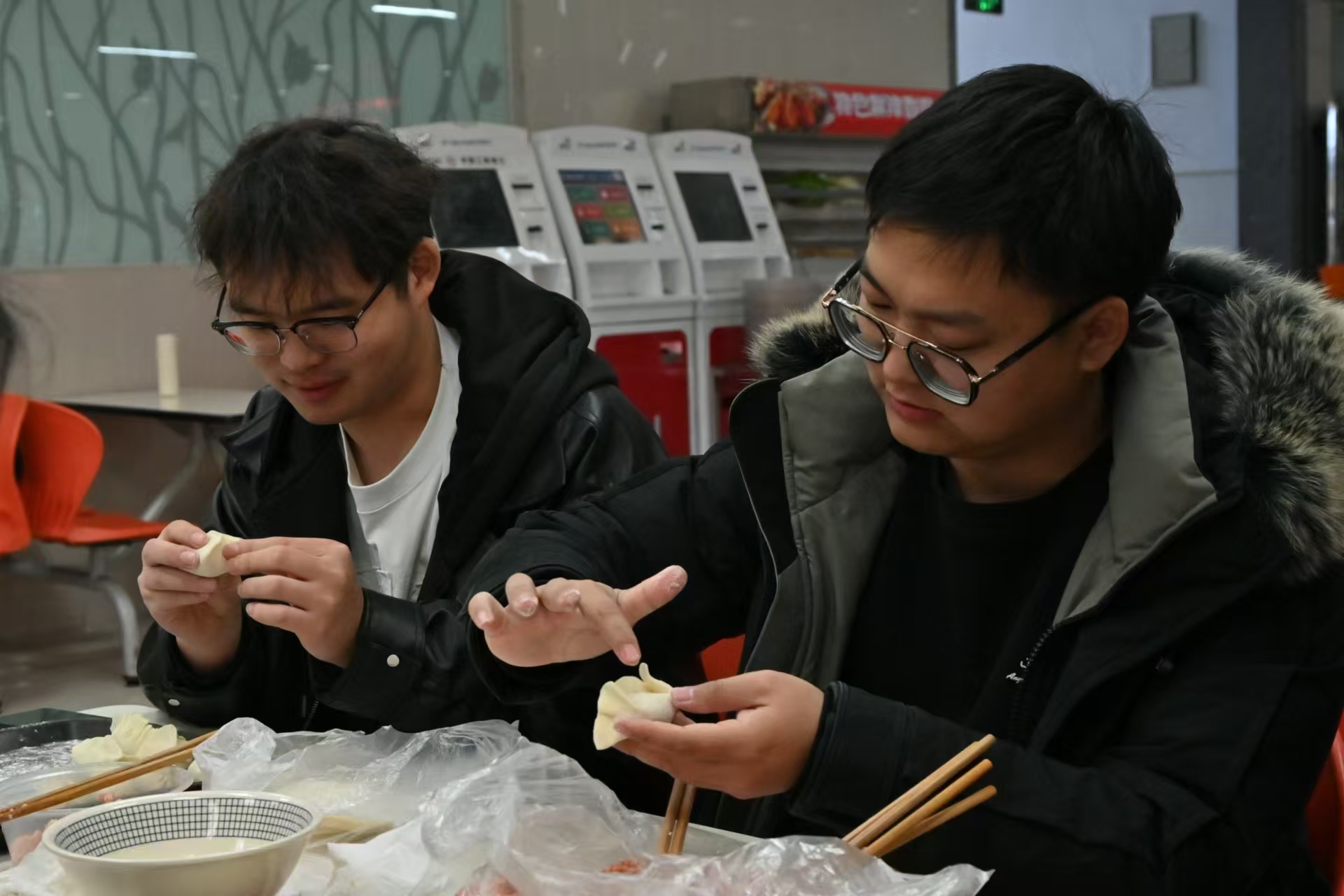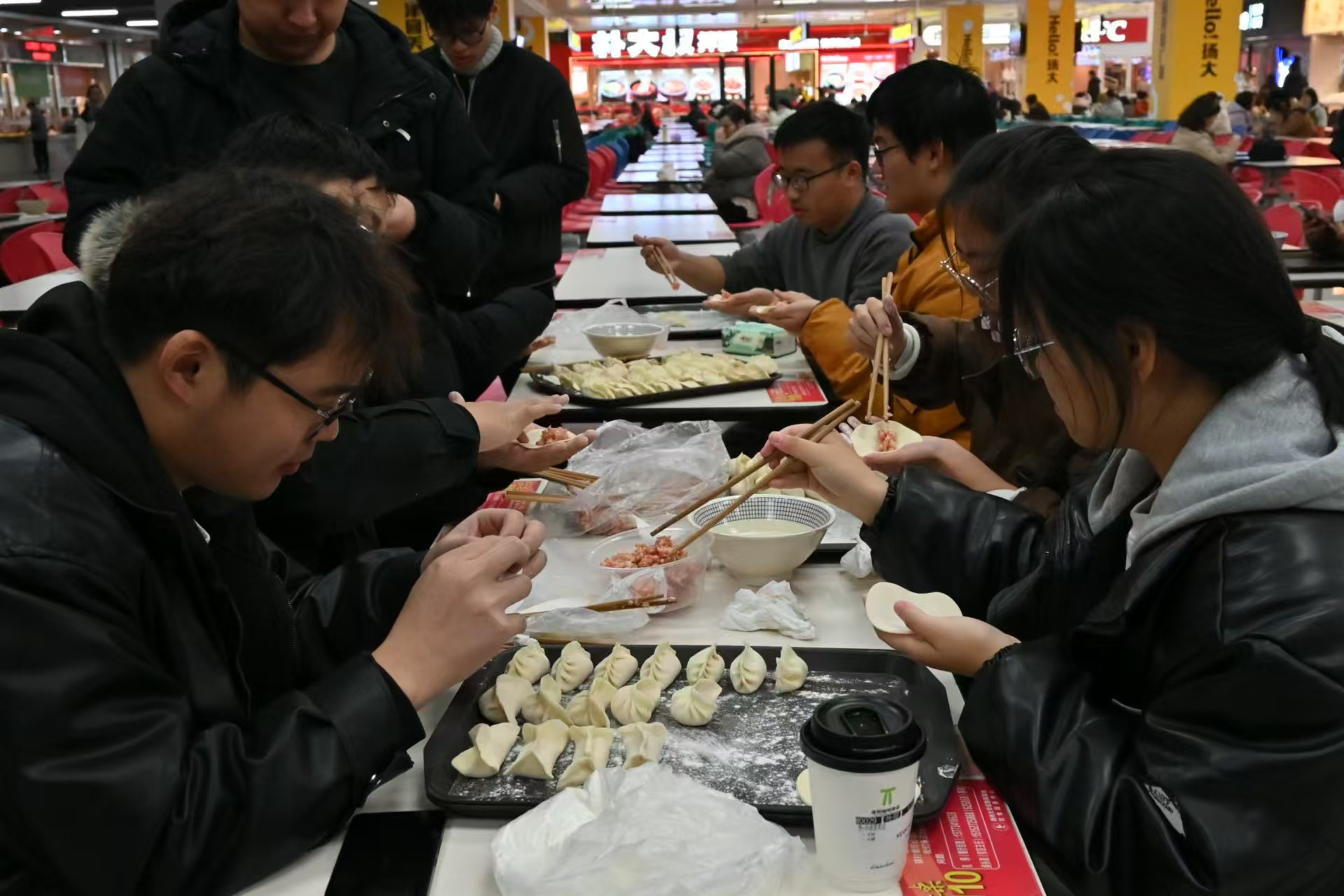 学院蓝天协会成员在扬子津东食堂分工合作,一同加入这项暖心活动,用象征节日韵味的饺子向考研学子送去美好祝愿。与此同时他们也将这份祝福分发给宿舍管理人员,为辛勤工作的长辈送去佳节的快乐,祝愿他们身体健康。