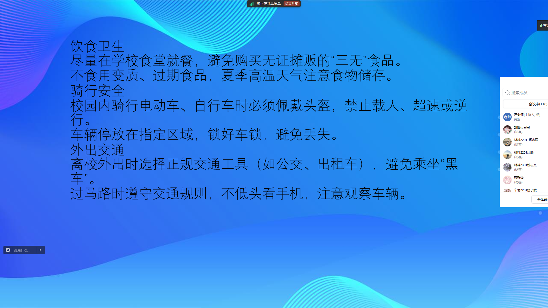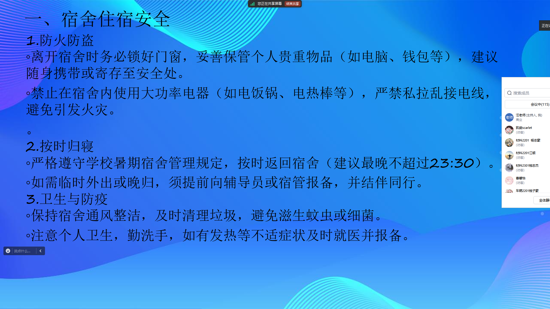 为保障暑期留校学生安全,6月30日,我院于线上召开2025年暑期留校学生安全教育会,辅导员汪志国、宋凯、马迎光及全体留校学生参加。