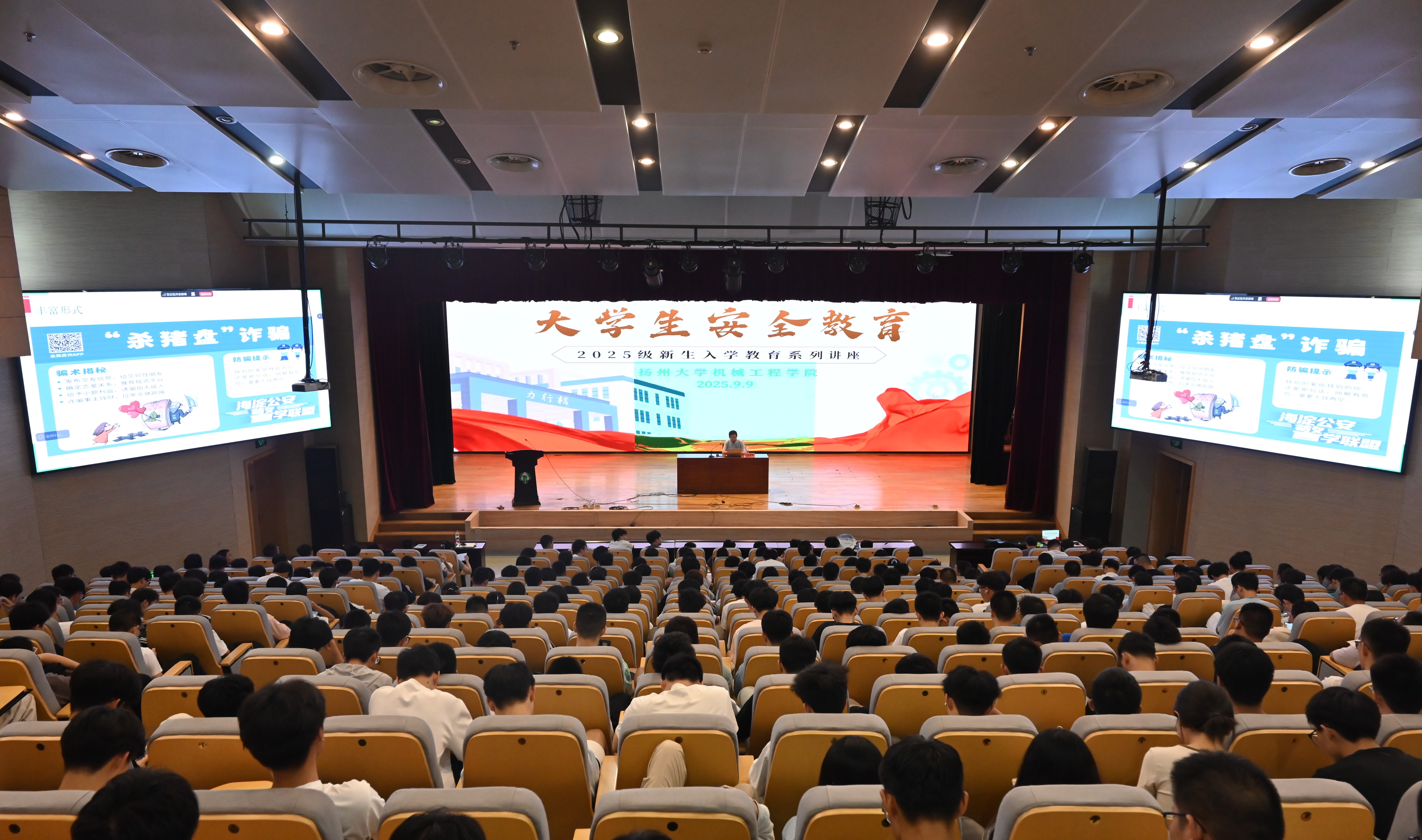 9月9日晚,我院在昭文馆举行新生入学教育讲座第三讲——大学生安全教育。讲座由党委保卫部(保卫处)处长毛连军主讲,2025级全体新生参加了此次讲座。
