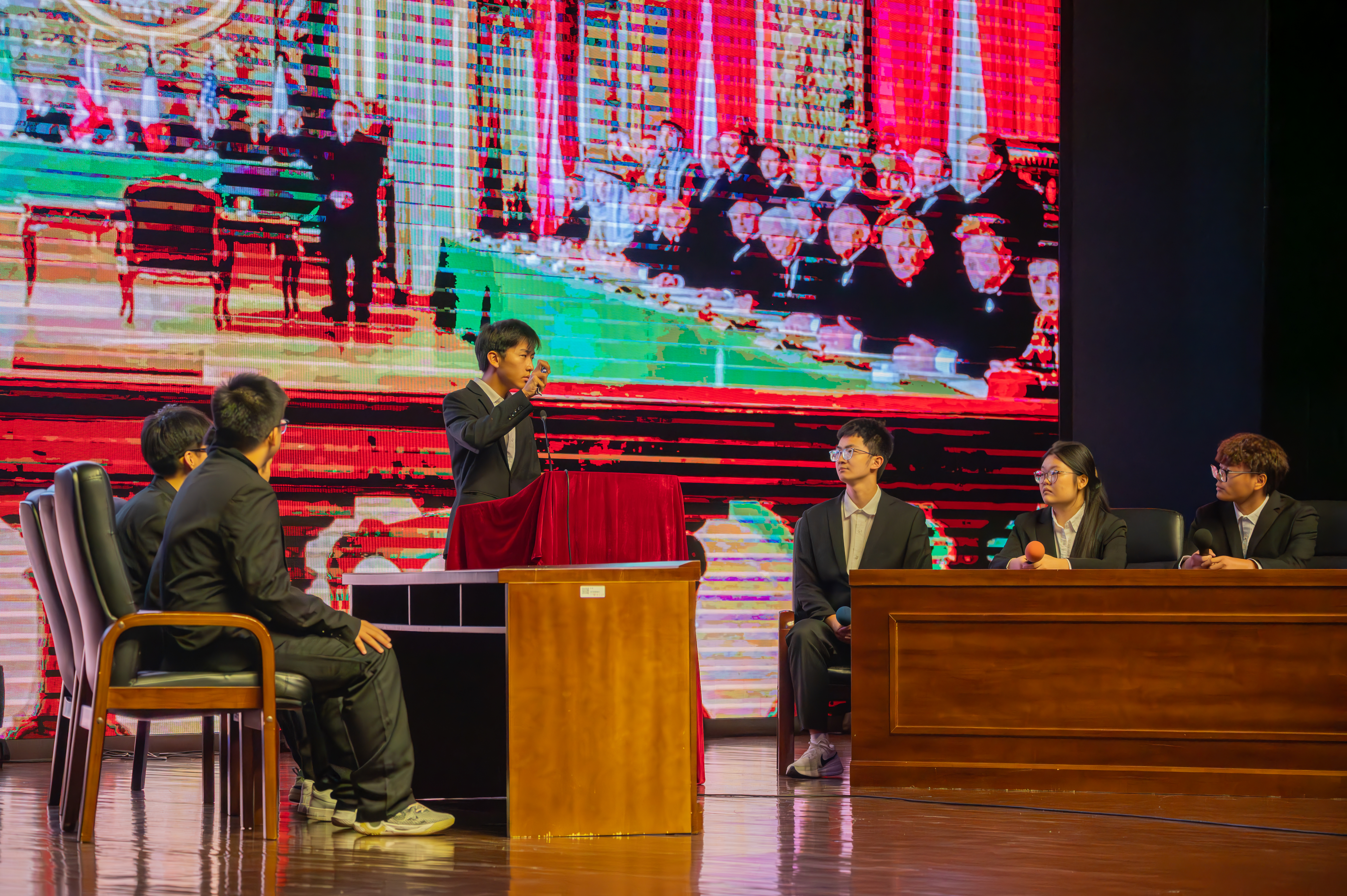 在第一篇章“逐梦新程,声动机械”中,机械2503班级带来的歌曲《你从未离去》以悠扬旋律拉开晚会序幕,瞬间点燃现场氛围;李悦雯演唱的《Letting go》用细腻声线诠释青春成长;李立、茅嘉程等同学表演的小品《稳赚不赔》凭借幽默剧情与精湛演技引发阵阵欢笑;王博弘的说唱《NOT GOOD+主场Pt.2》以强劲节奏展现潮流态度;赵文昕、陈伟泽合作的歌曲《流沙》旋律动人,传递青春情愫;胡荣轩、包晗等同学演绎的话剧《建国大业》则带观众重温历史,致敬时代精神。