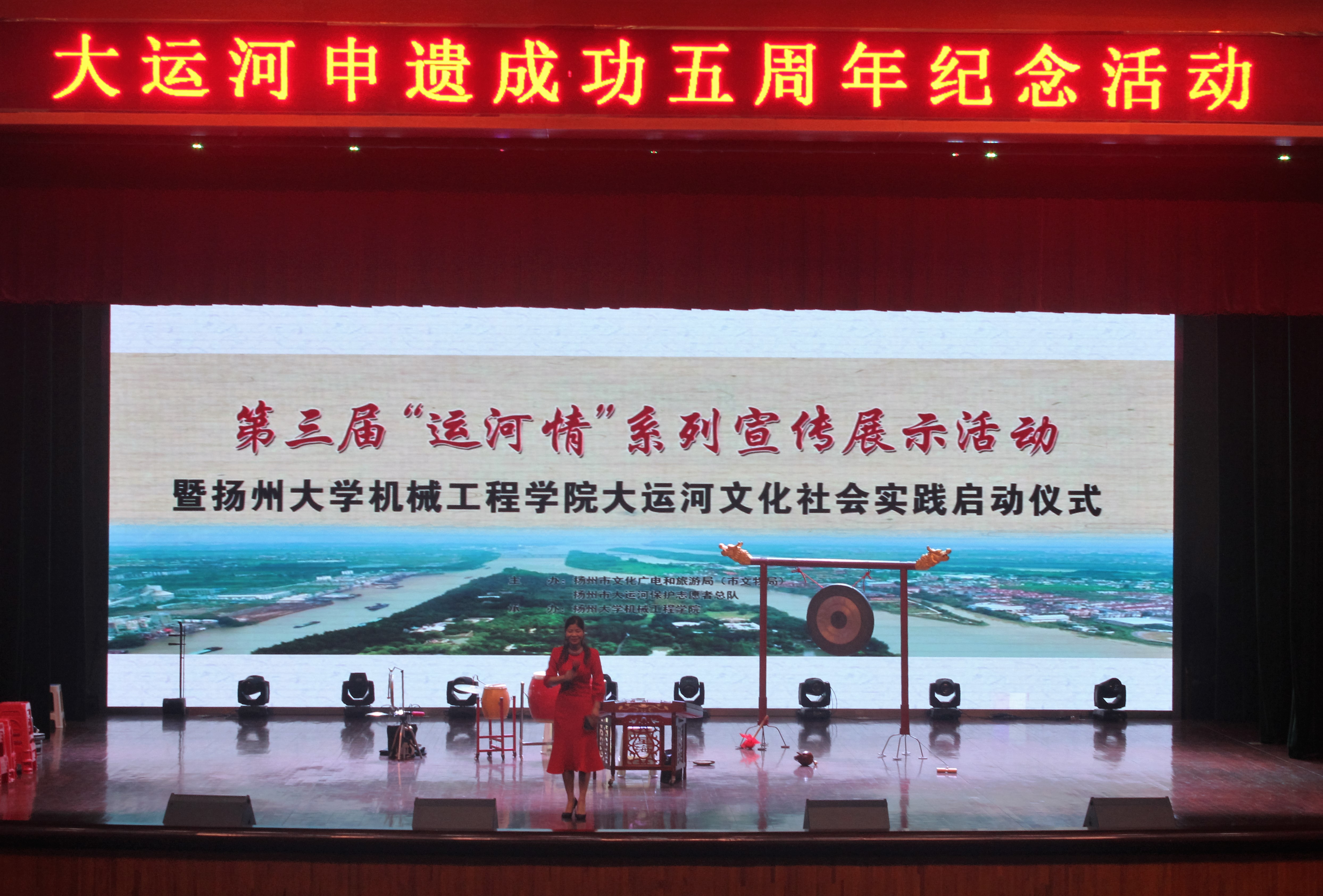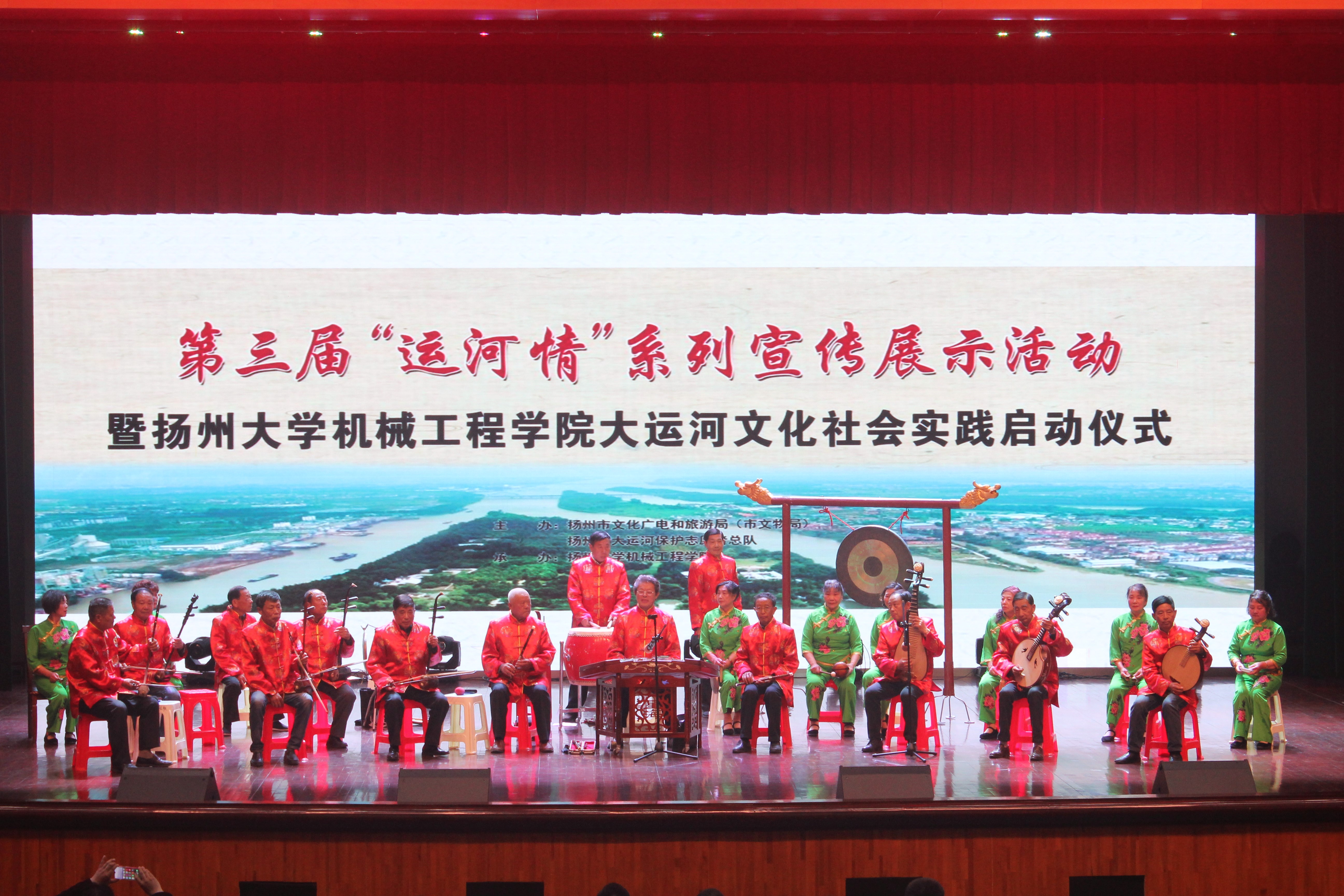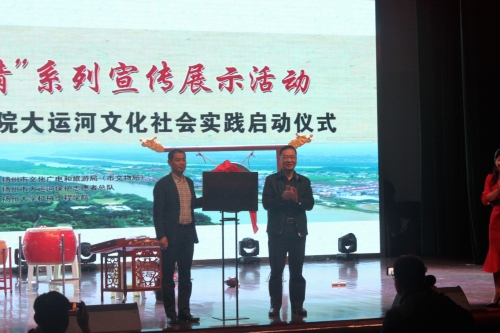 活动伊始,市文化广电和旅游局(市文物局)副局长曹华军、学院党委书记卜以江为“大运河工业遗产保护传承利用 扬州大学机械工程学院社会实践基地”揭牌;市文化广电和旅游局(市文物局)科技处处长孙明光和校团委副书记陈佩沛老师为“大运河工业遗产调研社会实践小分队”、“大运河文创实践小分队”授旗。随后,扬州市文化广电和旅游局(市文物局)曹华军副局长向扬州大学机械学院赠送了《一路扬帆一路歌》大运河与海上丝绸之路专题论文集。在院党委副书记虞强老师宣布展示活动正式开始后,邵伯锣鼓小牌子、邵伯秧号子、扬剧联唱等极具扬州地方特色的演出轮番上演,反响热烈。我院学生也带来了汉服舞蹈、古风歌曲等精彩表演。