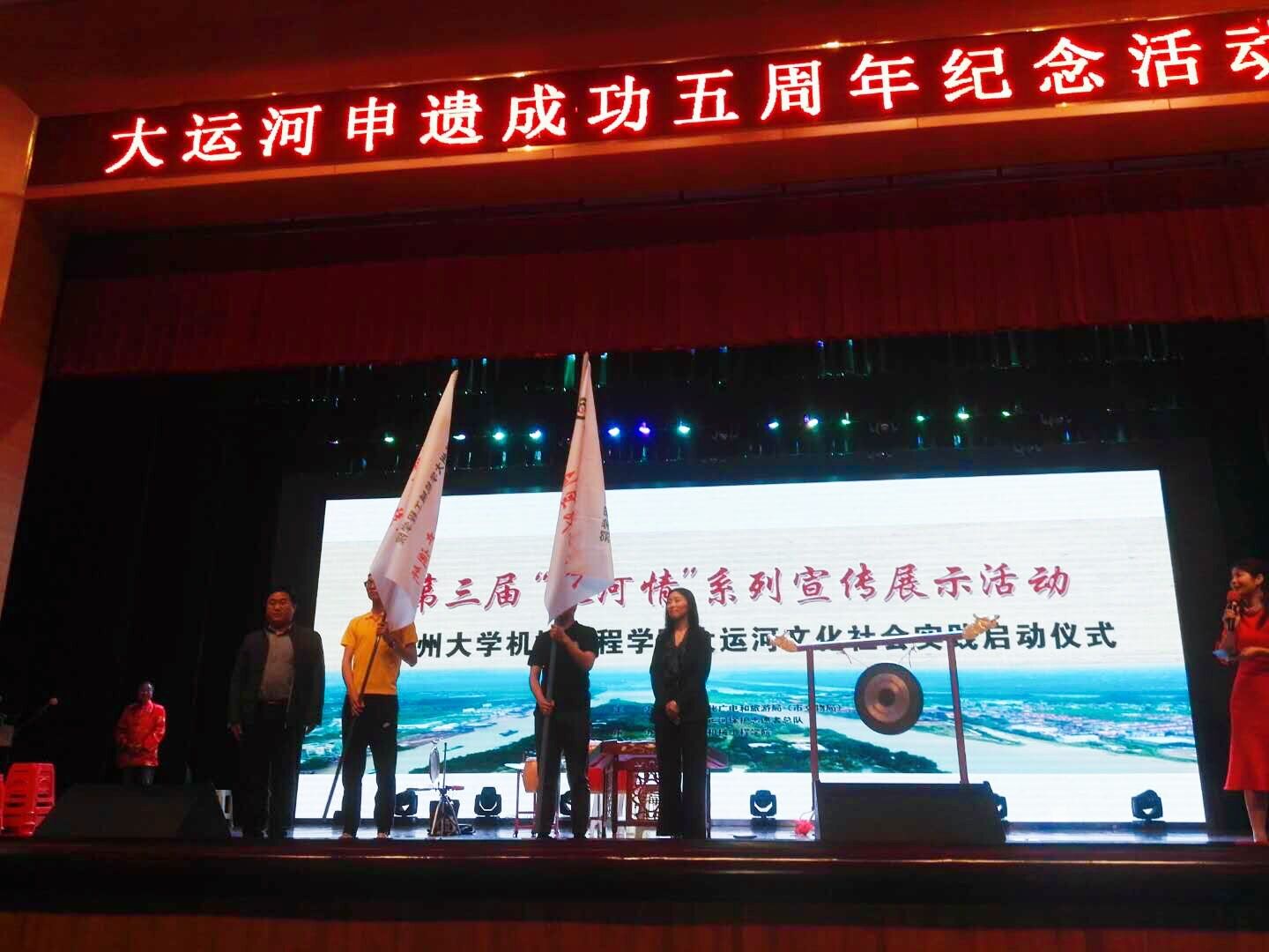 5月8日下午,第三届“运河情”系列宣传展示暨扬州大学机械工程学院大运河文化社会实践启动仪式于我校扬子津校区文体馆三楼小剧场隆重举行。本次活动由扬州市文化广电和旅游局(市文物局)、扬州市大运河保护志愿者总队主办,扬州大学机械工程学院承办。市文化广电和旅游局(市文物局)副局长曹华军、市文化广电和旅游局(市文物局)科技处处长孙明光、扬州大学团委副书记陈佩沛老师、扬州大学机械工程学院党委书记卜以江老师、扬州大学机械工程学院党委副书记虞强老师出席了此次活动。
