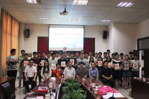 会议由一段同学们拍摄的视频开场,老师们和同学们看着这段视频,温情回顾着大学四年美好的岁月。随后,同学们一一接过话筒,向何皖陵老师表达自己的心声并对何老师致以最衷心的感谢。接着,在同学们的热切期待中,何老师为同学们开展了最后一次班会,为同学们的未来送上祝福与期待,也对学院关工委的工作给与了肯定和赞扬。共建班班主任沈茂松老师、关工委刘方云老师和赵玉华老师也纷纷发言,表达了他们对同学们刻苦努力学习的肯定,也给同学们提出了对未来人生道路的建议。在徐香翠老师对本次汇报会进行简要总结之后,同学们向何皖陵老师送出了精心准备的礼物,何老师也给同学们赠送了礼物以作留念。