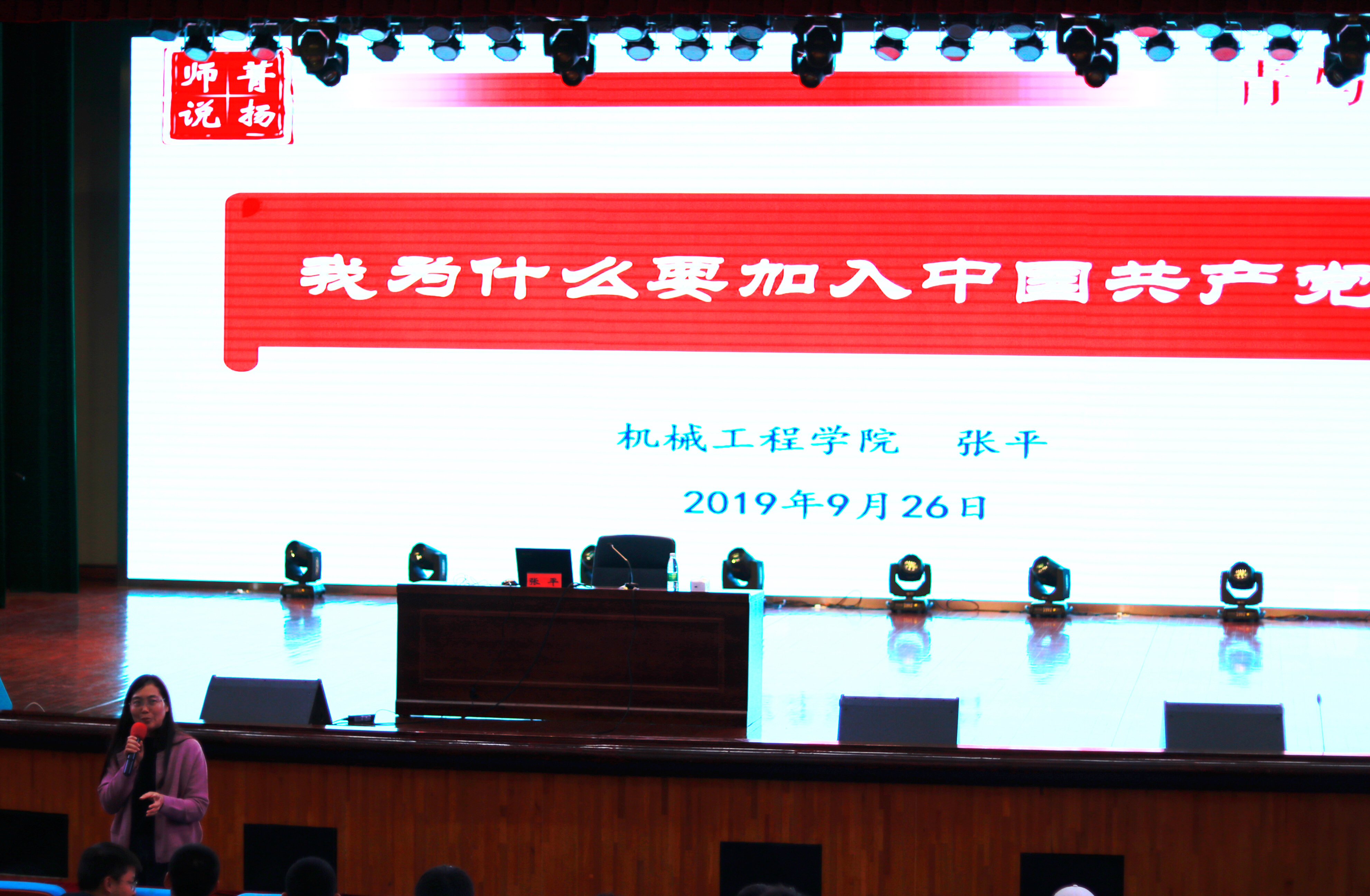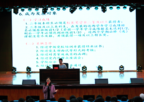 9月26日,我院在文体馆三楼小剧场开展了主题为“我为什么要加入中国共产党”的新生入学教育讲座。报告由我院党委副书记张平主讲,辅导员杨超老师主持。
