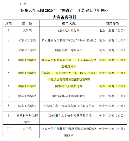 日前,2019年“创青春”扬州大学大学生创业大赛在荷花池校区举行。我院作品《锄禾农机科技有限公司——打造精准高效农机新样本》、《国际钢——科技助梦“一带一路”,中孟合作打造国际顶级高强韧气门弹簧》、《圆锥轮式无级变速器》喜获金奖,同时入围 2020 年“创青春”江苏省大学生创业大赛备赛项目。