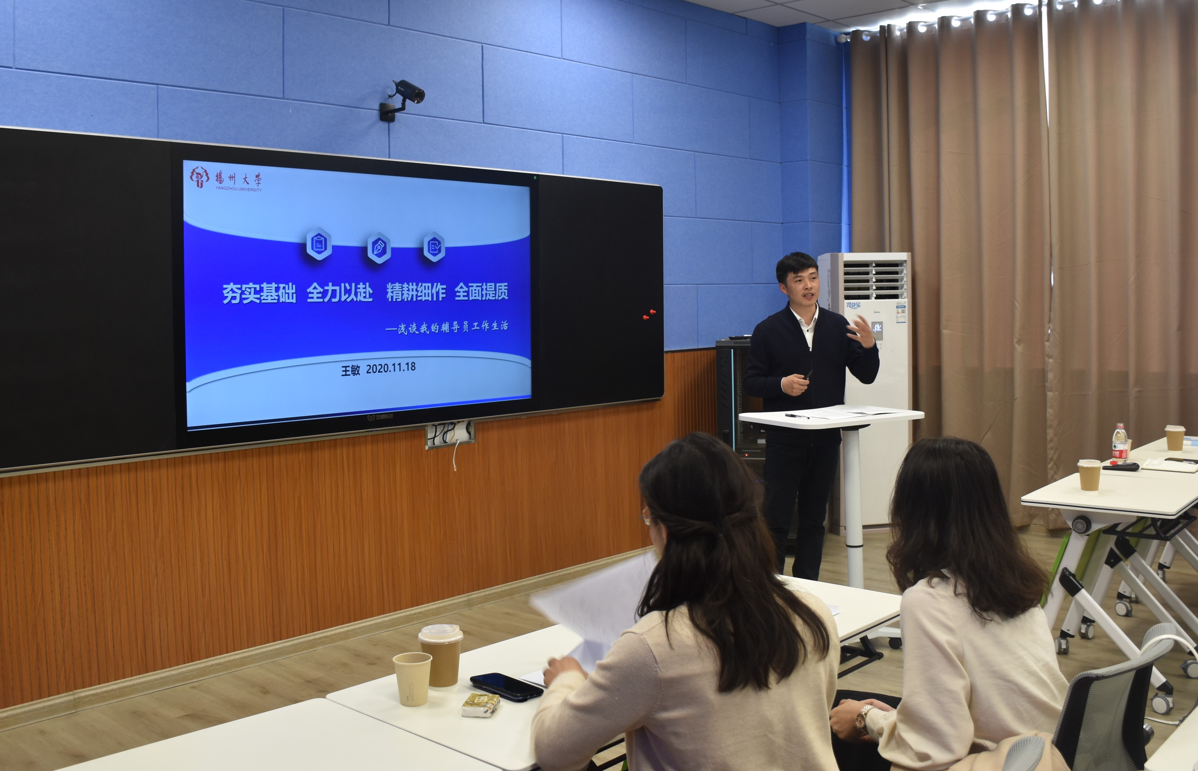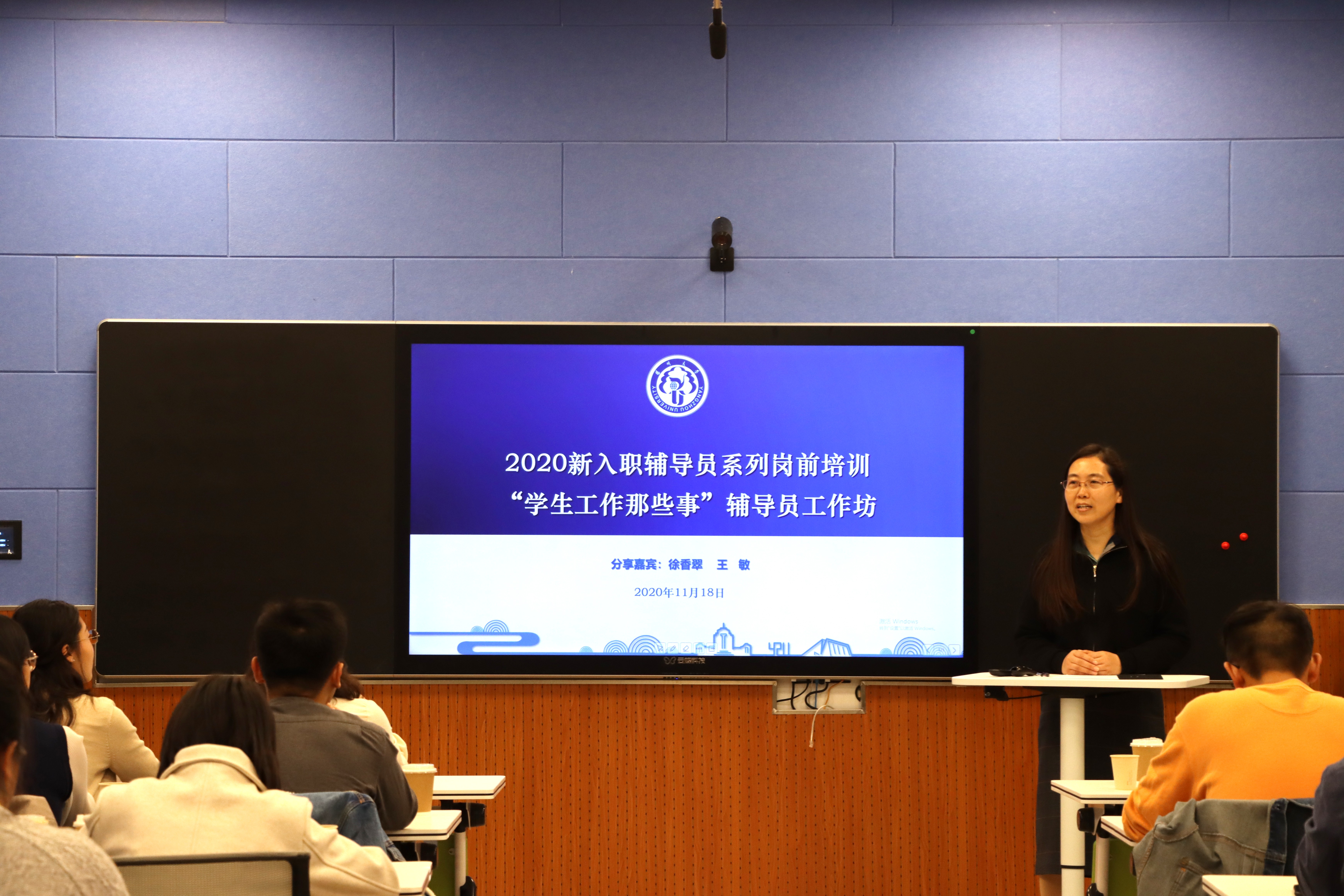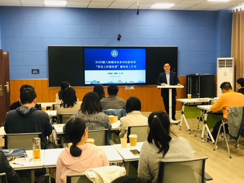 11月18日上午,2020新入职辅导员系列岗前培训之“学生工作那些事”辅导员工作坊在我院力行楼N409智慧教室举行。校党群党总支书记、学生工作部(处)副部(处)长居学明、我院党委副书记张平出席活动。旅游烹饪(食品科学与工程)学院团委书记王敏、我院团委书记徐香翠两位扬州大学辅导员年度人物提名奖获得者与全体2020年新入职辅导员面对面交流分享。