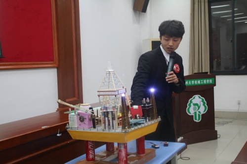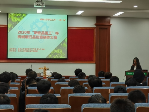 11月21日晚,我院于力行楼401报告厅举办了第六届“新宏昌重工”杯机械废旧品创意制作大赛决赛。扬州市机械工程学会秘书长陶晔,我院党委副书记张平、团委书记徐香翠,工业设计系主任陈世栋、机电工程系副主任朱林及戴敏老师担任大赛评委。