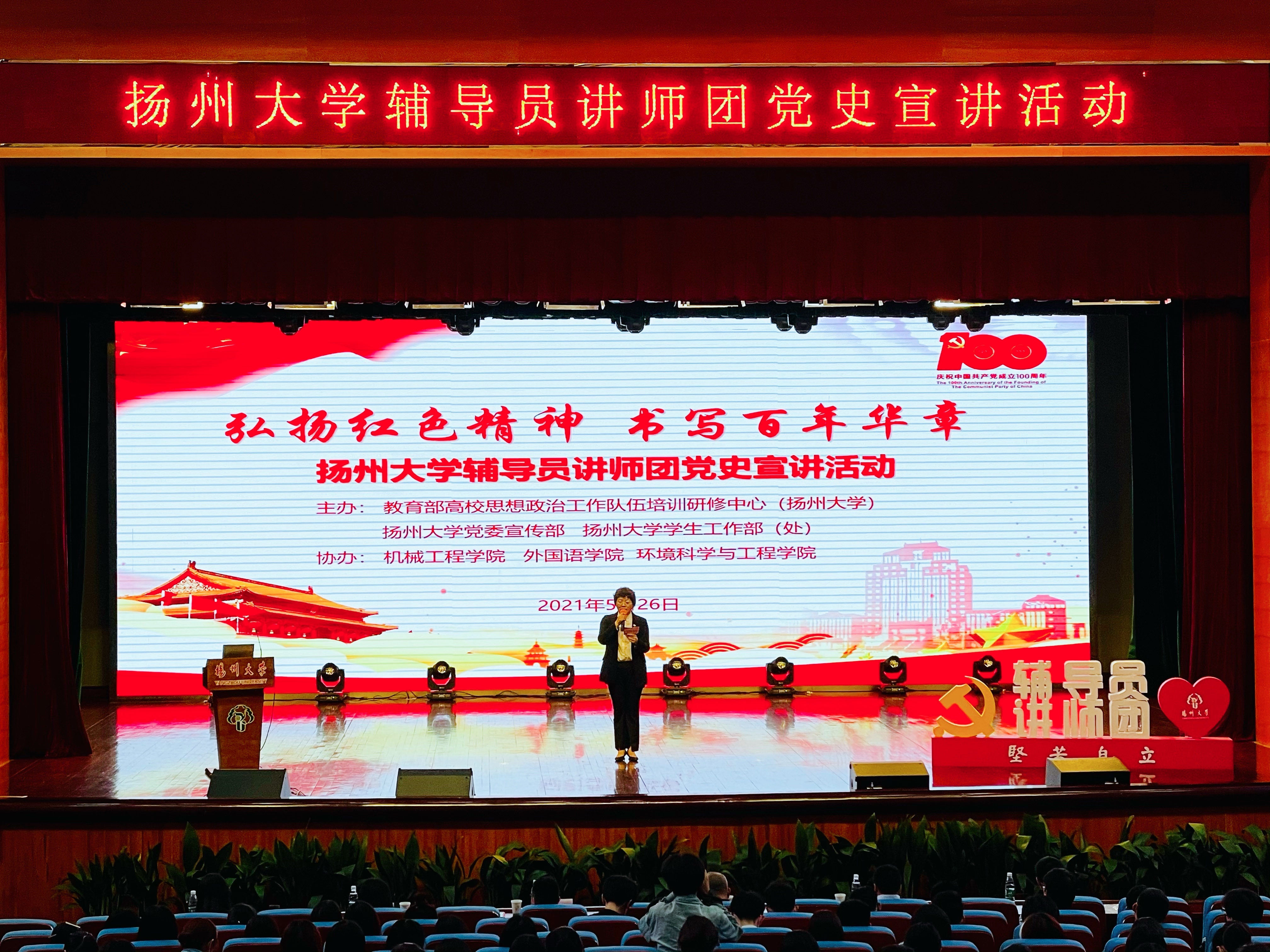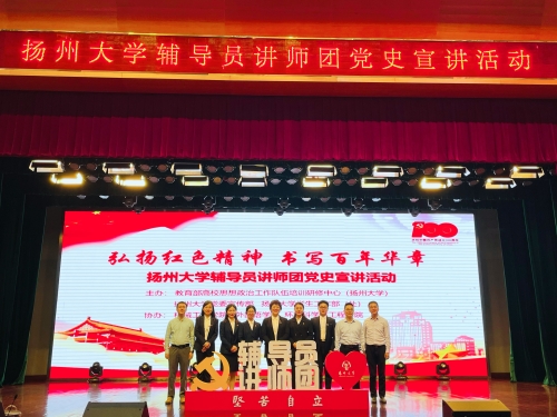 5月26日下午4点30分,由教育部高校思想政治工作队伍培训研修中心(扬州大学)、扬州大学党委宣传部、扬州大学学生工作部(处)主板,我院、外国语学院、环境科学与工程学院协办的“弘扬红色精神 书写百年华章”扬州大学辅导员讲师团党史宣讲活动在文体馆三楼小剧场顺利举行。