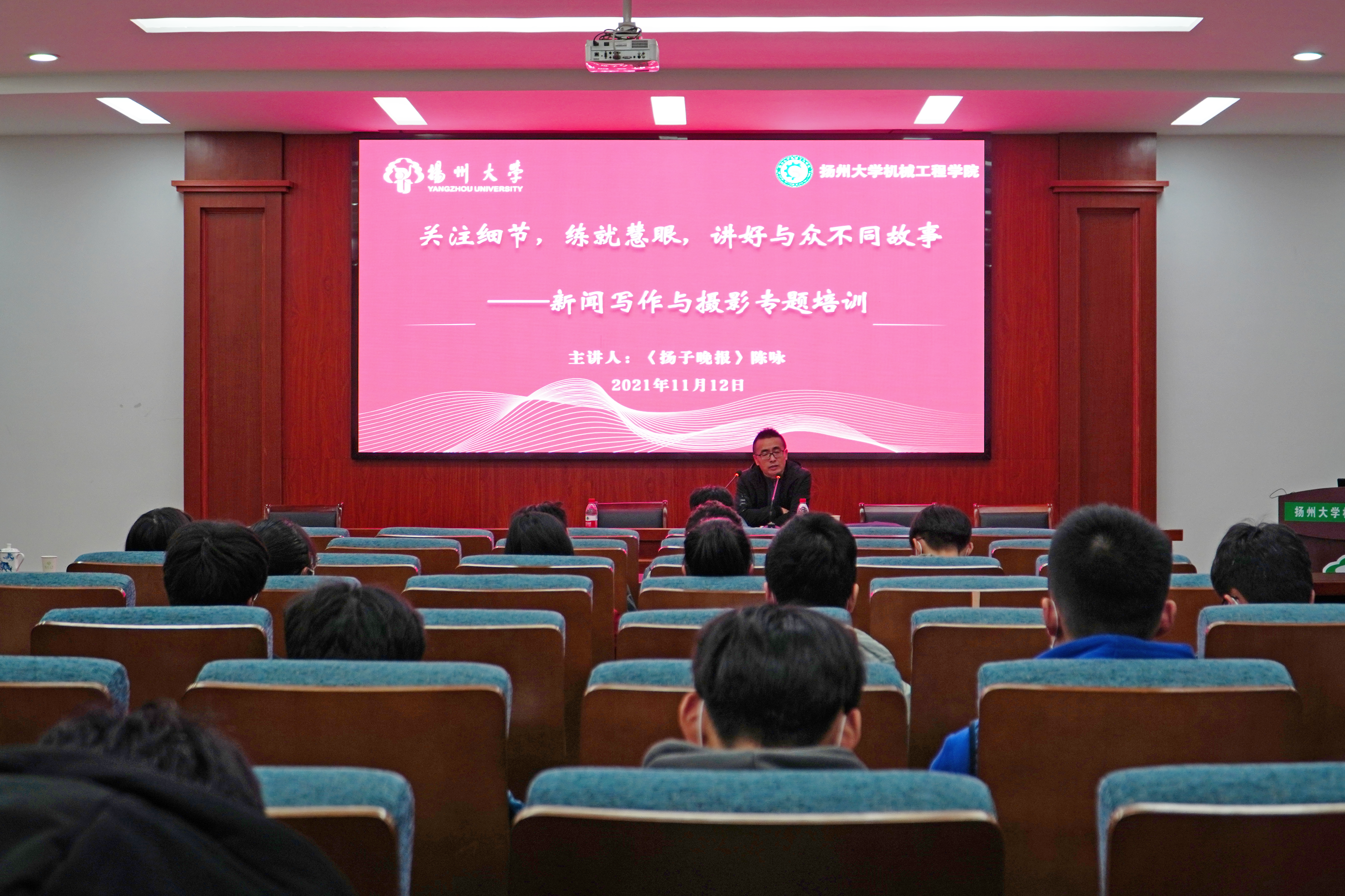 11月12日,我院于力行楼401报告厅举办了主题为“关注细节,练就慧眼,讲好与众不同故事”的新闻写作指导会。本次指导会特别邀请了《扬子晚报》记者陈咏老师主讲。院团委书记徐香翠、辅导员贾林森、宣报中心主任、部长团参加此次指导会。