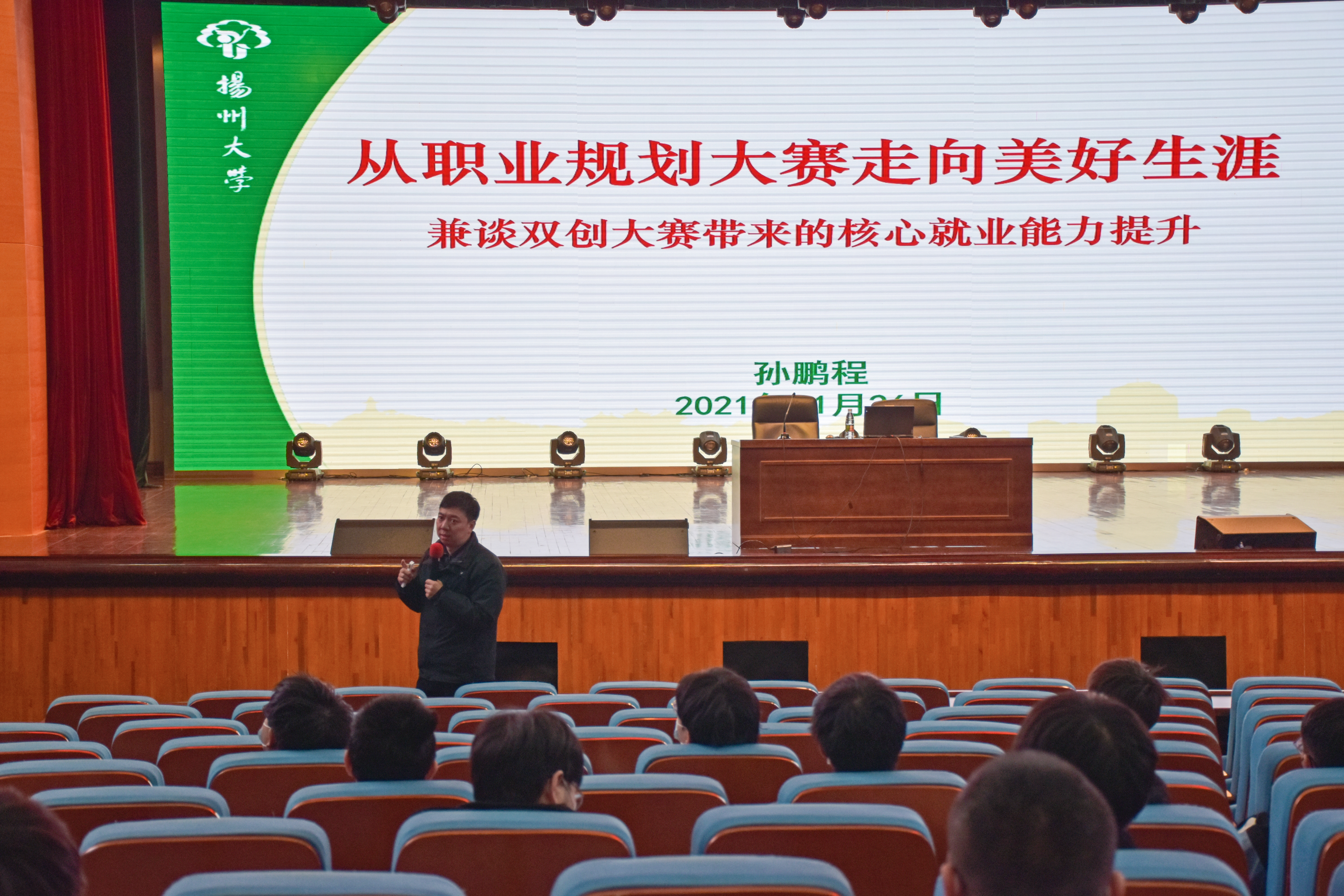 在讲座开始时孙主任从放羊的故事谈起,引出了三个话题:第一,职业生涯是什么,浅谈生涯与职业生涯的定义及其对人一生的影响;第二,职业规划大赛初体验,从职业生涯规划书撰写、生涯人物访谈报告撰写和职业体验报告撰写三个方面谈到了职业规划大赛的流程与意义;第三,生涯规划的价值所在,教育同学们重视自身职业生涯的规划。随后,孙主任从创新与创业角度给同学们讲述了其重要意义,以自身管理的扬州大学创业苗圃的故事为例,讲述了创业的艰辛,又以华为为例,强调了创新是国家在国际社会立足的重要一环。