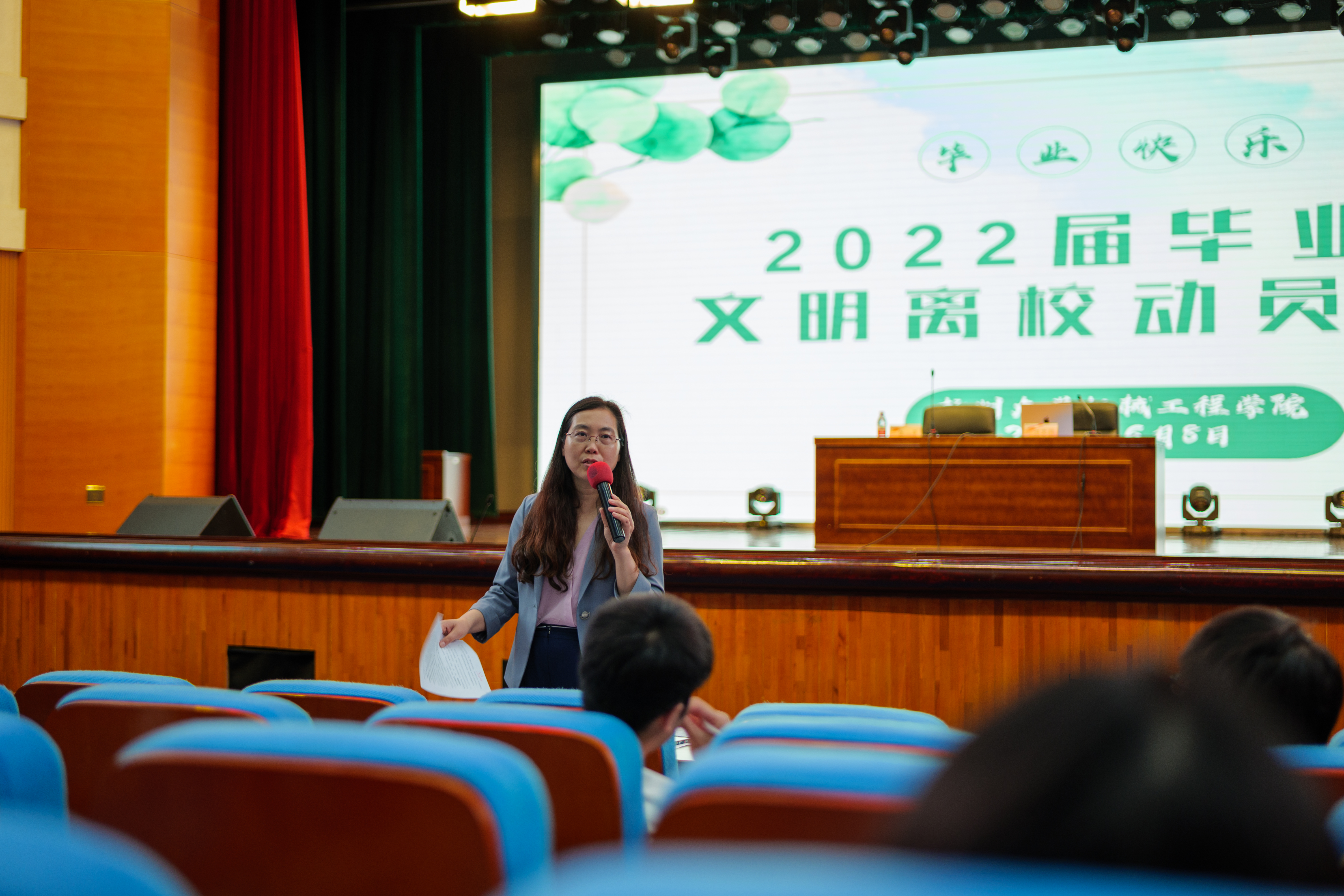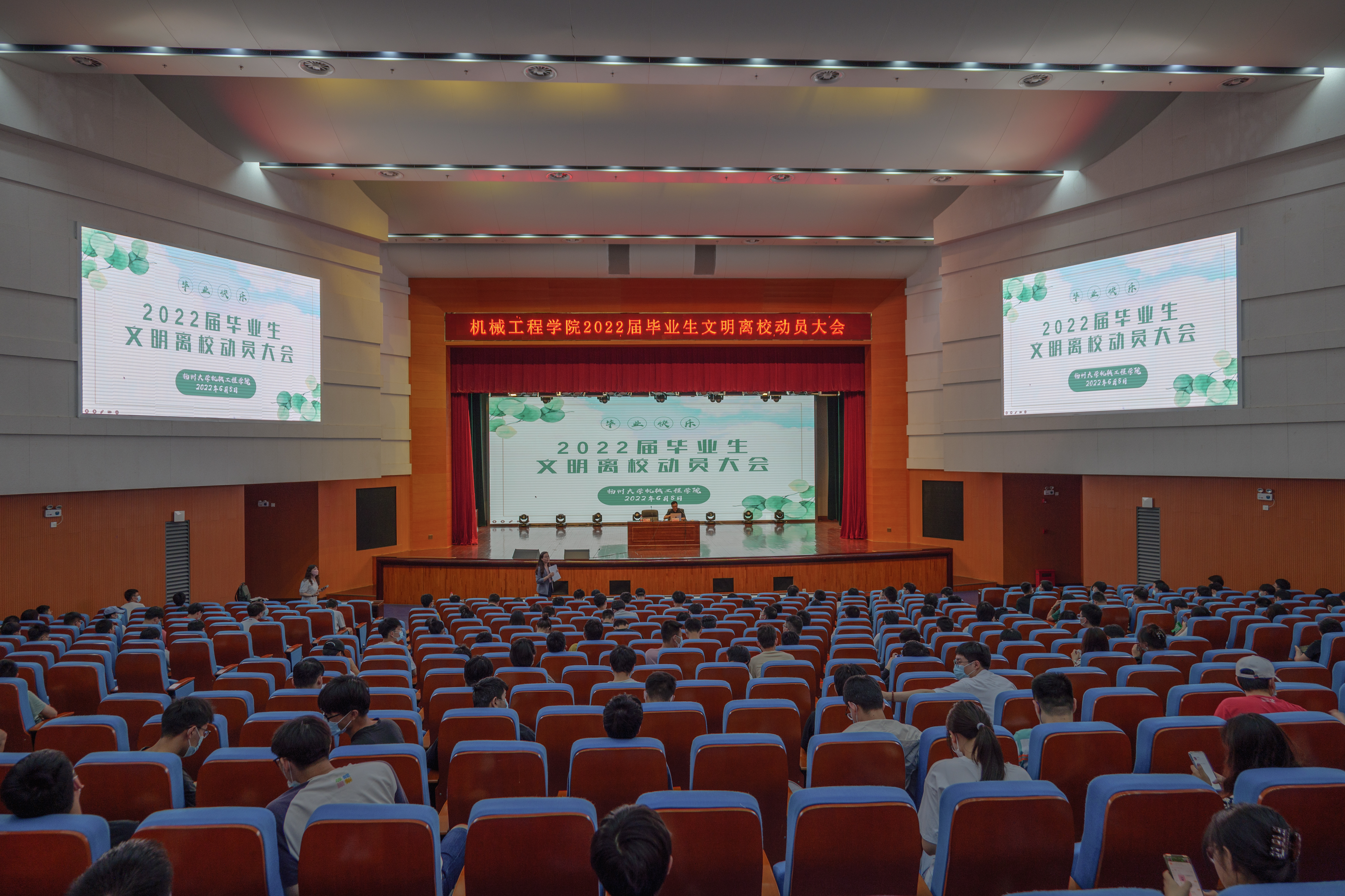 为确保毕业生安全文明离校,我院于6月8日在文体馆3楼报告厅举行毕业生文明离校动员大会。学院党委副书记张平、院团委副书记汪志国、毕业生辅导员苏慧及2022届全体毕业生参加大会,会议由张平副书记主持。