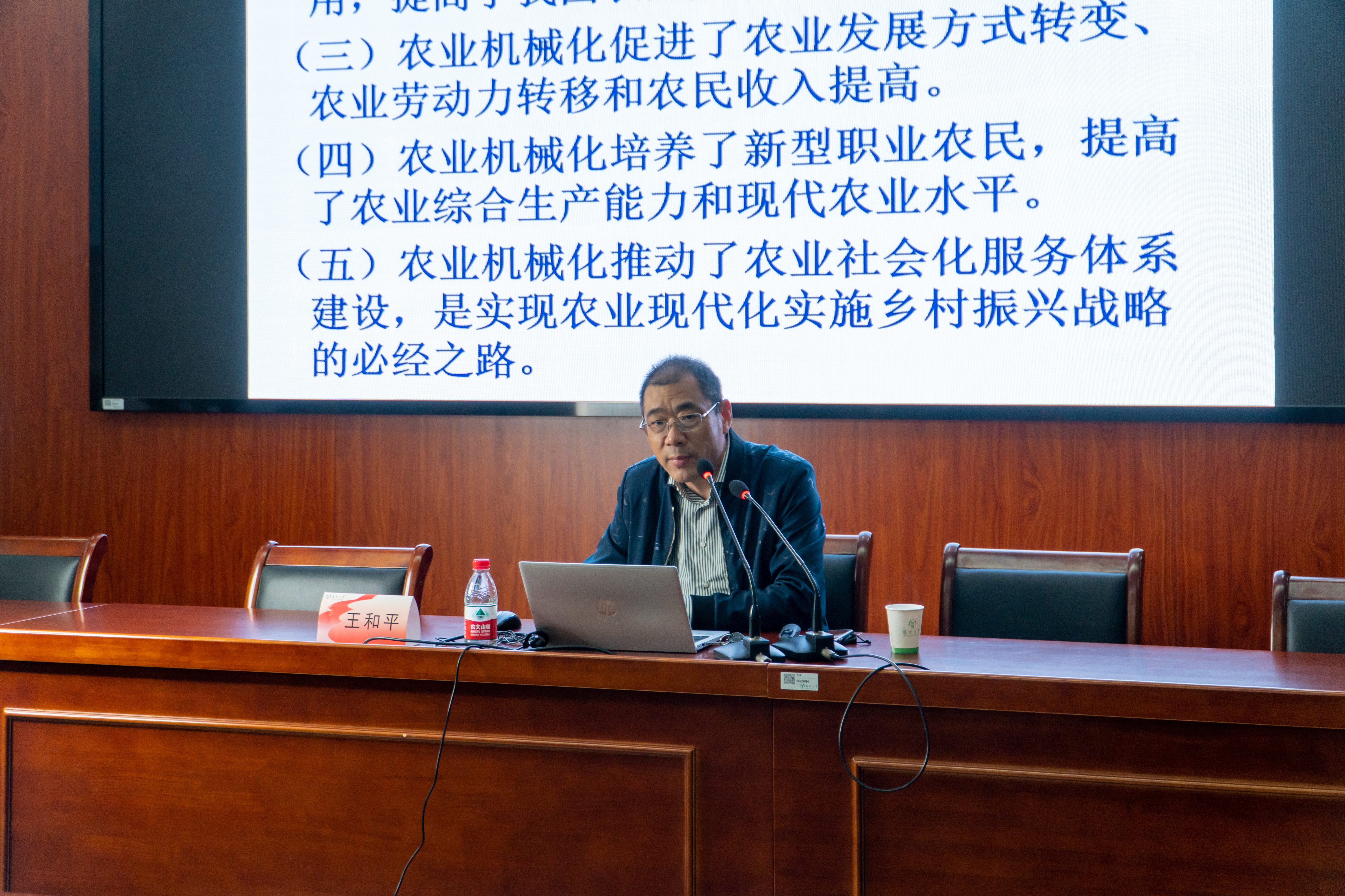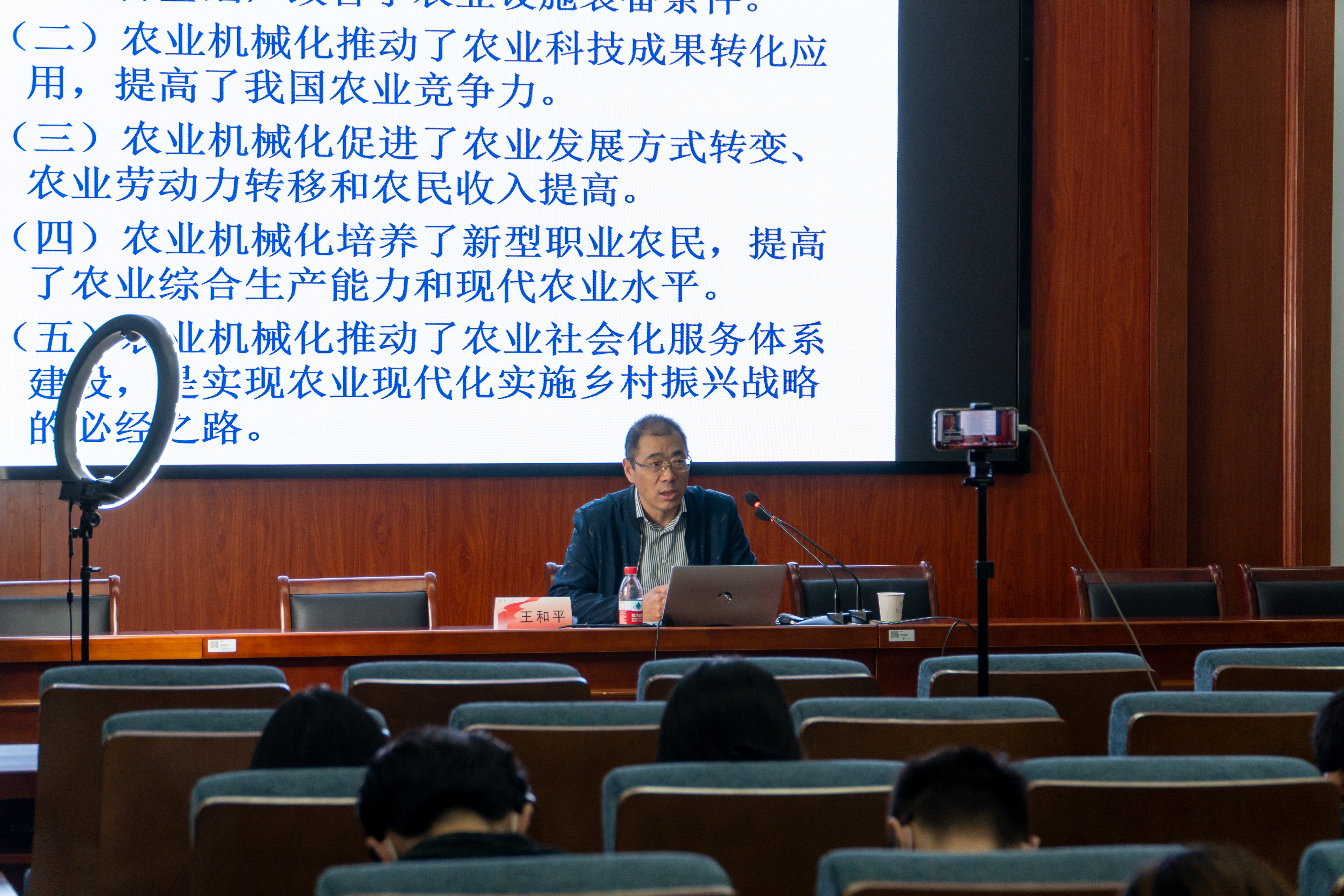 讲座中,王和平站长点明了发展农业机械化的重要意义,对农业机械化和农业现代化的涵义及作用进行详细解释;介绍了国内外农业机械的发展现状,以此为依据指出发展农业机械化的有利条件;讲解了农业机械化评价体系与阶段特征,简述了中级阶段农业机械化发展的格局变化。接着,王站长以各种农耕机具和机械化技术为实例,向同学们展示了粮食生产全程机械化技术,并从三个层面分析了智能化农业装备技术与应用。最后,王站长通过展现“十三五”江苏农机化发展成就和十四五农机化发展目标,向同学们分析了江苏省农机化发展形势。