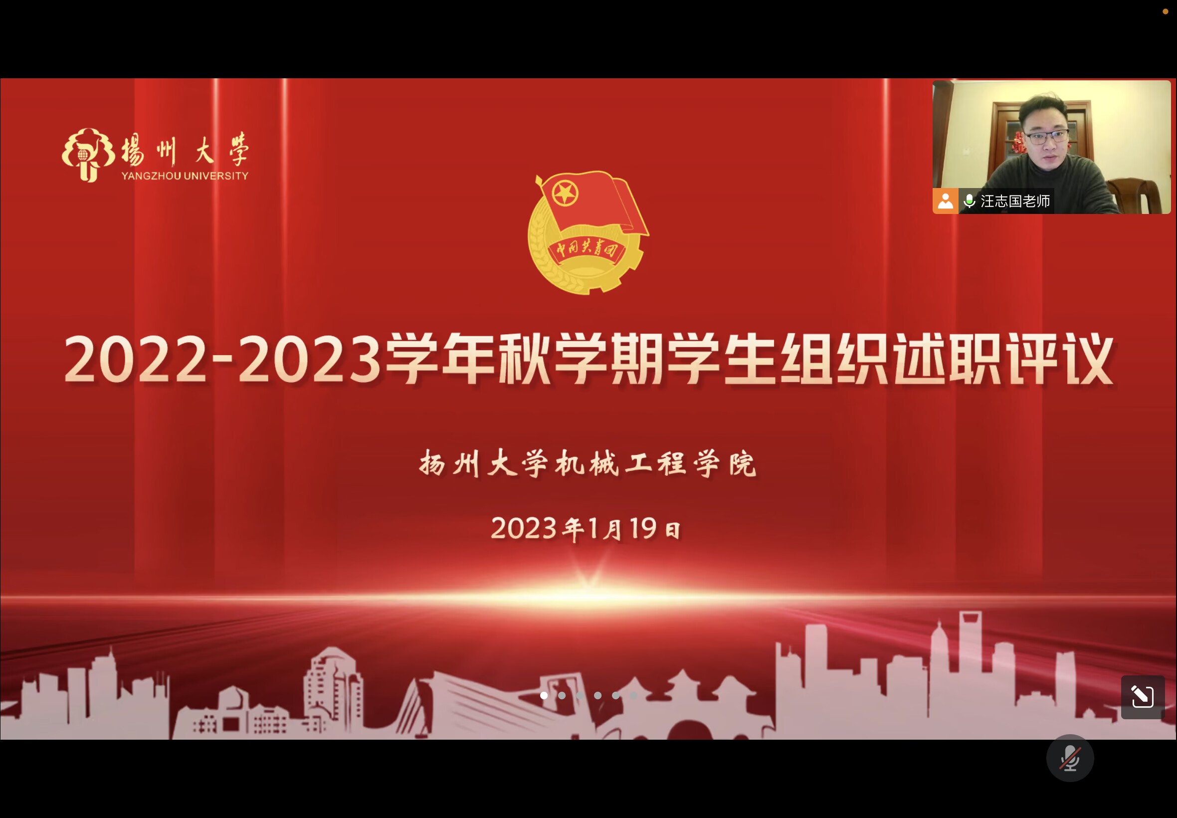 1月19日下午,我院线上举办2022-2023学年秋学期扬州大学机械工程学院学生干部述职评议会。院团委副书记(学工办副主任)汪志国、全体辅导员参加本次会议,院团委学生兼职团委副书记孙宇婕主持会议,学院六大学生组织部长及以上成员共同参会。