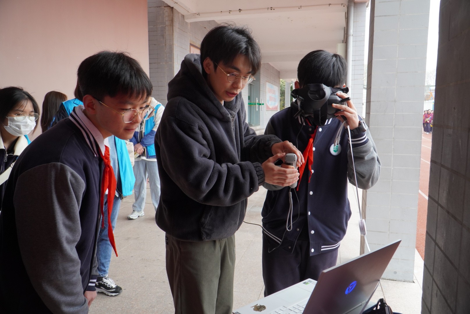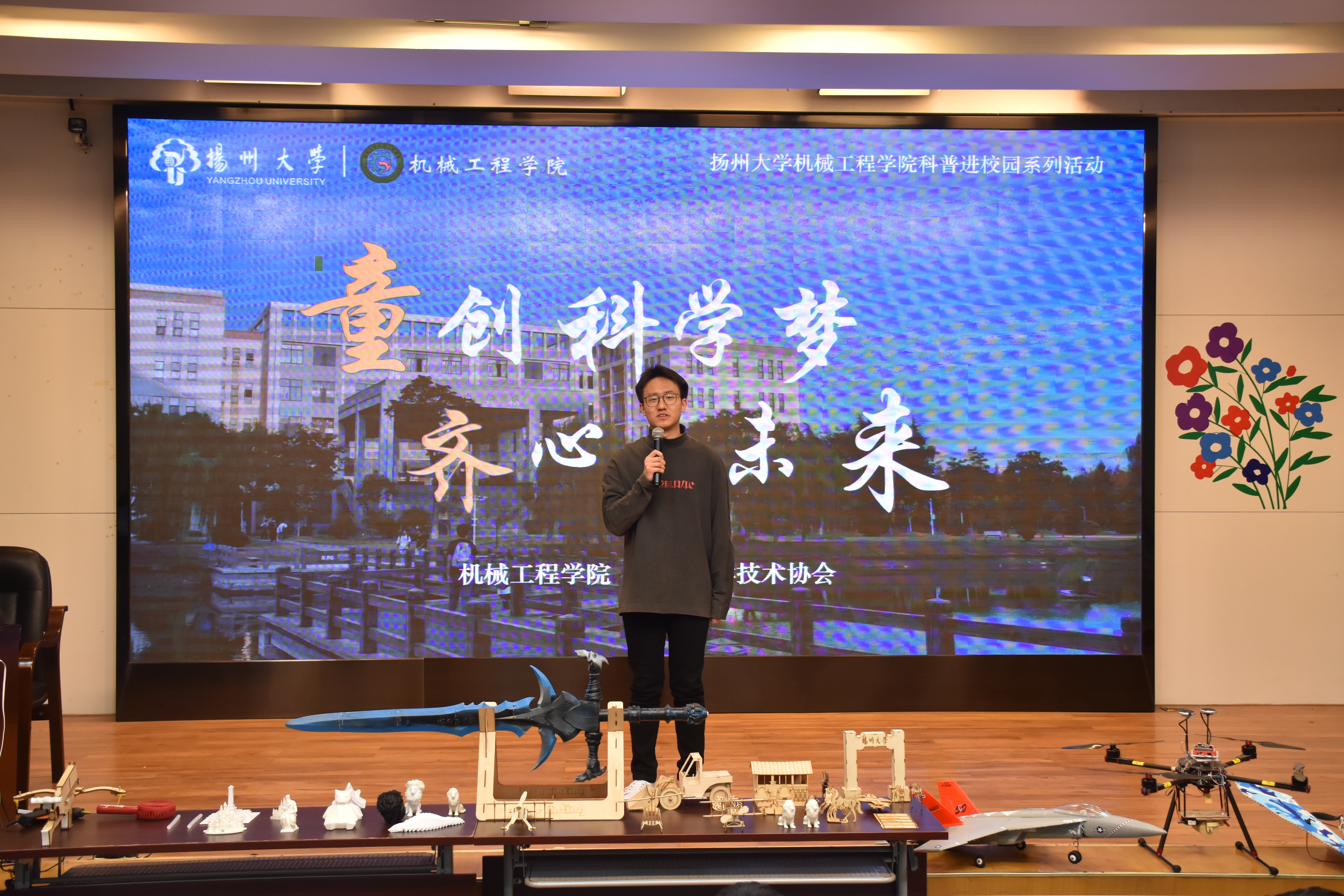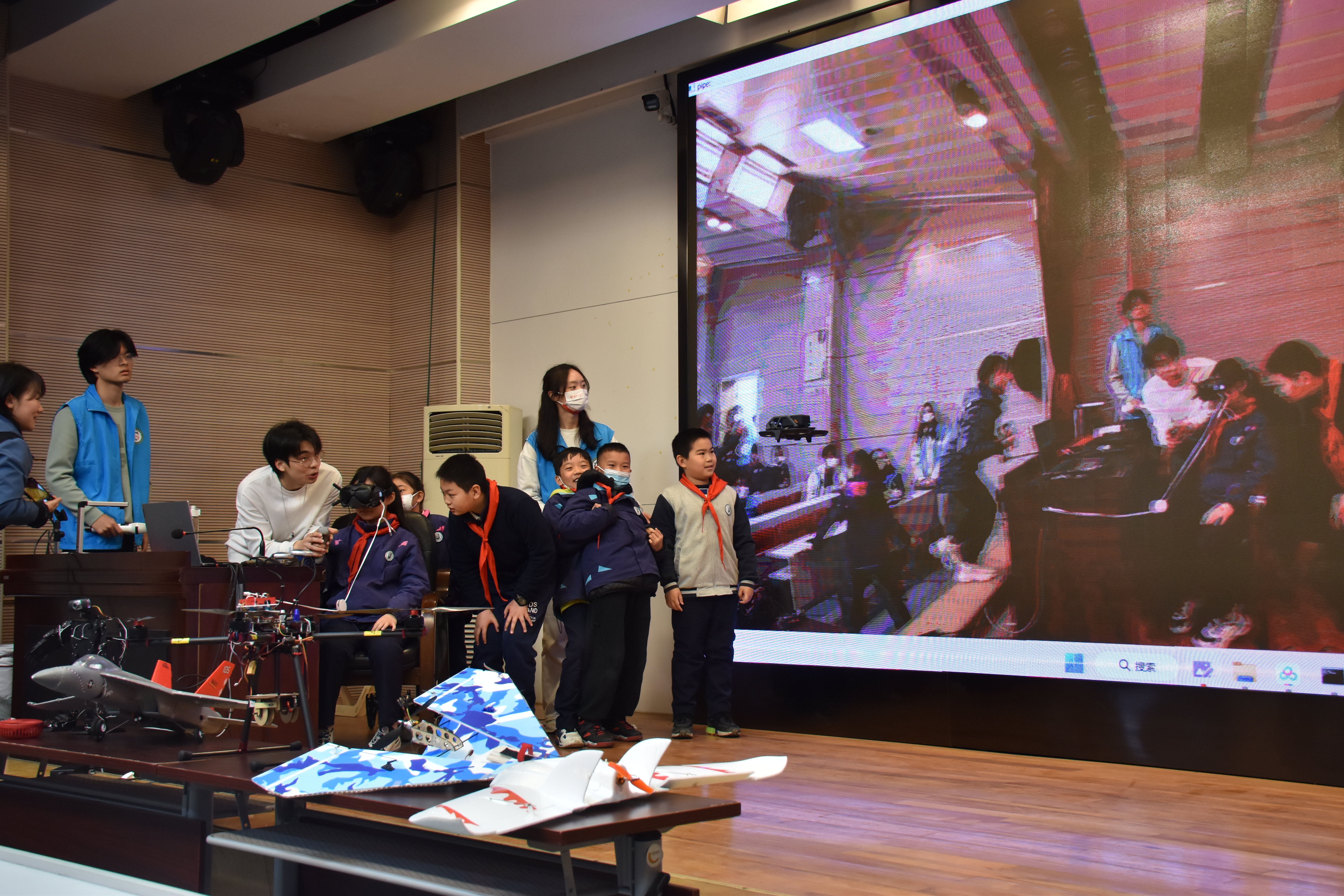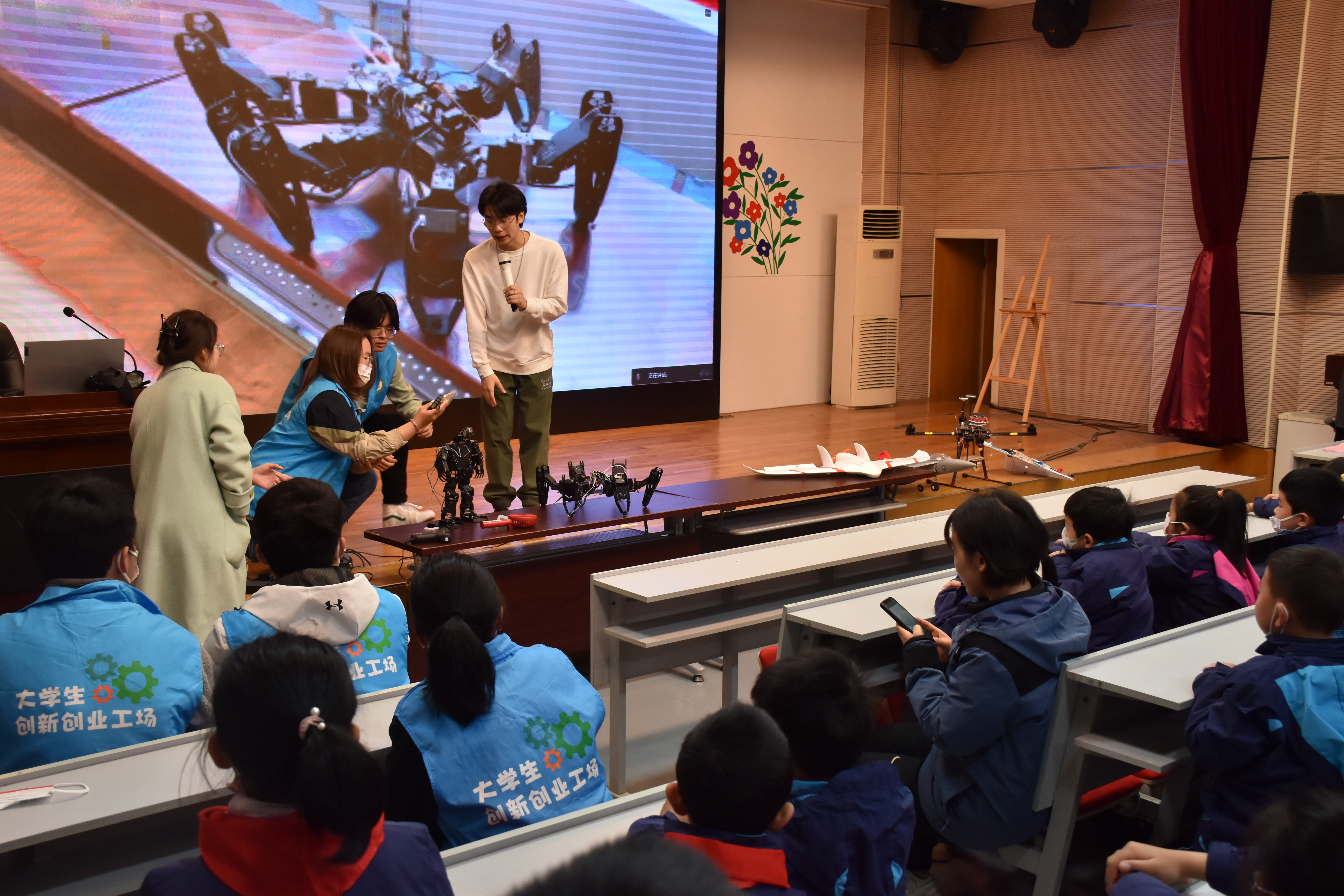 活动正式开始前,志愿者们向树人学校学生们展示了无人机航拍巡视校园的画面,并协助学生动手操控无人机。在多功能厅教室,活动正式开始,志愿者们通过播放视频、展示PPT等方式,向在场的小学生进行了3D打印、激光切割、机器人、航模等知识的科普分享。同时,志愿者们还开展现场问答、故事分享、热熔胶枪及无人机操作等互动环节,并向参与的学生发放小礼品,从而进一步激发他们对科创的兴趣。在场学生积极响应,现场氛围十分热烈。最后,学院志愿者们与现场参与师生合影留念。