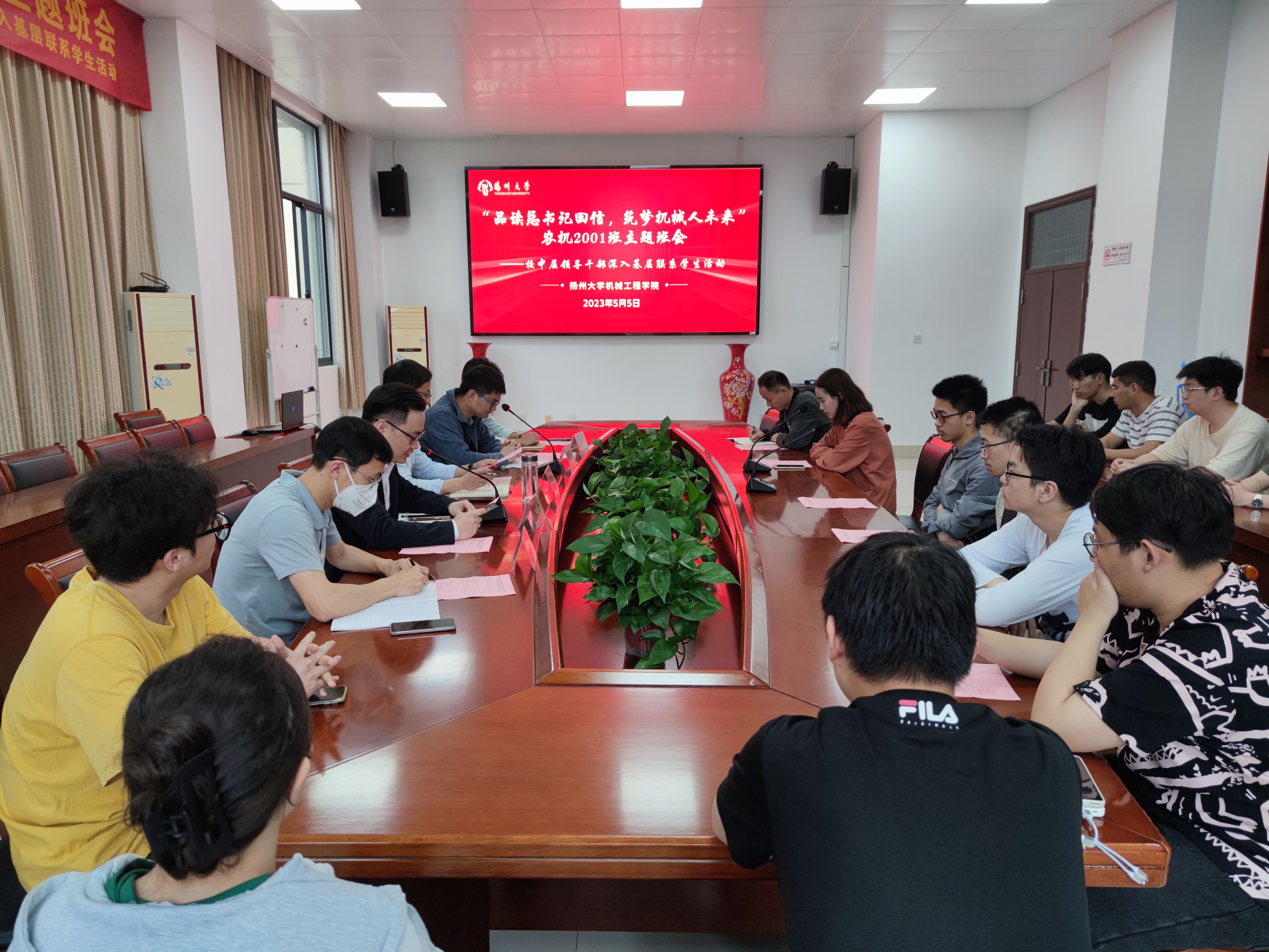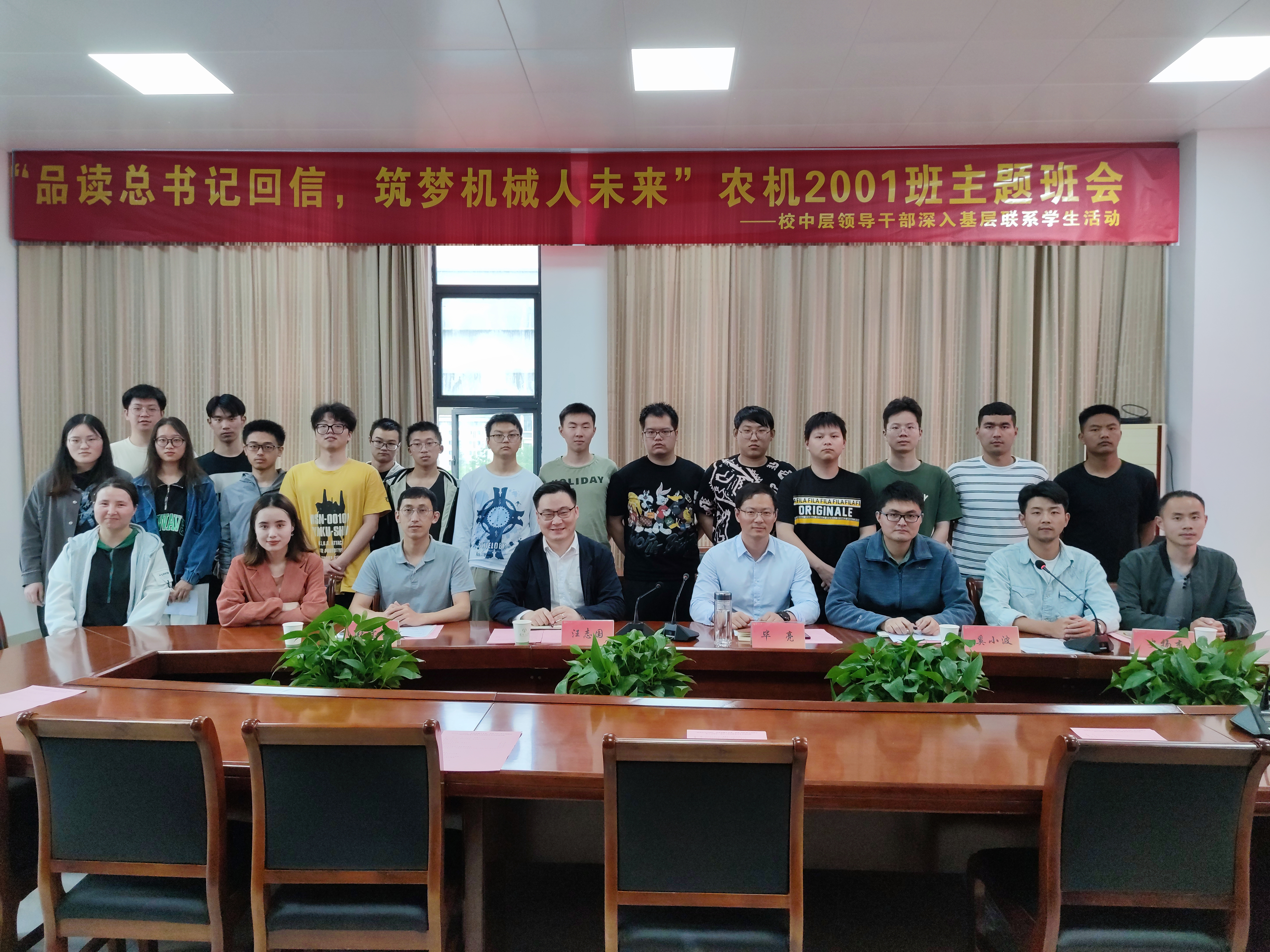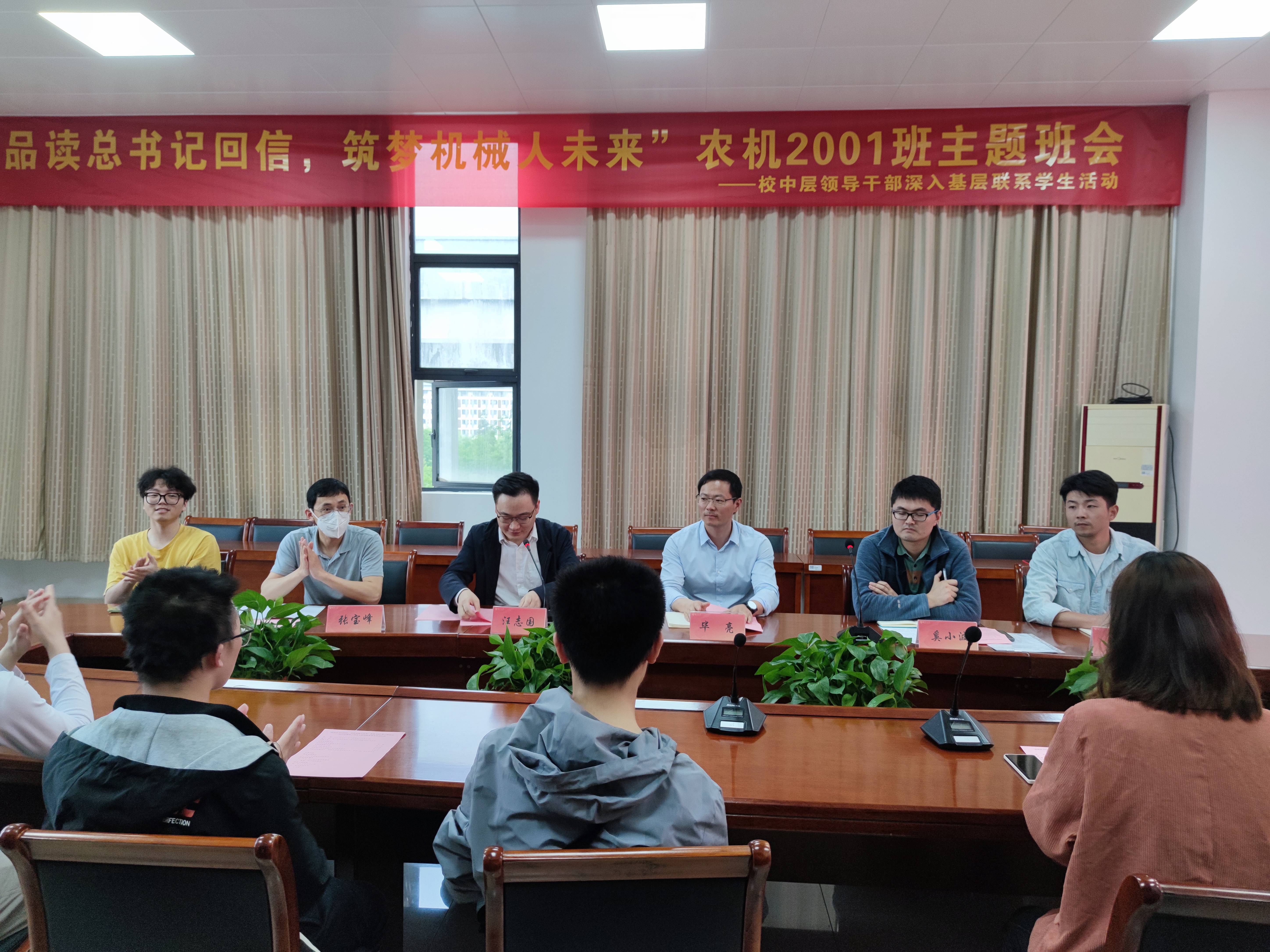 5月5日下午,我院于力行楼s318会议室举办了“品读总书记回信,筑梦机械人未来”农机2001班主题班会暨校中层领导干部深入基层联系学生活动。学院党委副书记毕亮出席活动并讲话,学院现代农业装备工程系主任奚小波,院团委副书记汪志国,农机2001班班主任张宝峰,现代农业装备工程系青年教师史扬杰,学院辅导员、农机专业优秀学生代表、农机2001班全体学生参加活动。
