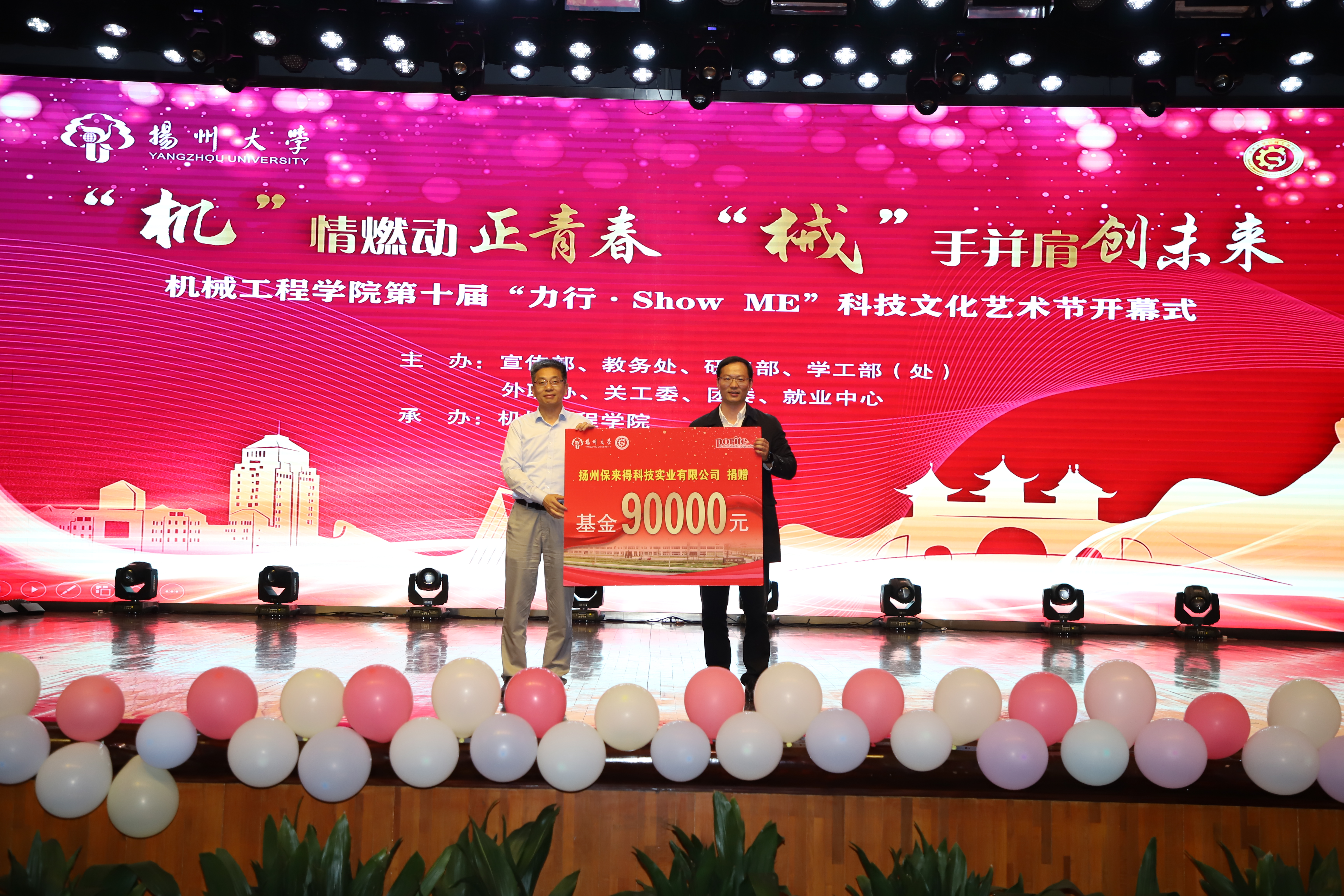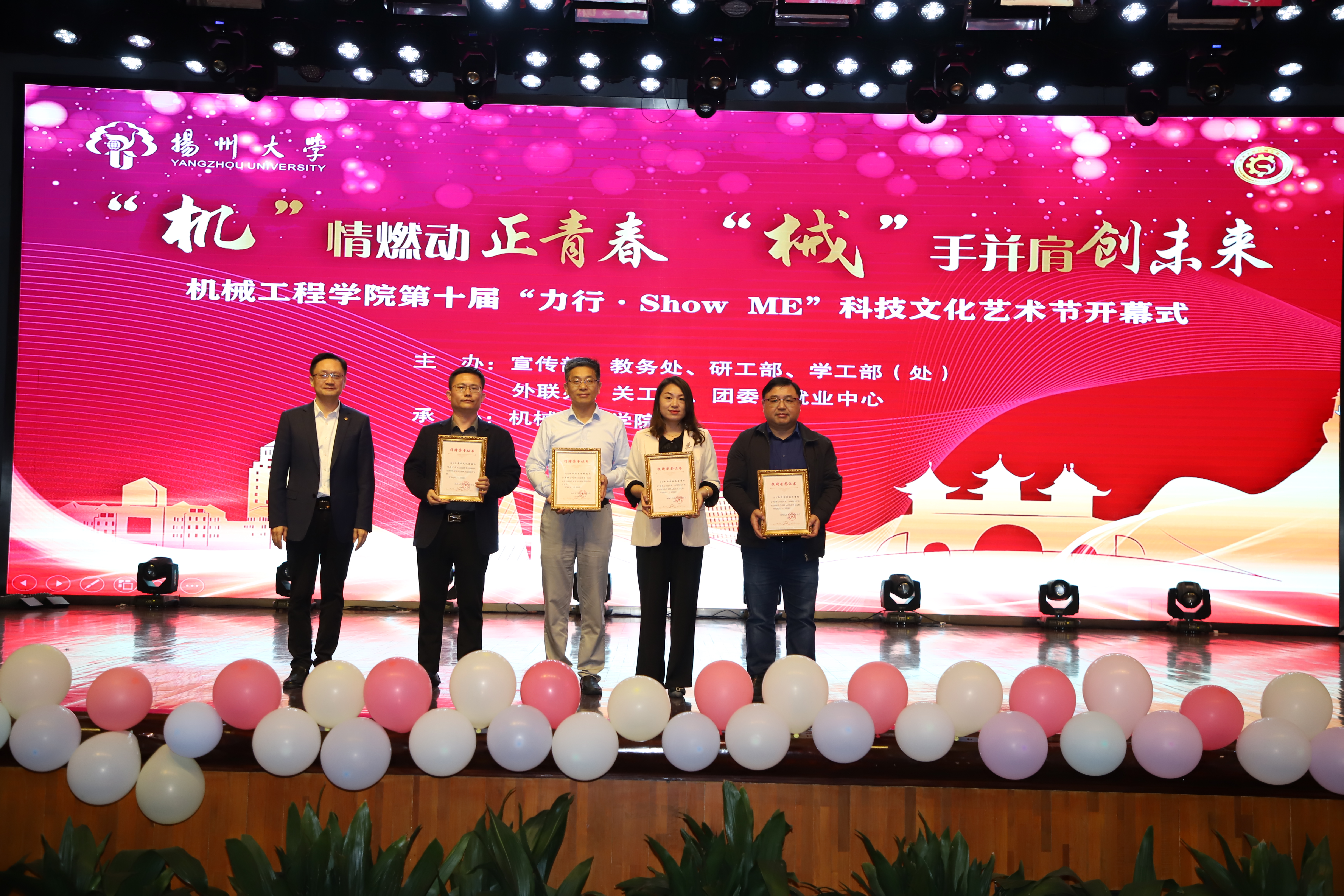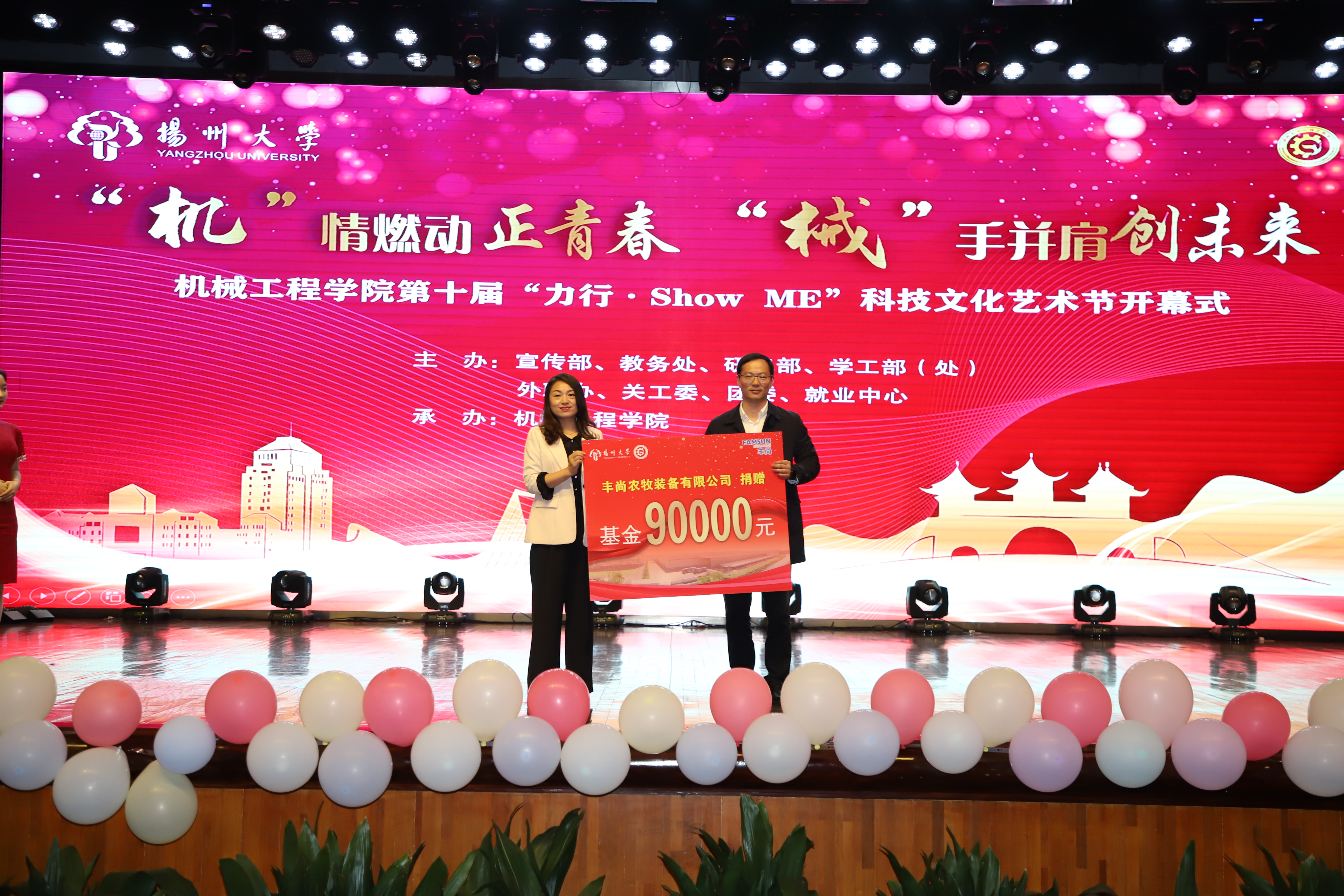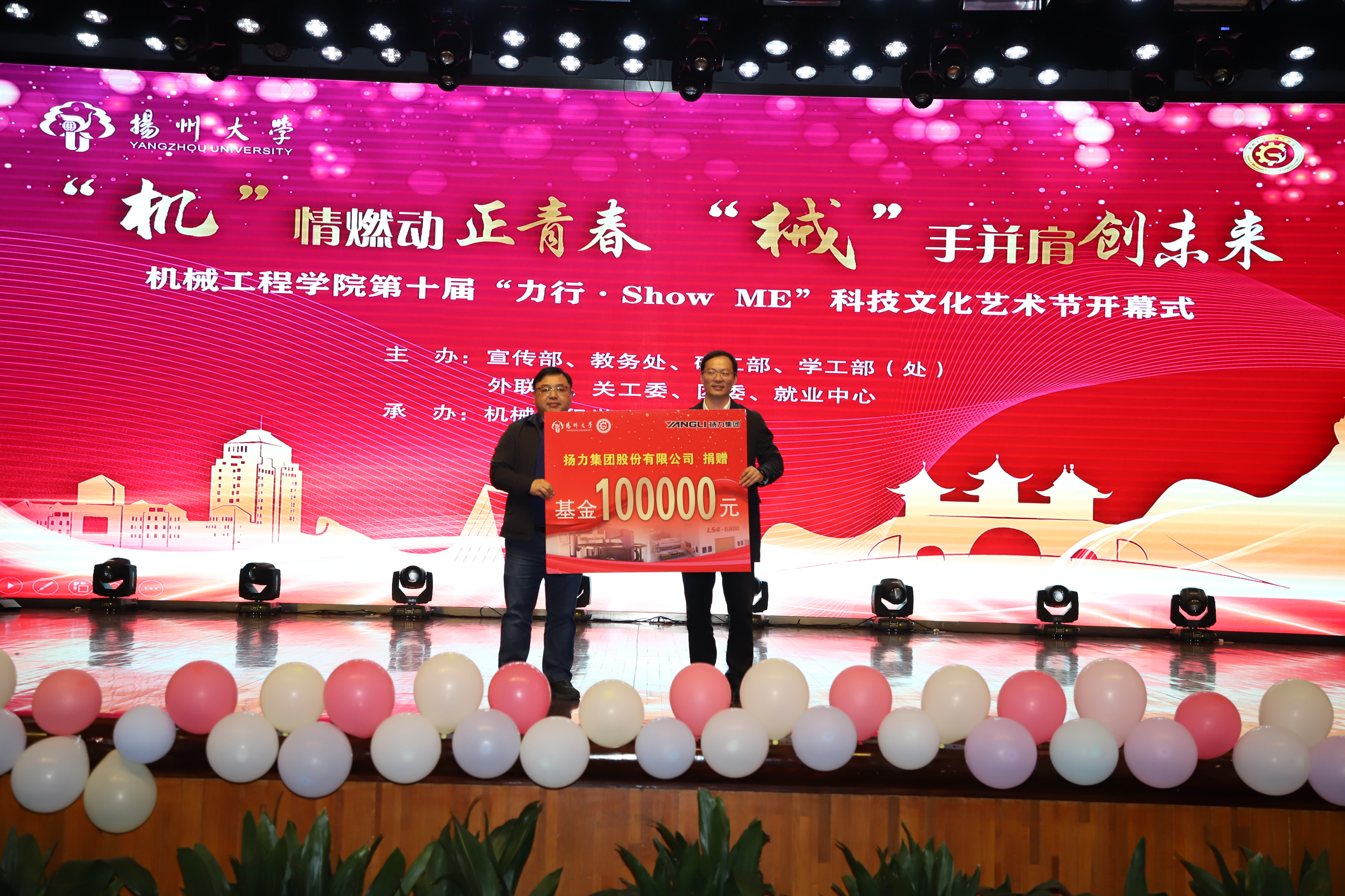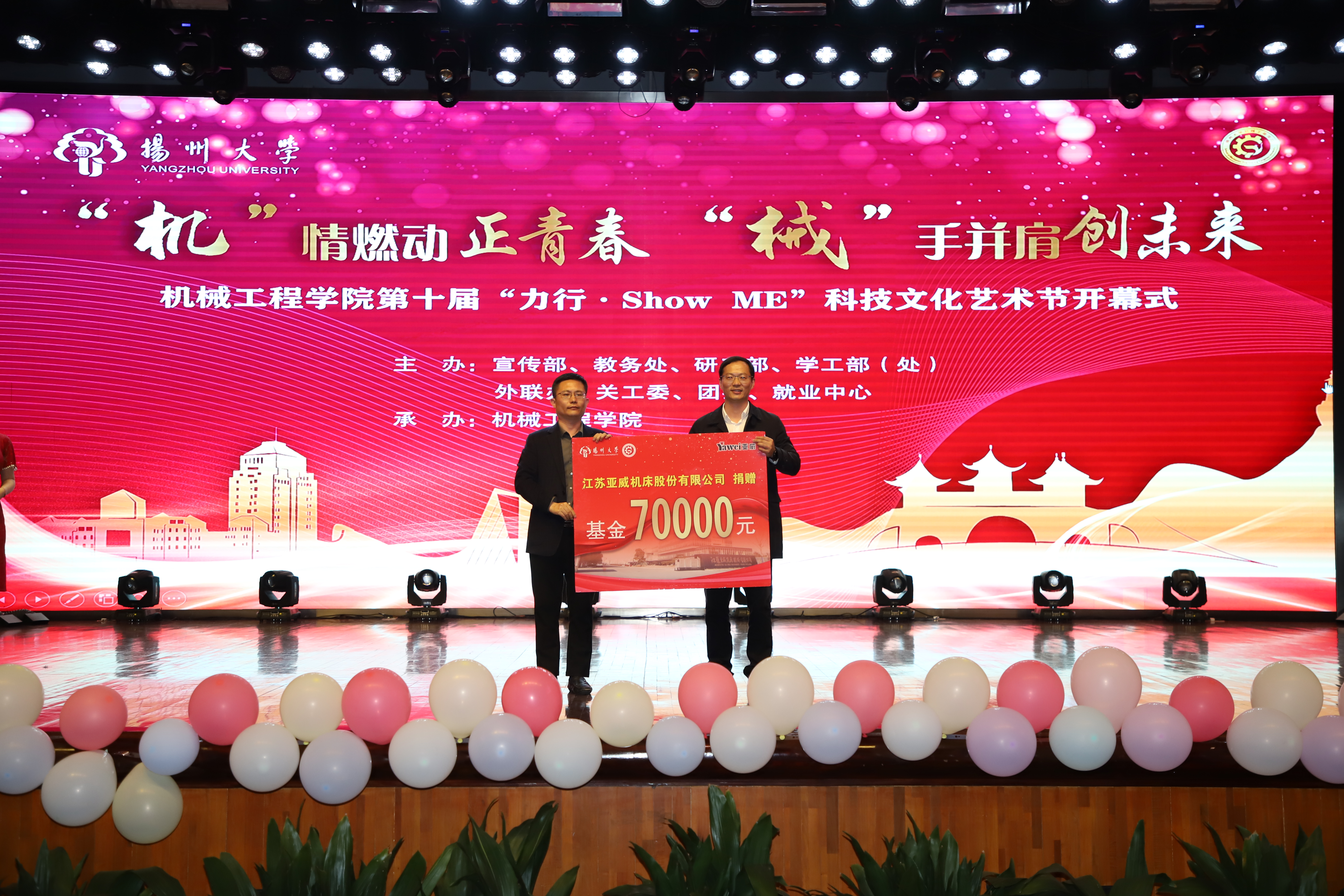 院党委书记尤玉军致开幕辞,回顾了历届科技文化艺术节的开展情况,并勉励学院师生秉持坚苦自立的校训和致知力行的院训精神,努力书写出不负时代、不负华年的青春答卷。活动中,吴刚部长与尤玉军书记为“双创一站式社区”揭牌;领导嘉宾先后为获奖师生颁发五亭桥缸套学生奖学金、“双创之星”“校园先锋”“扬州市优秀志愿服务组织”“考研之星”“最受学生欢迎的班主任”“最受学生欢迎的辅导员”等奖项。爱心企业为学院设立奖教基金35万,院党委副书记毕亮接受捐赠,陈克勤主任向企业代表颁发捐赠证书;孙进副院长对第十届江苏省大学生机械创新设计大赛备赛团队代表授旗。