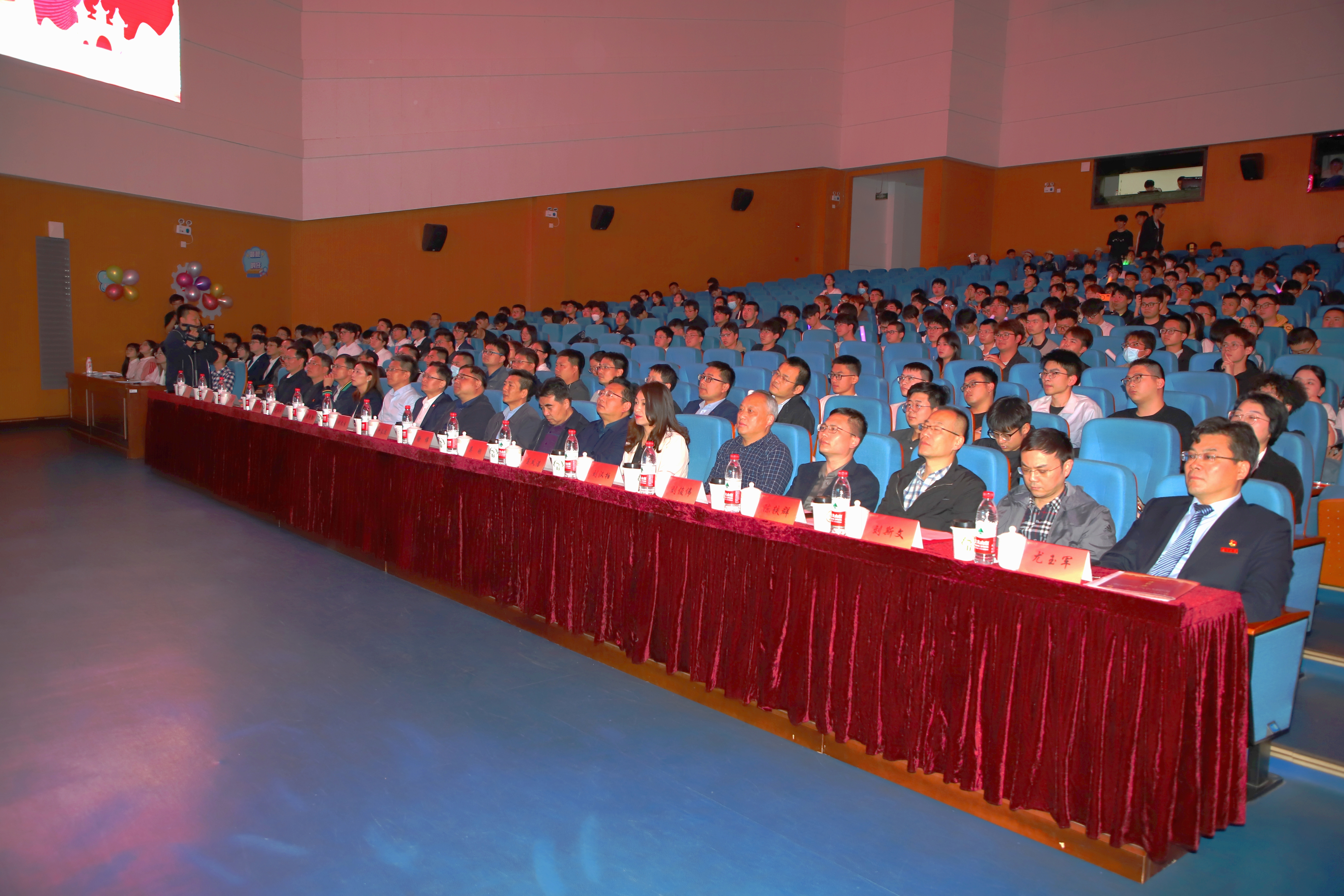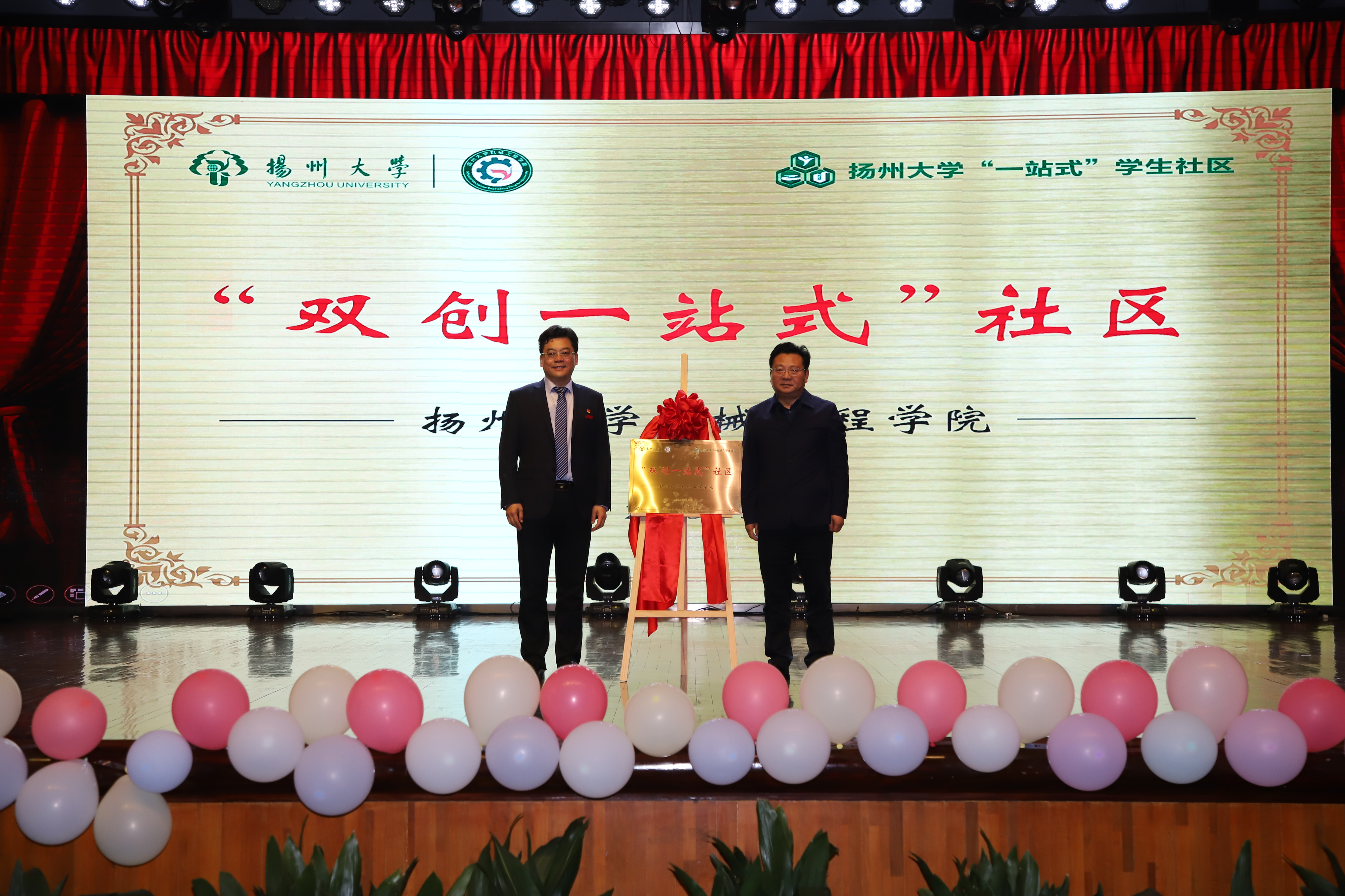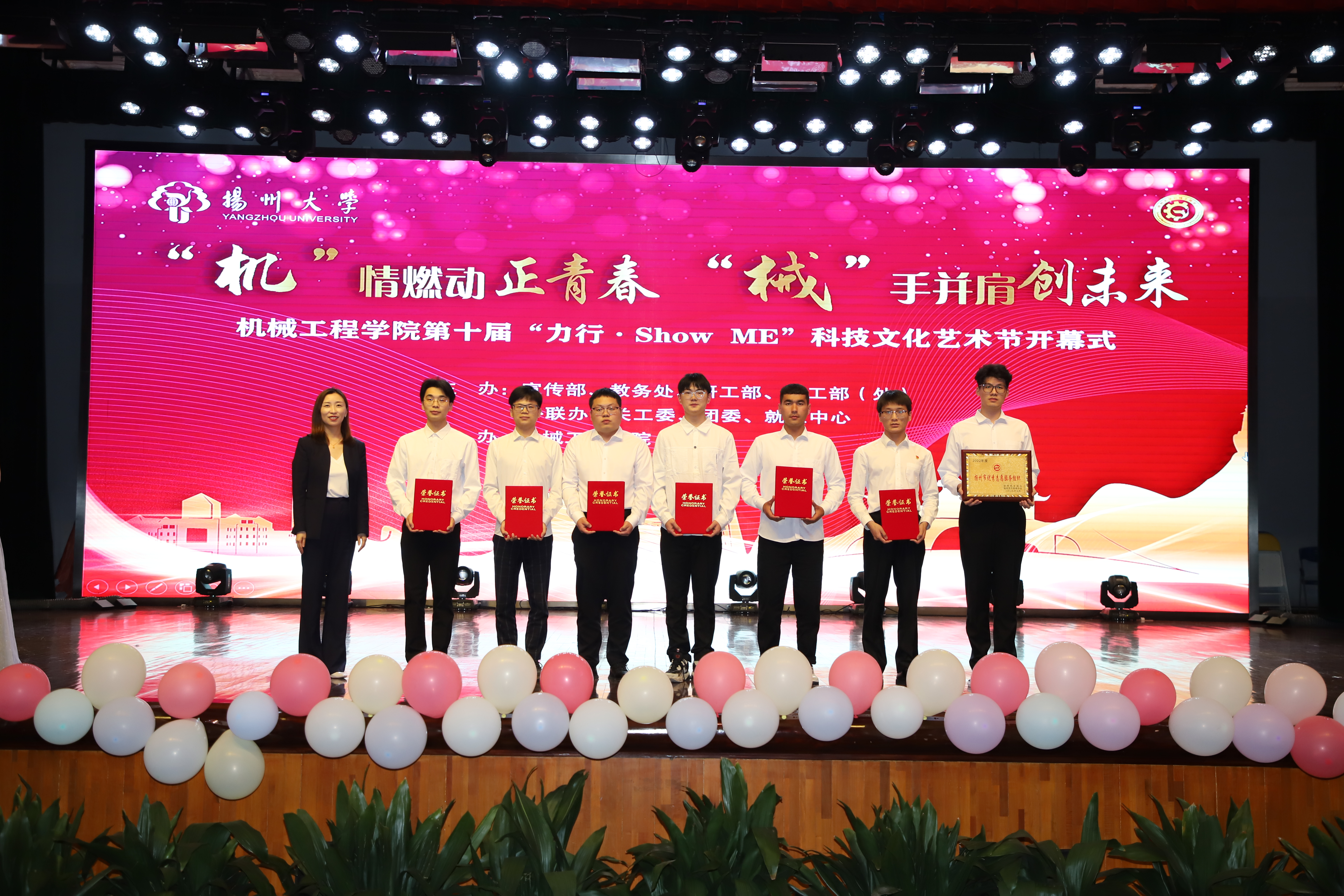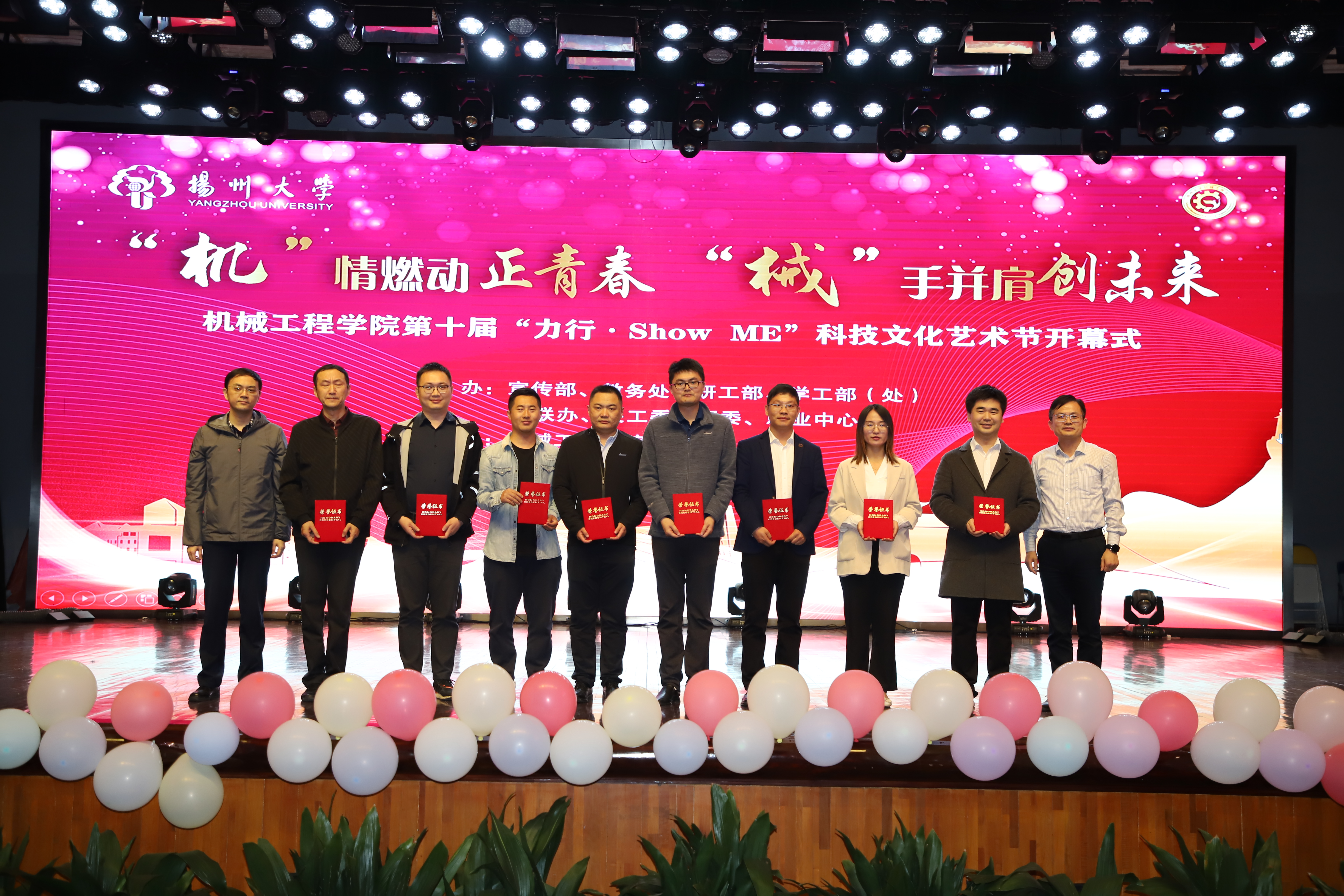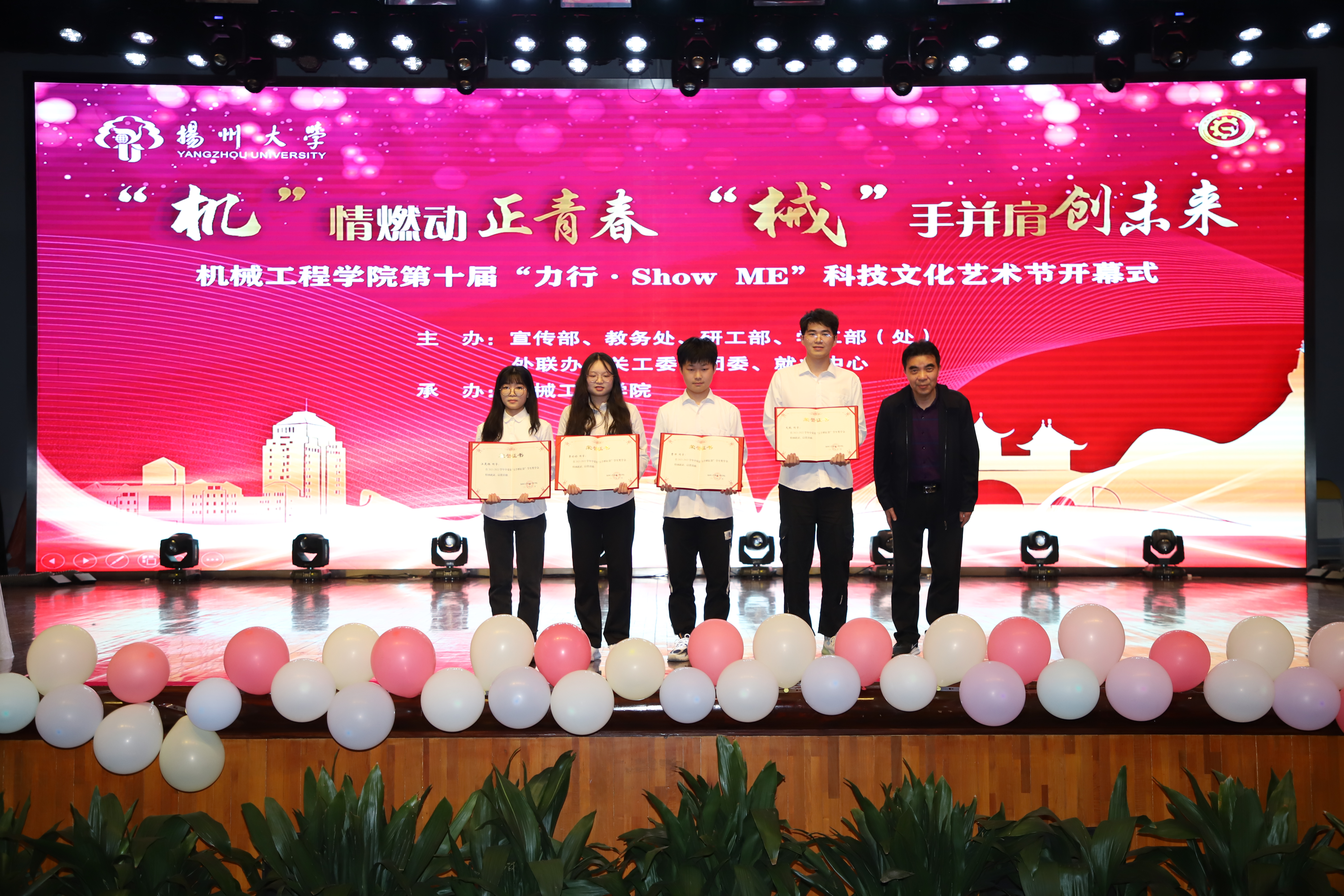 院党委书记尤玉军致开幕辞,回顾了历届科技文化艺术节的开展情况,并勉励学院师生秉持坚苦自立的校训和致知力行的院训精神,努力书写出不负时代、不负华年的青春答卷。活动中,吴刚部长与尤玉军书记为“双创一站式社区”揭牌;领导嘉宾先后为获奖师生颁发五亭桥缸套学生奖学金、“双创之星”“校园先锋”“扬州市优秀志愿服务组织”“考研之星”“最受学生欢迎的班主任”“最受学生欢迎的辅导员”等奖项。爱心企业为学院设立奖教基金35万,院党委副书记毕亮接受捐赠,陈克勤主任向企业代表颁发捐赠证书;孙进副院长对第十届江苏省大学生机械创新设计大赛备赛团队代表授旗。