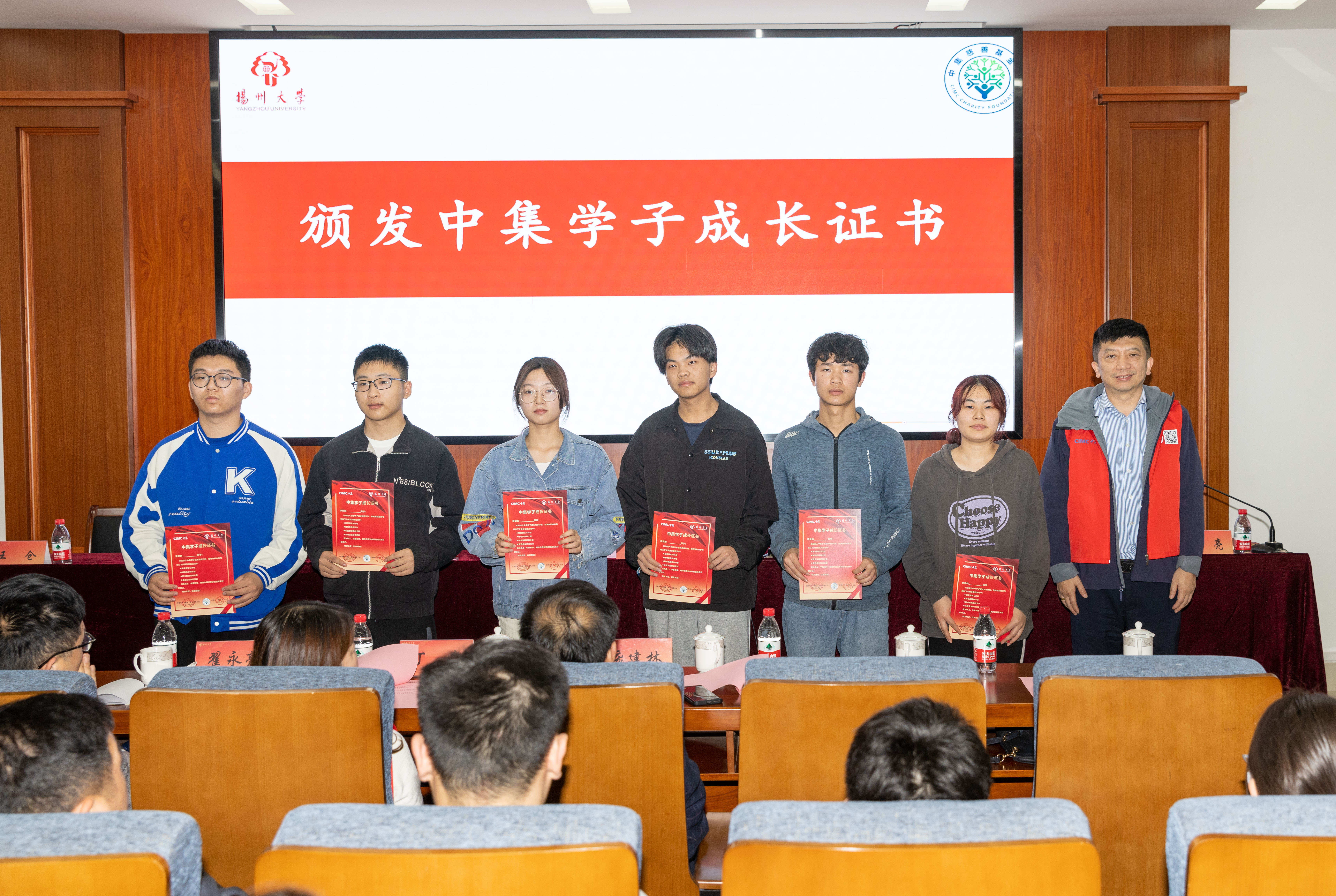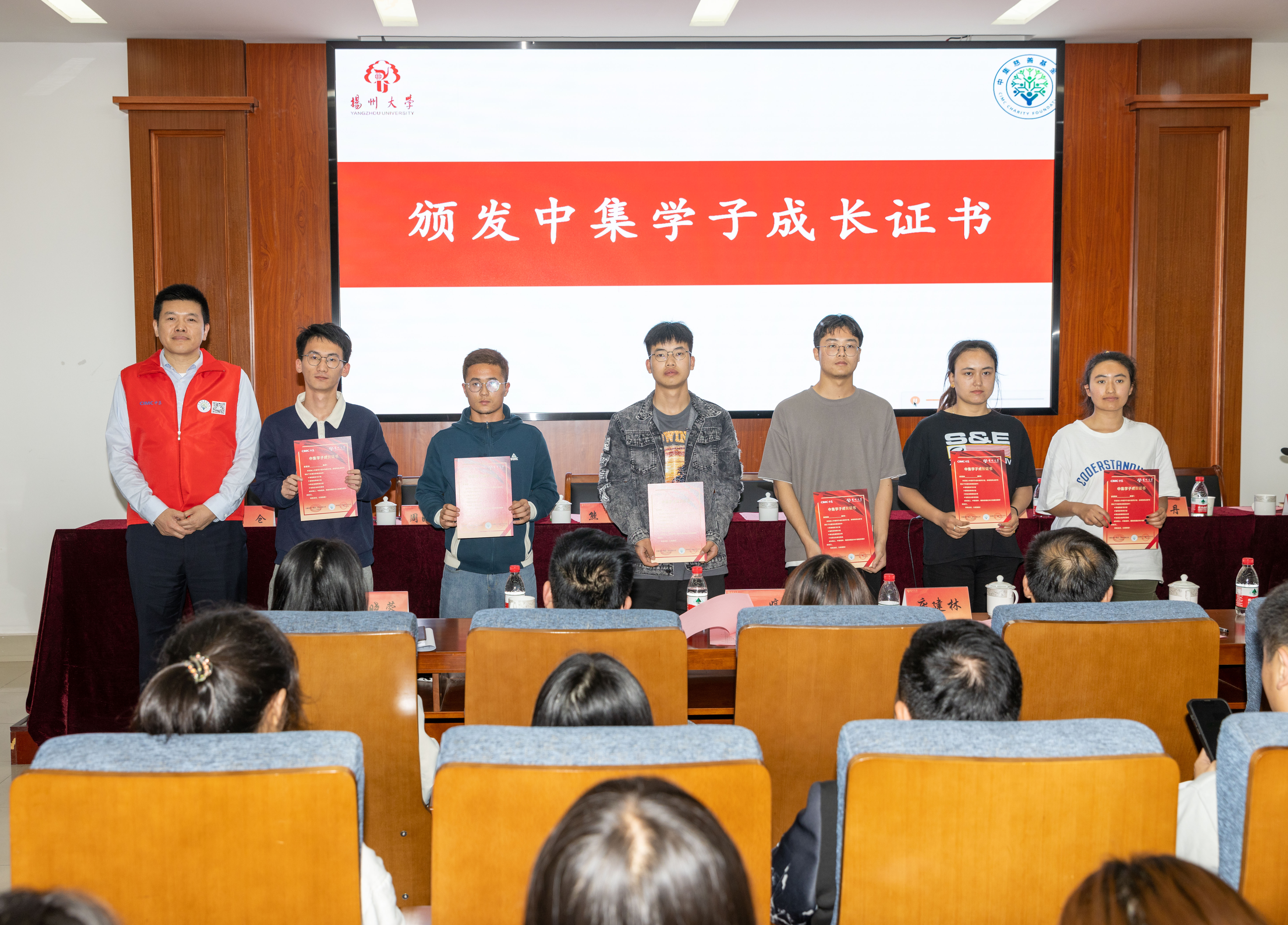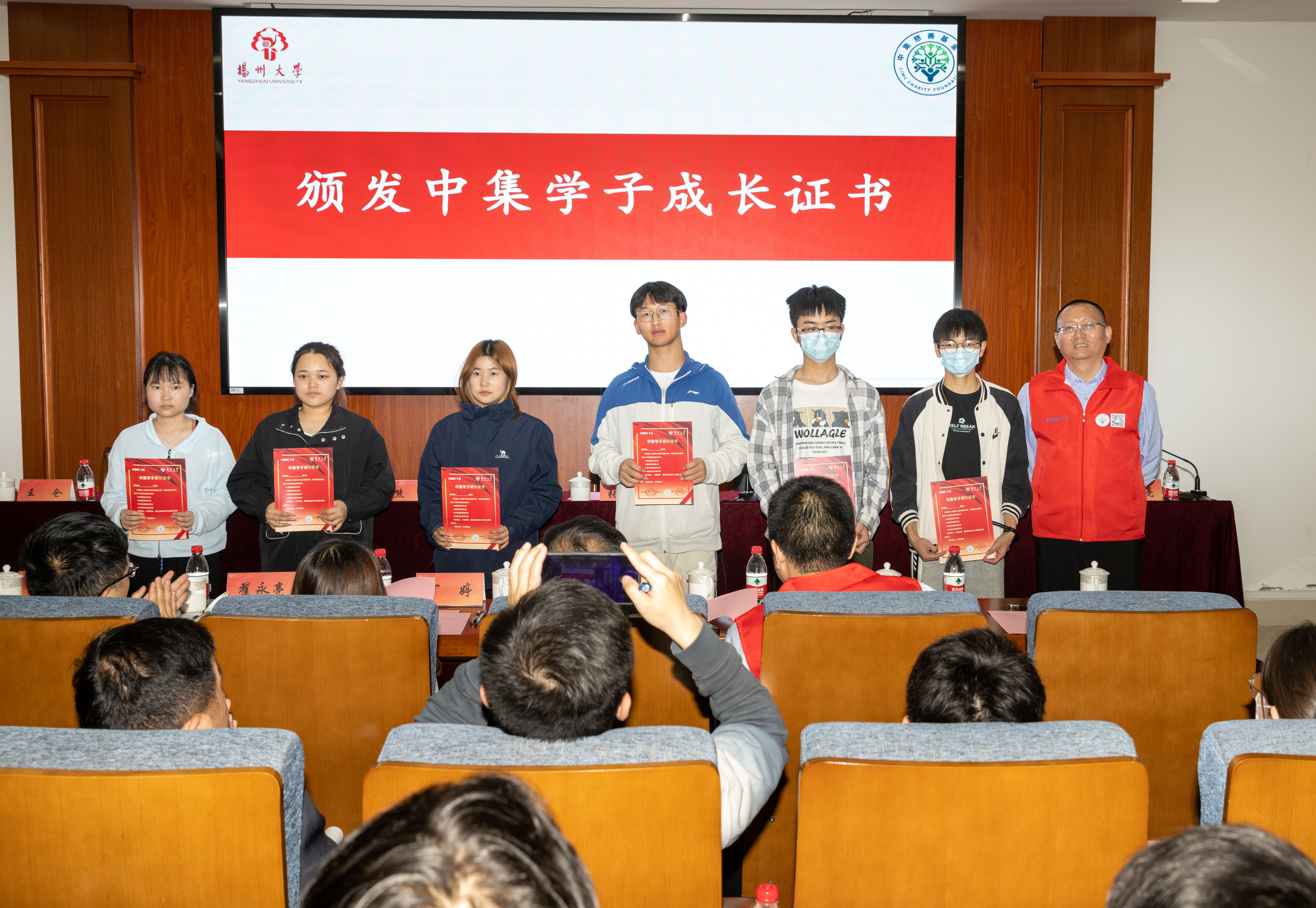 张力秘书长、周晓杰总经理、王仓副总经理向学生代表颁发中集学子成长证书,望学子们继续奋进。中集校友庞建林副经理向同学们分享了自身成长经历。随后基金会与学生进行交流座谈,张力秘书长等基金会领导为同学们答疑解惑,拉近了基金会与同学们的关系,帮助其确立了今后的奋斗方向。活动最后,中集集团向全体学生赠送纪念品并合影留念。