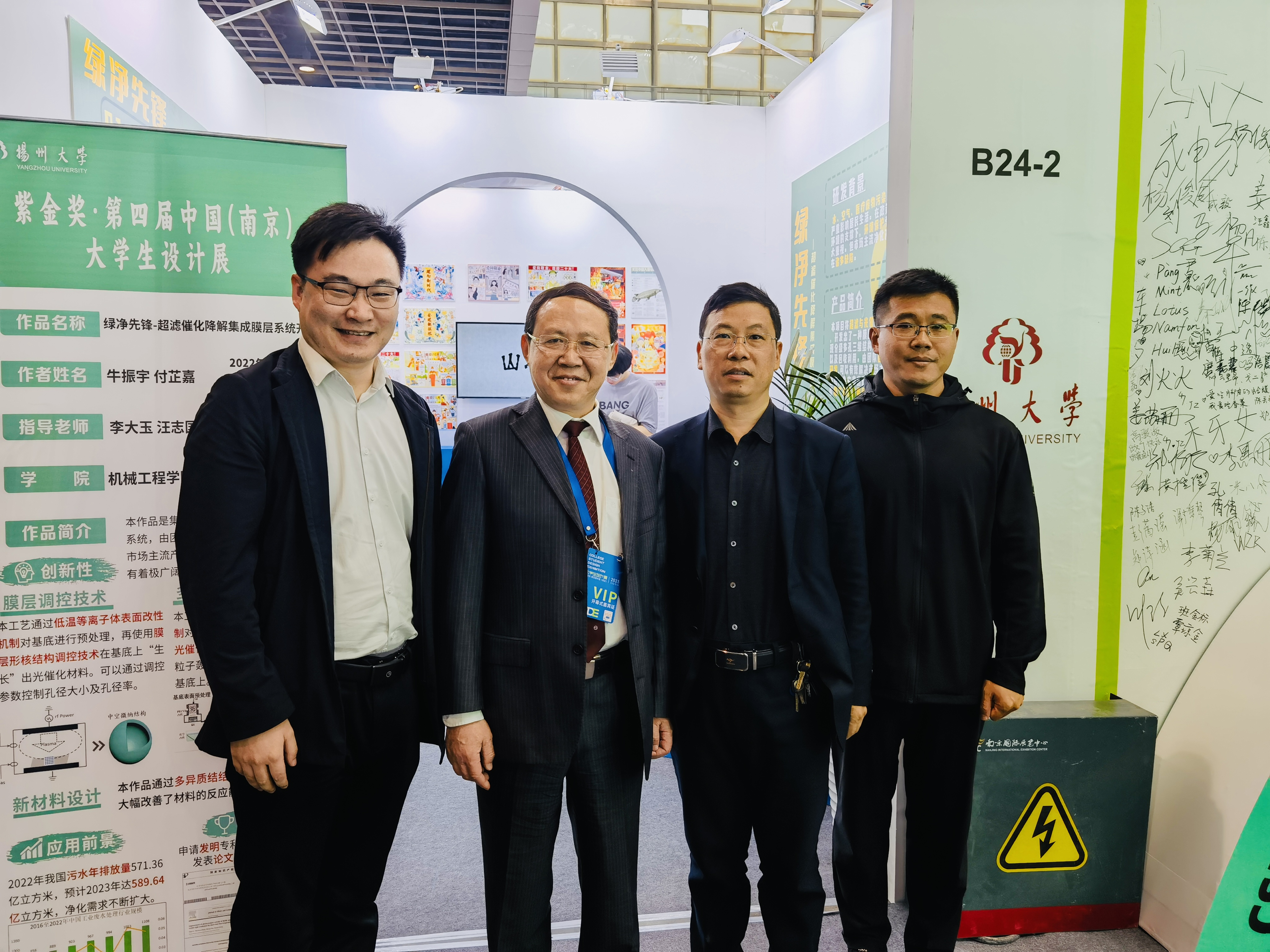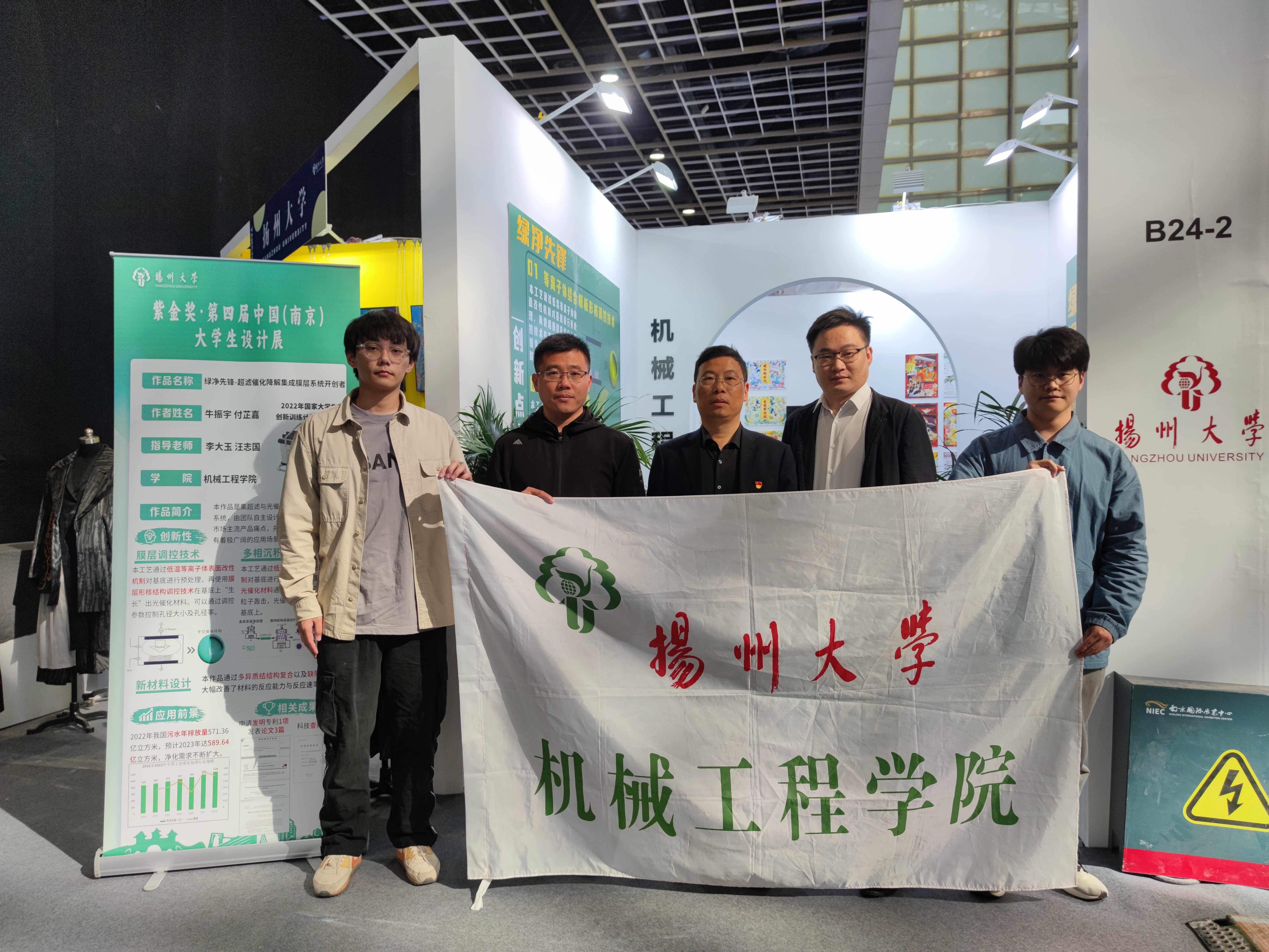 5月12日上午,学院副院长孙进、材料工程系主任李大玉、院团委副书记汪志国及学生代表前往南京国际展览中心参加紫金奖·第四届中国(南京)大学生设计展。我院作品“绿净先锋——超滤催化降解集成膜层系统开创者”受邀在展会进行展示。