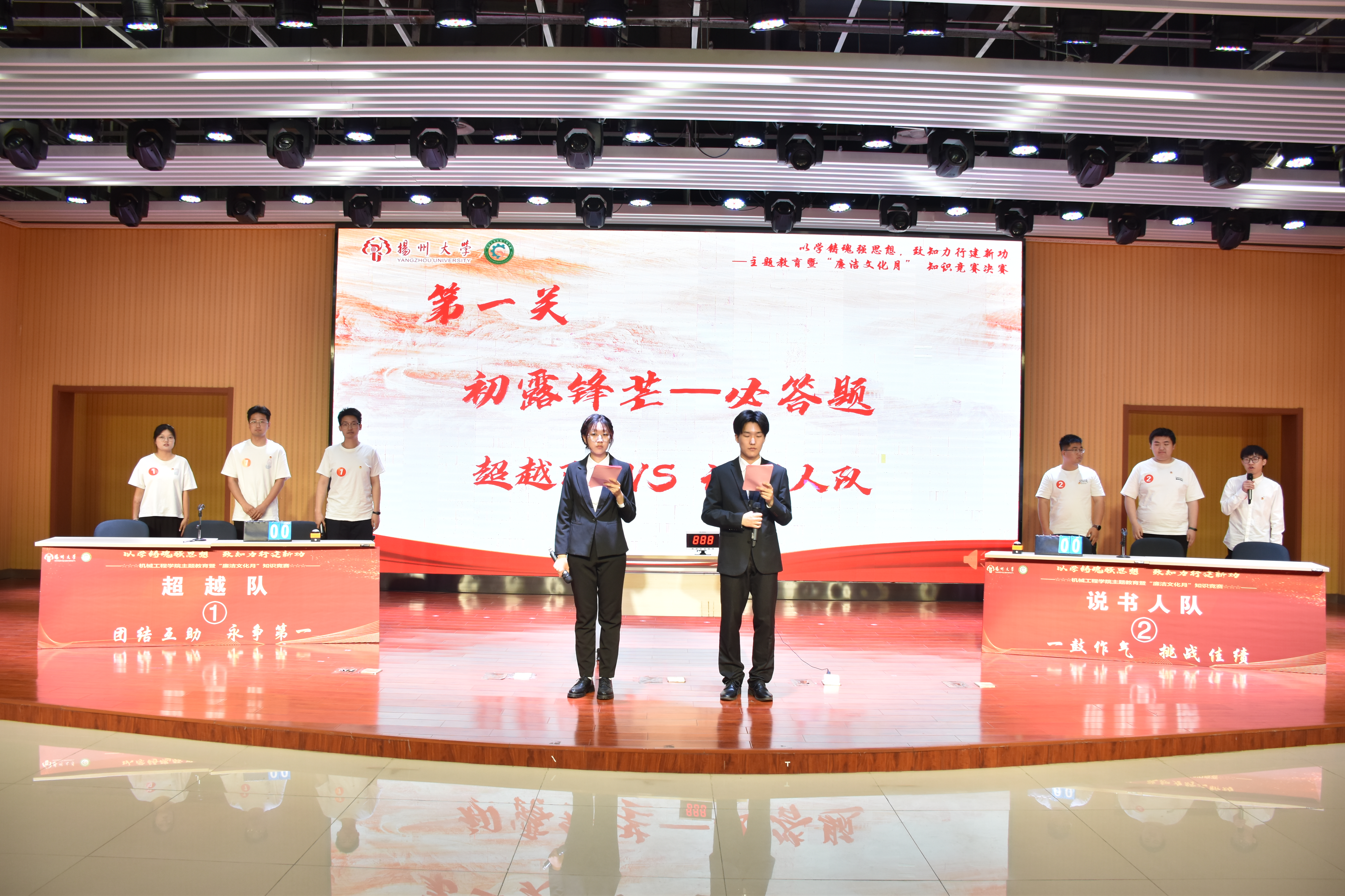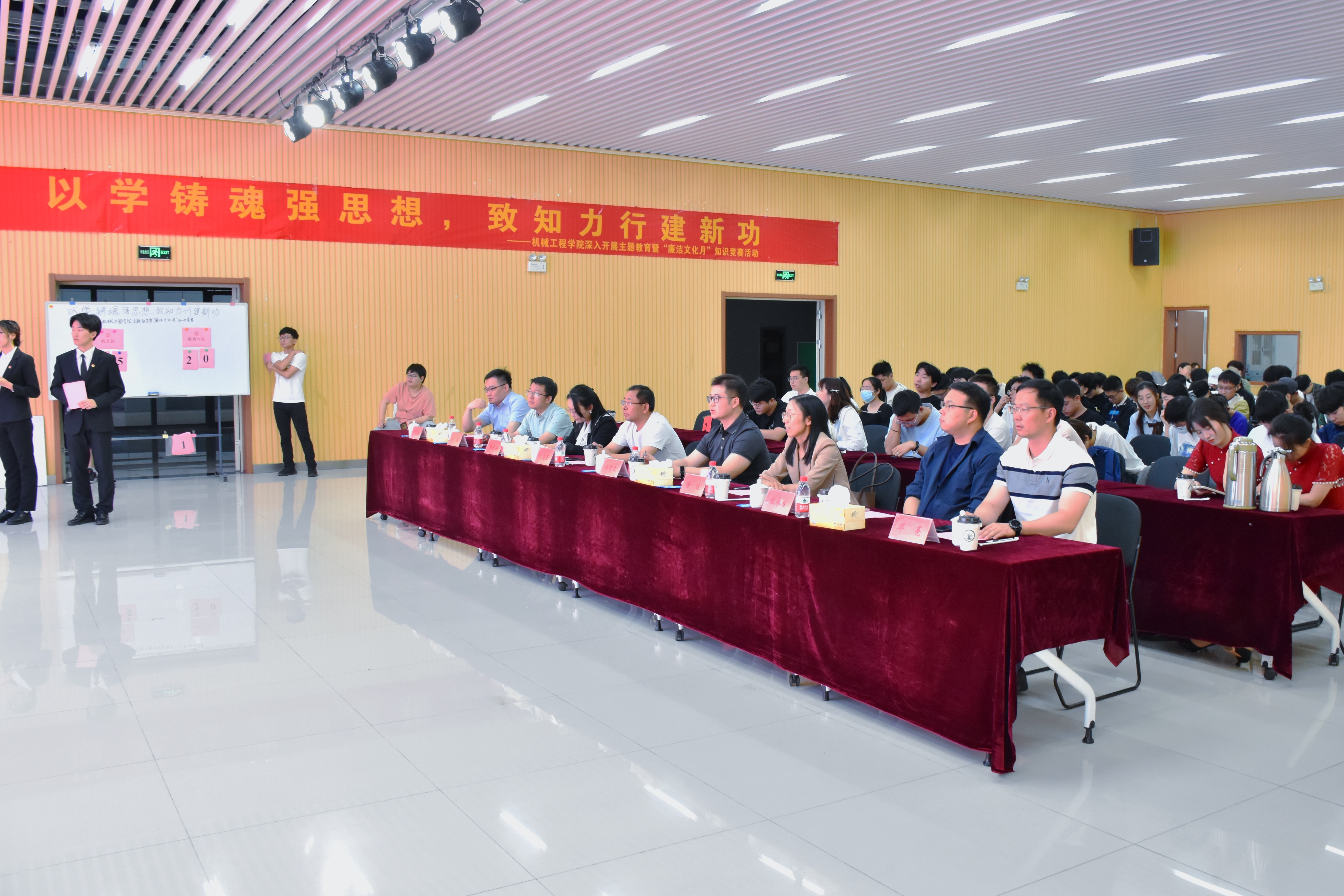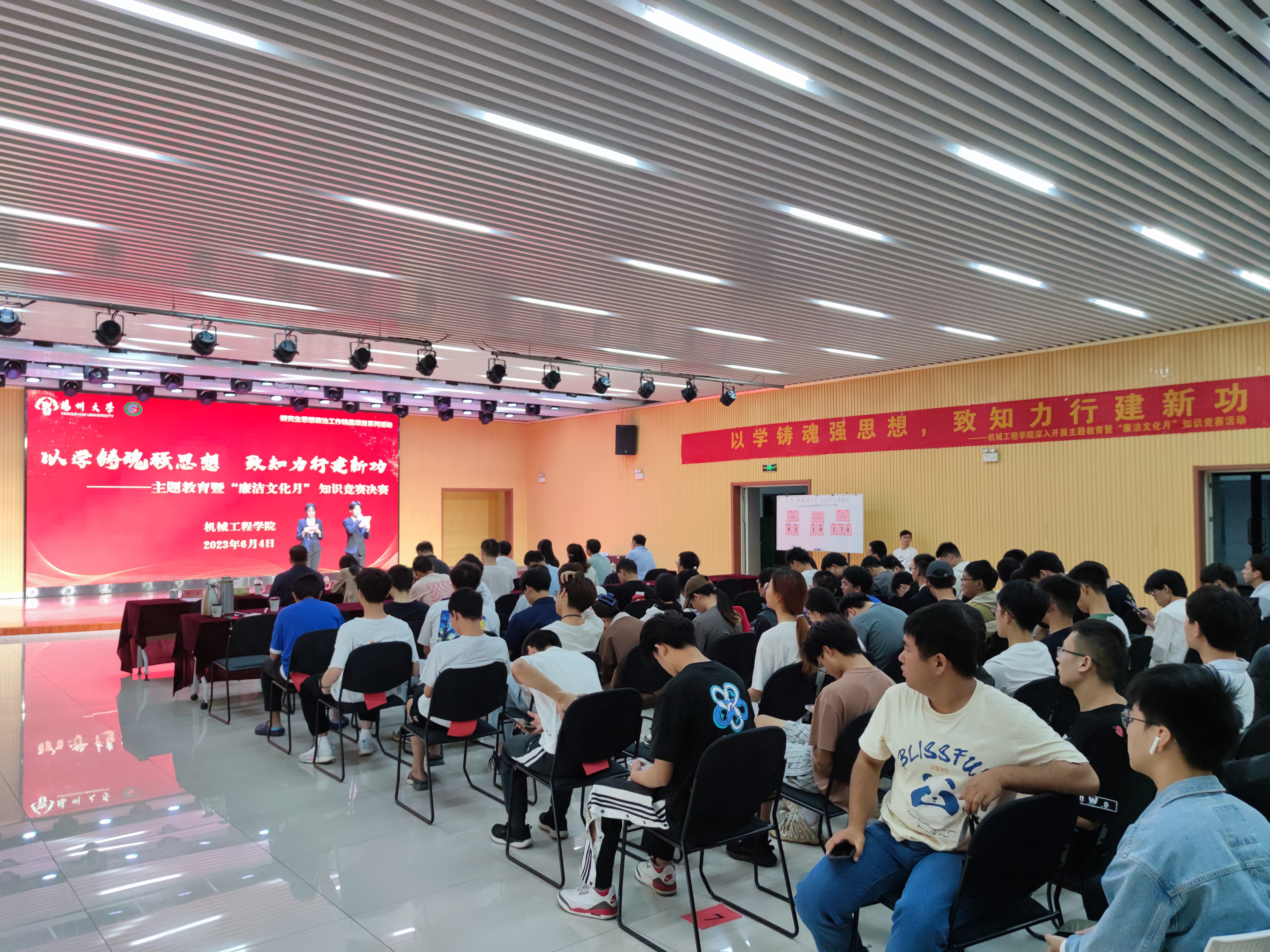 6月4日上午,我院于扬子津校区文体馆智慧就业大厅举办“以学铸魂强思想,致知力行建新功——主题教育暨‘廉洁文化月’知识竞赛决赛”。本次活动系研究生思想政治工作精品项目系列活动之一。学院党委副书记毕亮,纪委监督检查处纪检员谢洁菱,党委组织部组织员马孝文,党委宣传部理论教育科科长徐丹丹,党委研究生工作部研究生思想教育科科长徐佳,党委学生工作部(学生工作处)学生思想教育科科长高强,校团委青年发展部副部长陈永生,学院团委(学工办)书记(主任)汪志国出席活动,学院本硕学生代表参加活动。