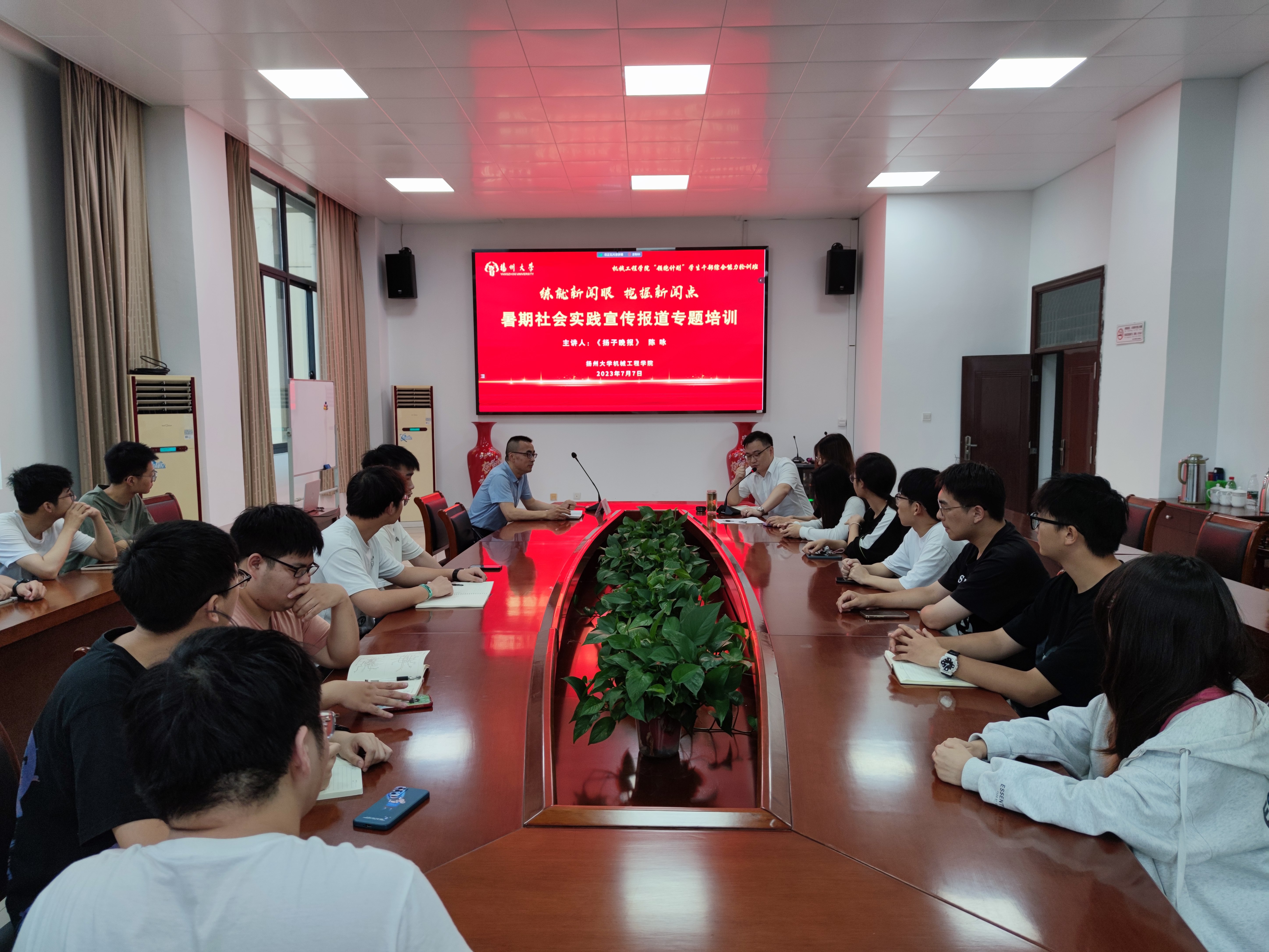 7月7日下午,我院与力行楼S318会议室,举办“练就新闻眼,挖据新闻点”——暑期社会实践宣传报道专题培训讲座。本场讲座邀请了《扬子晚报》资深记者、扬州市新闻工作者协会常务理事陈咏老师主讲。学院团委书记汪志国主持讲座,学院各学生组织学生代表、暑期社会实践重点团队成员代表参加讲座。