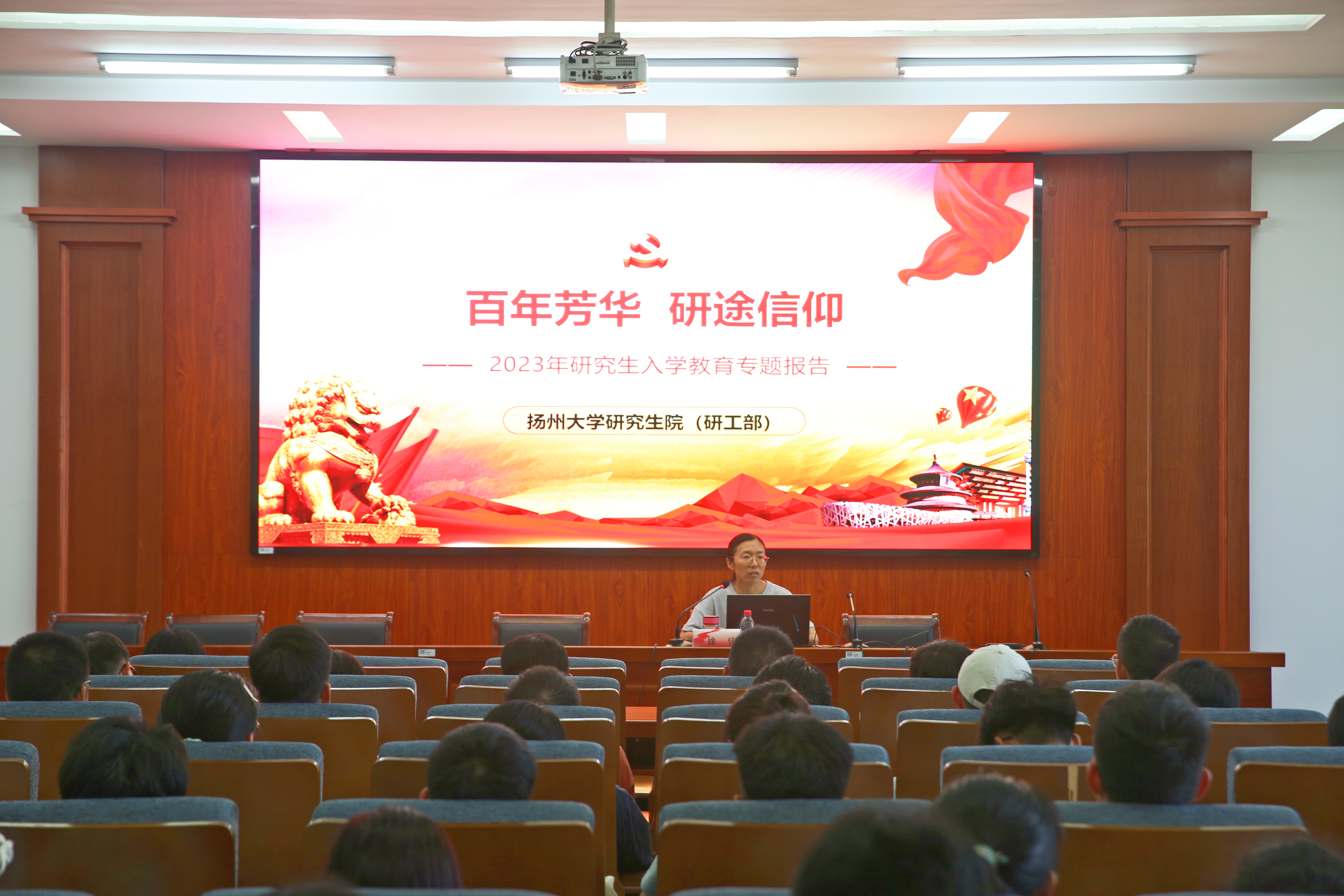 2023年9月6日下午,我院在力行楼401报告厅举办了主题为“百年芳华,研途信仰”的研究生党课。本次党课由扬州大学研工部研究生思想教育科科长徐佳主讲,研究生辅导员郭敏主持,2023级研究生新生参加了此次党课。
