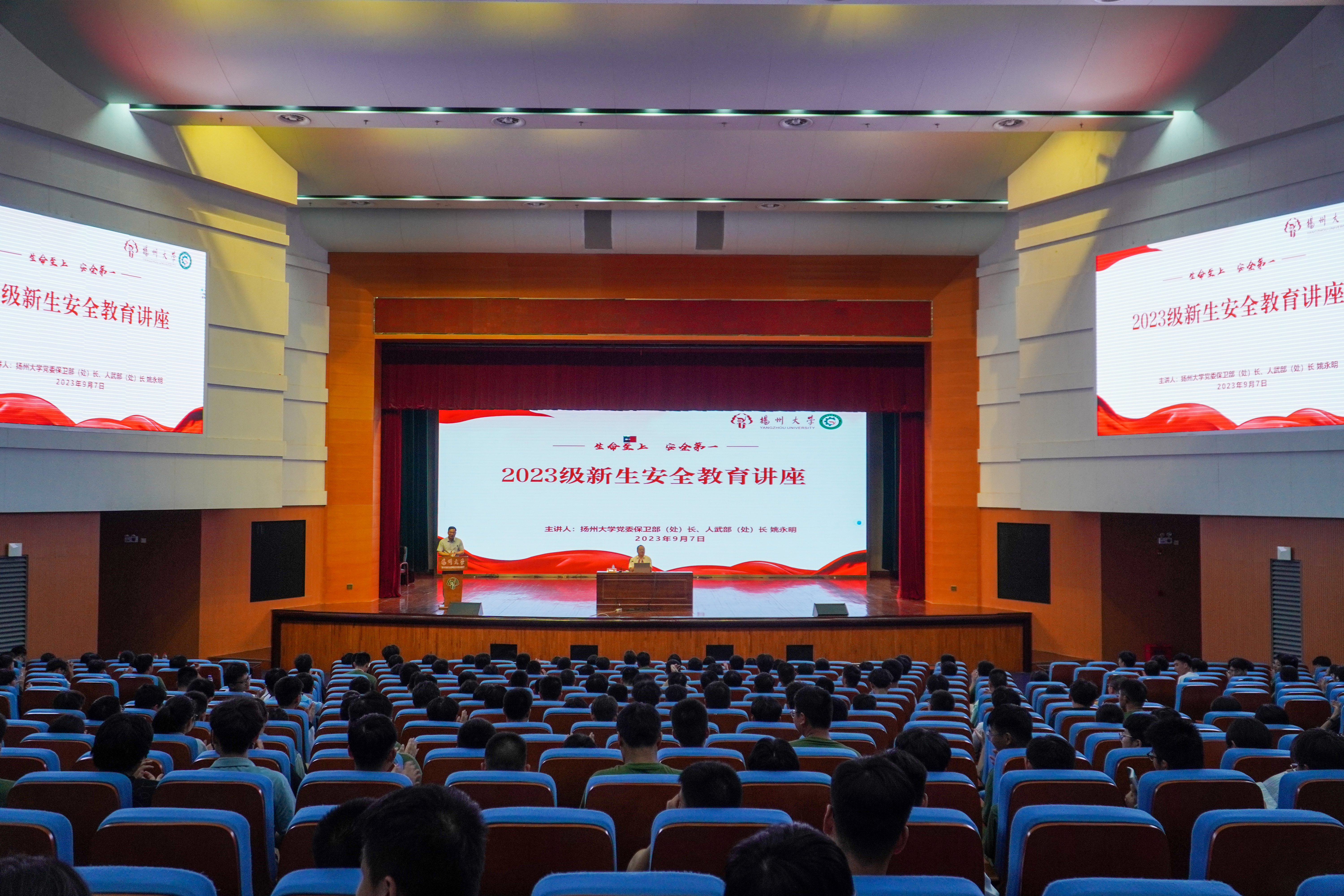 9月7日晚,我院在文体馆3楼小剧场举行了2023级新生安全教育讲座。讲座由扬州大学党委保卫部(处)长、人武部(处)长姚永明主讲,院党委副书记毕亮主持。
