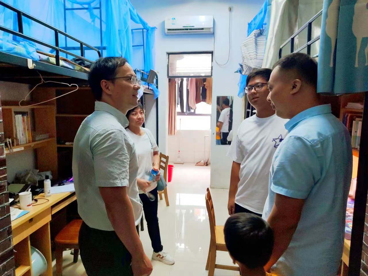 紧接着,毕亮副书记一行前往学生公寓区,为宿舍管理员和留校学生送上中秋节的祝福,并对宿舍管理员一直以来对我院同学的关怀和照顾表示衷心感谢。毕亮副书记向宿舍管理员表达了对他们辛勤工作的崇高敬意,并送去了中秋真挚祝福。随后,毕亮副书记前往学生宿舍,慰问留校的同学们。在宿舍里,他与同学们亲切交谈,结合自己的大学经历,分享了一些学习和生活上的经验和建议,希望同学们能拥有一个充实饱满的大学生活。