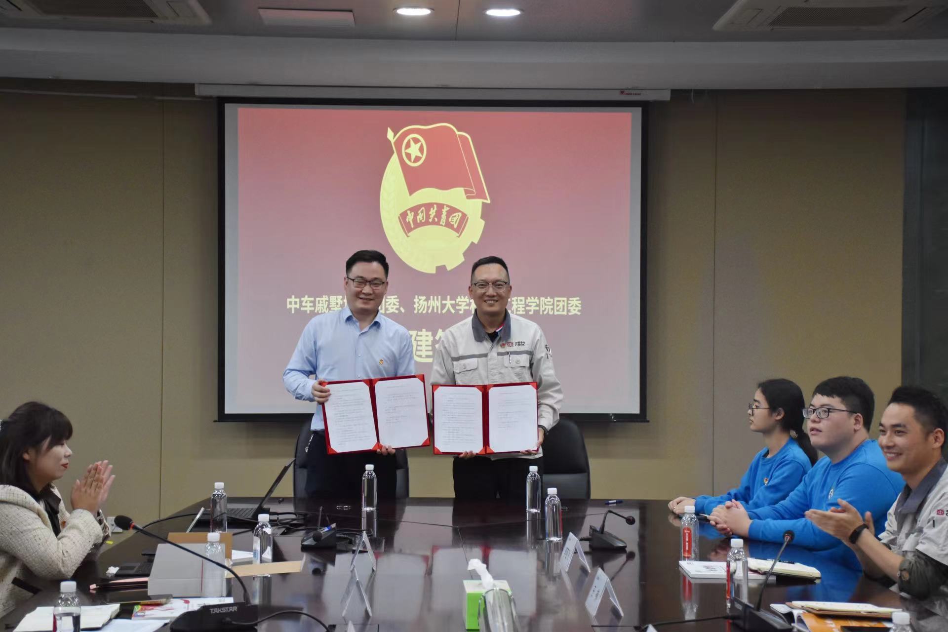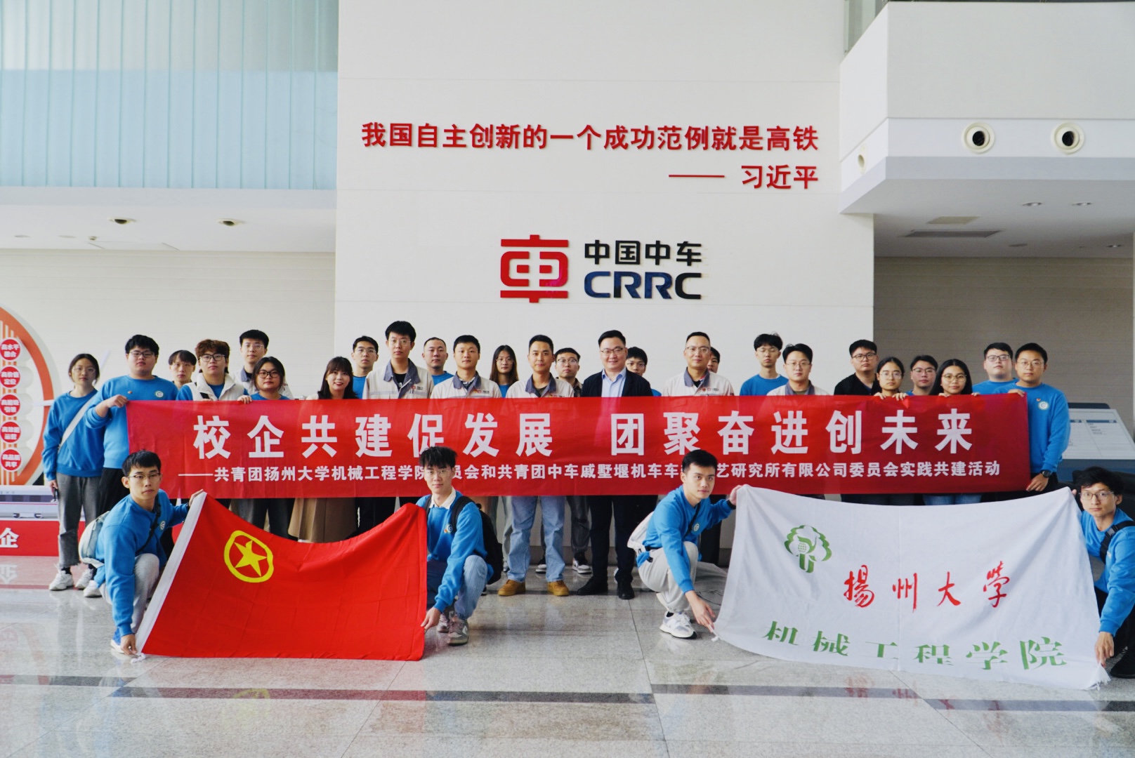 2023年10月13日上午,我院团委书记汪志国、团委副书记苏慧、辅导员宋凯、各学生组织主要干部、学生代表以及即将入职中车戚墅堰的五名研本学生,从扬州出发前往常州中车戚墅堰机车车辆工艺研究所有限公司,开展扬州大学机械工程学院团委与车戚墅堰机车车辆工艺研究所有限公司团委实践共建活动,活动中进行了参观访学,团委共建协议签署仪式以及扬州大学机械工程学院实践育人基地的揭牌仪式。