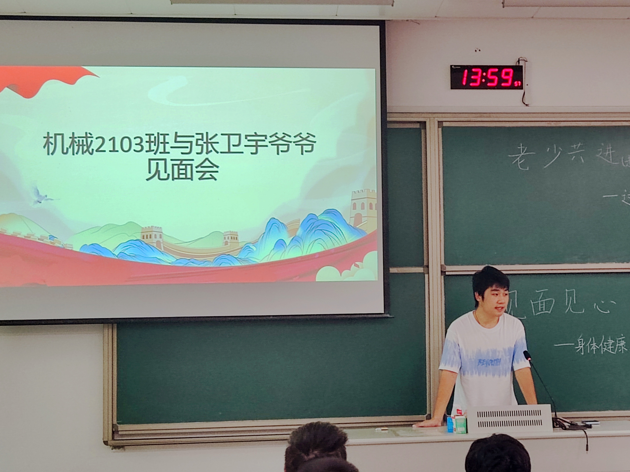 活动开始前,张卫宇老同志与机械2103班全体学生相互进行了自我介绍。在“老少共进(走进校友宗顺留中将)——过去与未来”活动中,张爷爷向机械2103班介绍了校友宗顺留中将的传奇经历,希望同学们能够传承宗顺留中将脚踏实地、勤勤恳恳和无私奉献的精神。