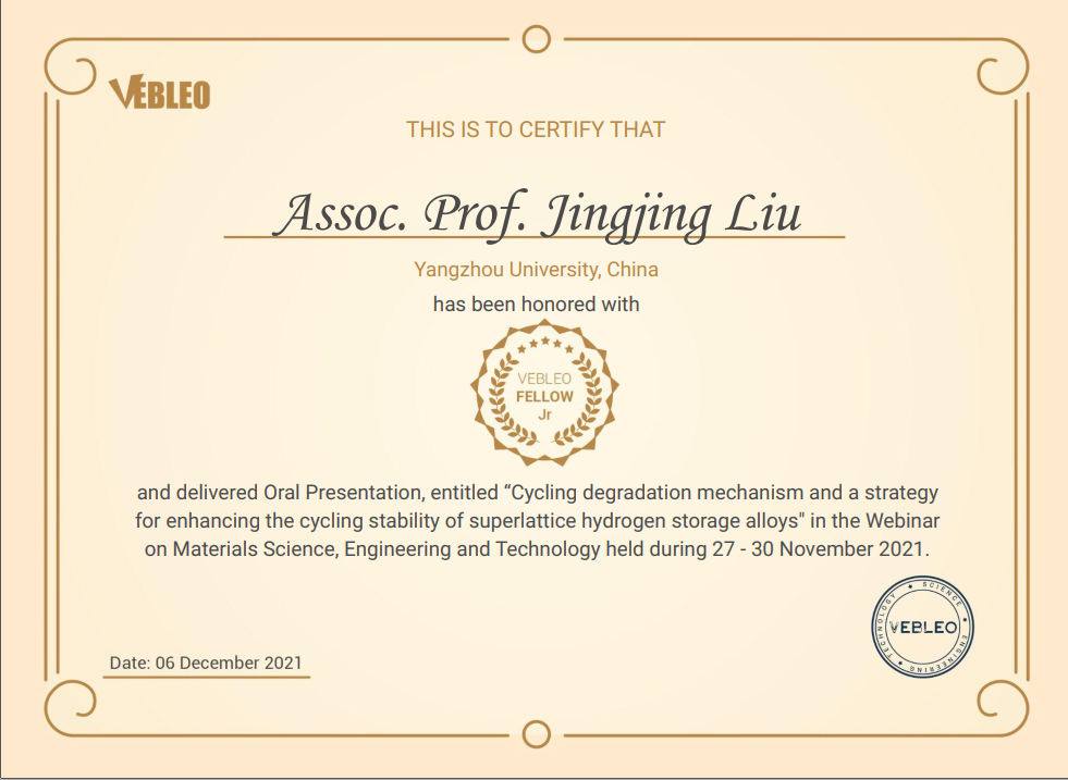 2021年12月6日,我院刘晶晶副教授被国际科学组织VEBLEO协会授予初级会士(VEBLEO FELLOW Jr),并受邀在VEBLEO主办的材料科学-工程-技术网络研讨会(Webinar on Materials Science, Engineering & Technology)中做了题为“Cycling Degradation Mechanism and a Strategy for Enhancing the Cycling Stability of Superlattice Hydrogen Storage Alloys”的报告。刘晶晶副教授介绍了她及其所在团队在储氢材料及器件的研究和研发方面做出的学术贡献,特别介绍了近年来关于超晶格储氢合金的容量衰减机理及相组成调控和微观结构改性的系列成果。